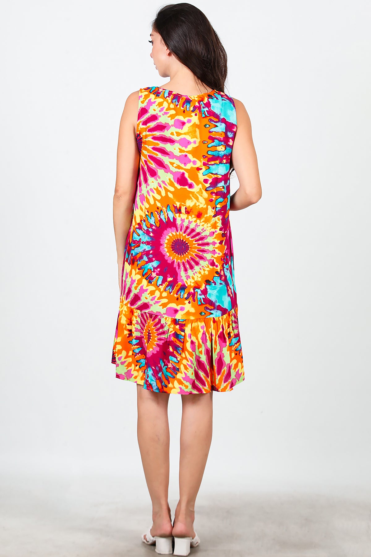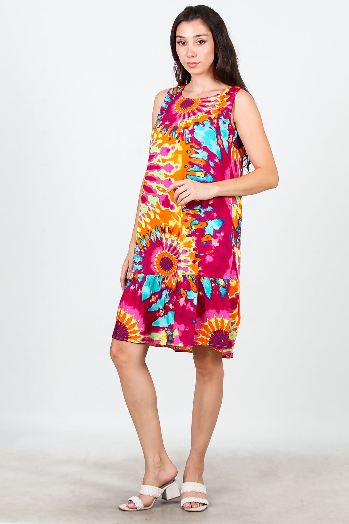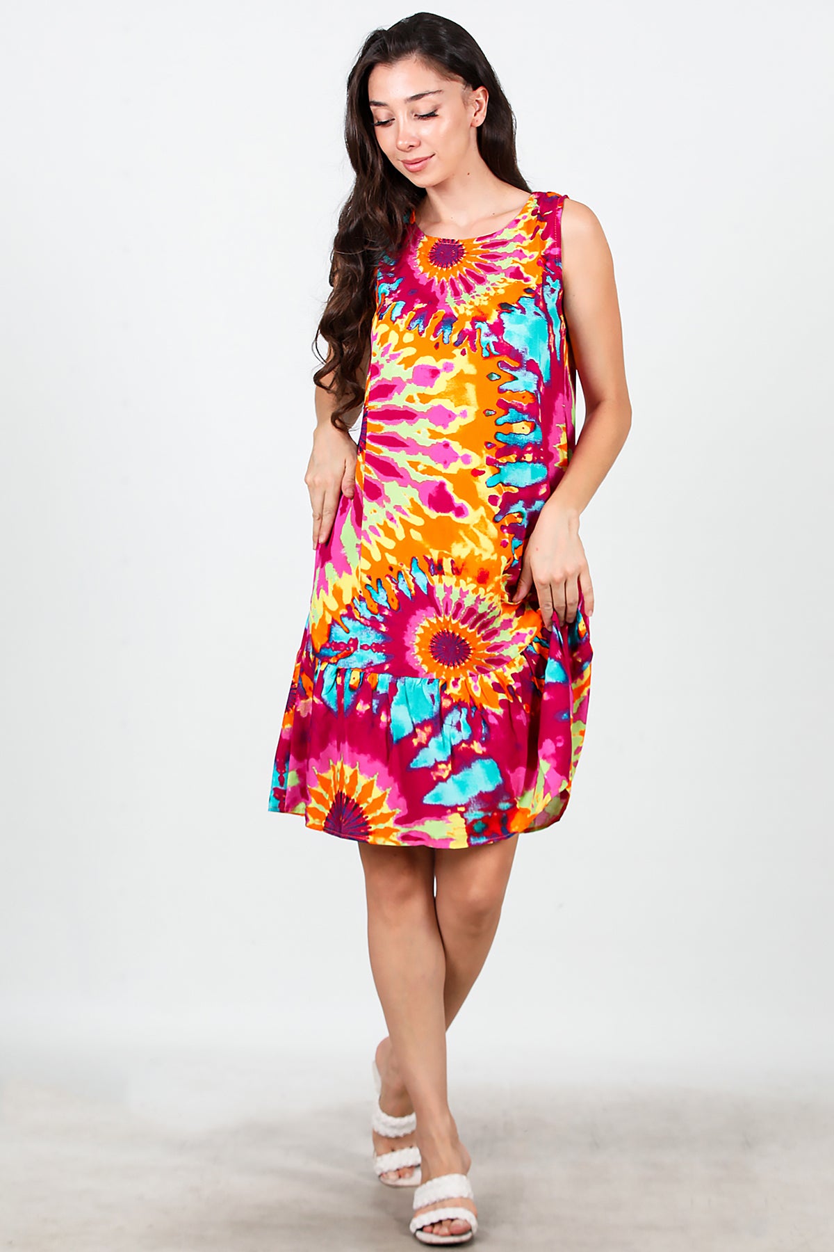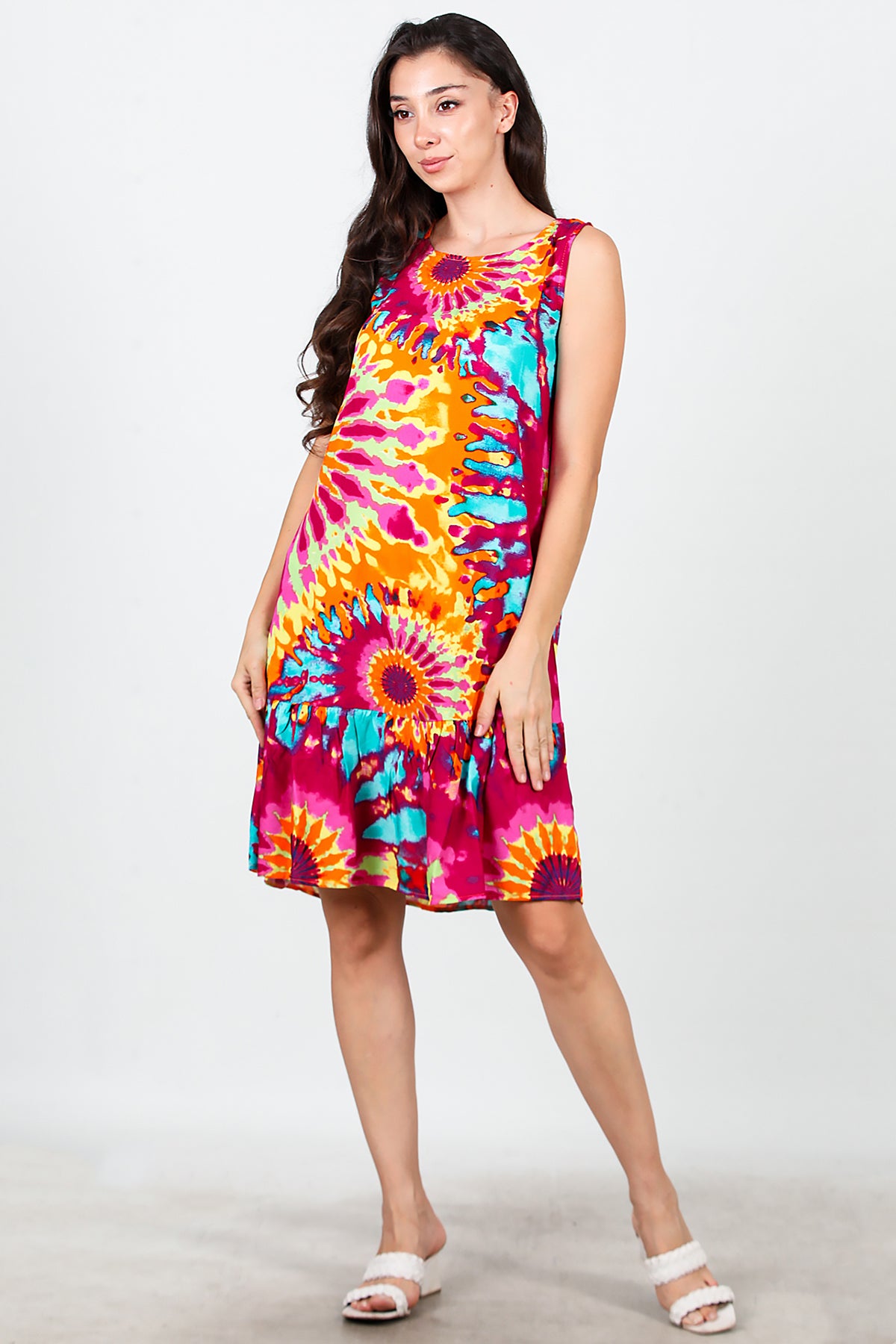 Kadın Desenli Viskon Kolsuz Elbise Fuşya