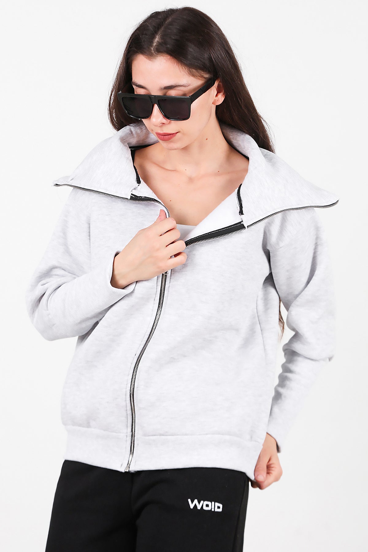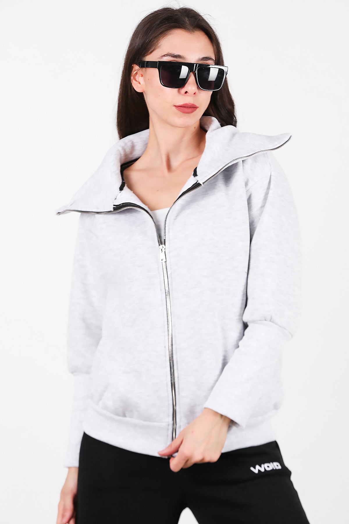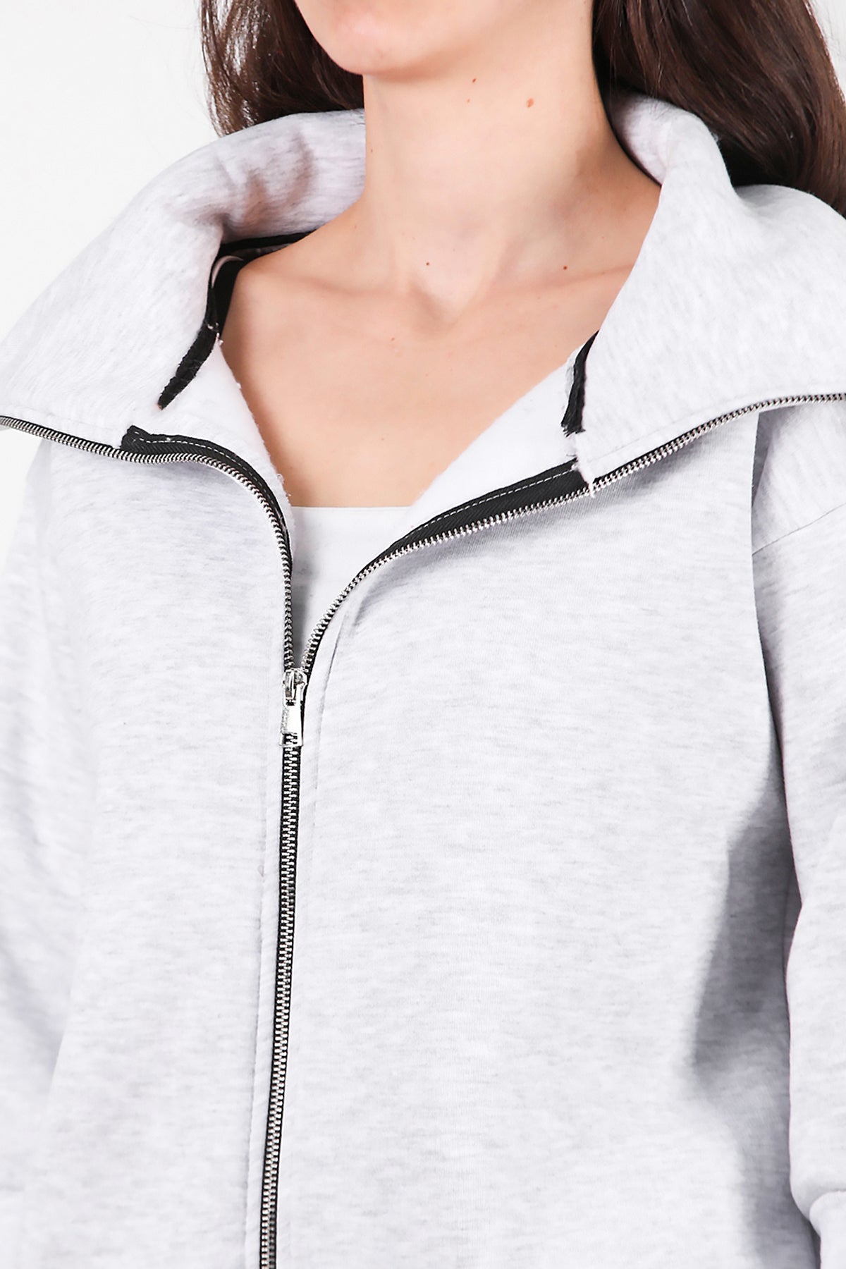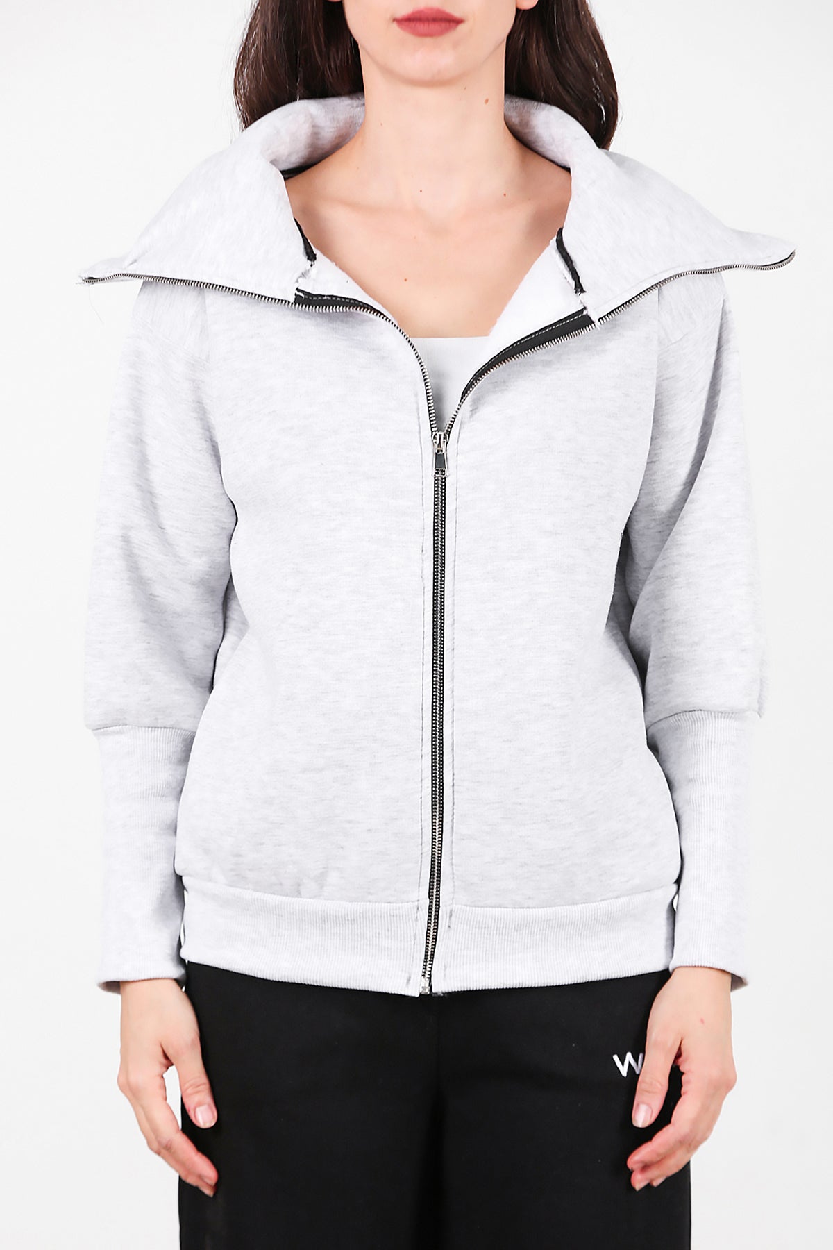 Kadın Dik Yaka Fermuarlı Sweat Gri