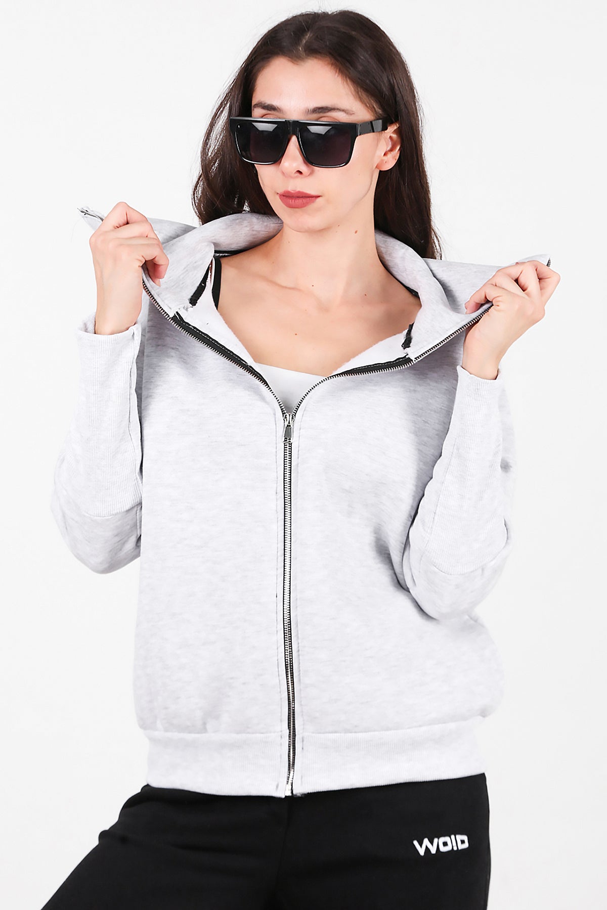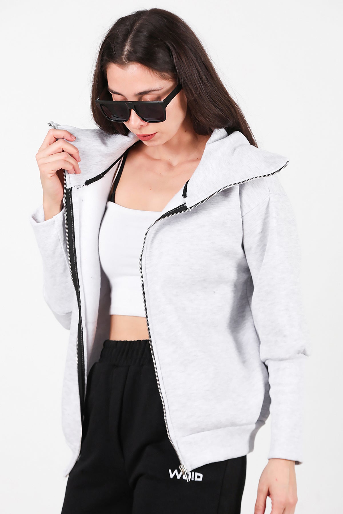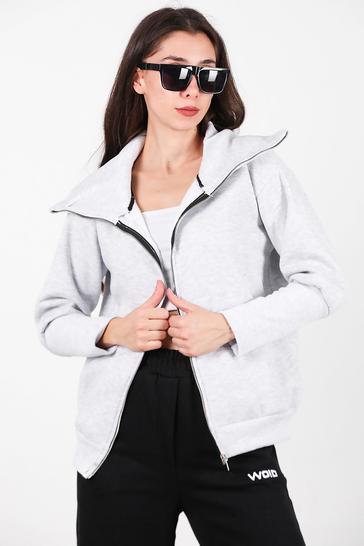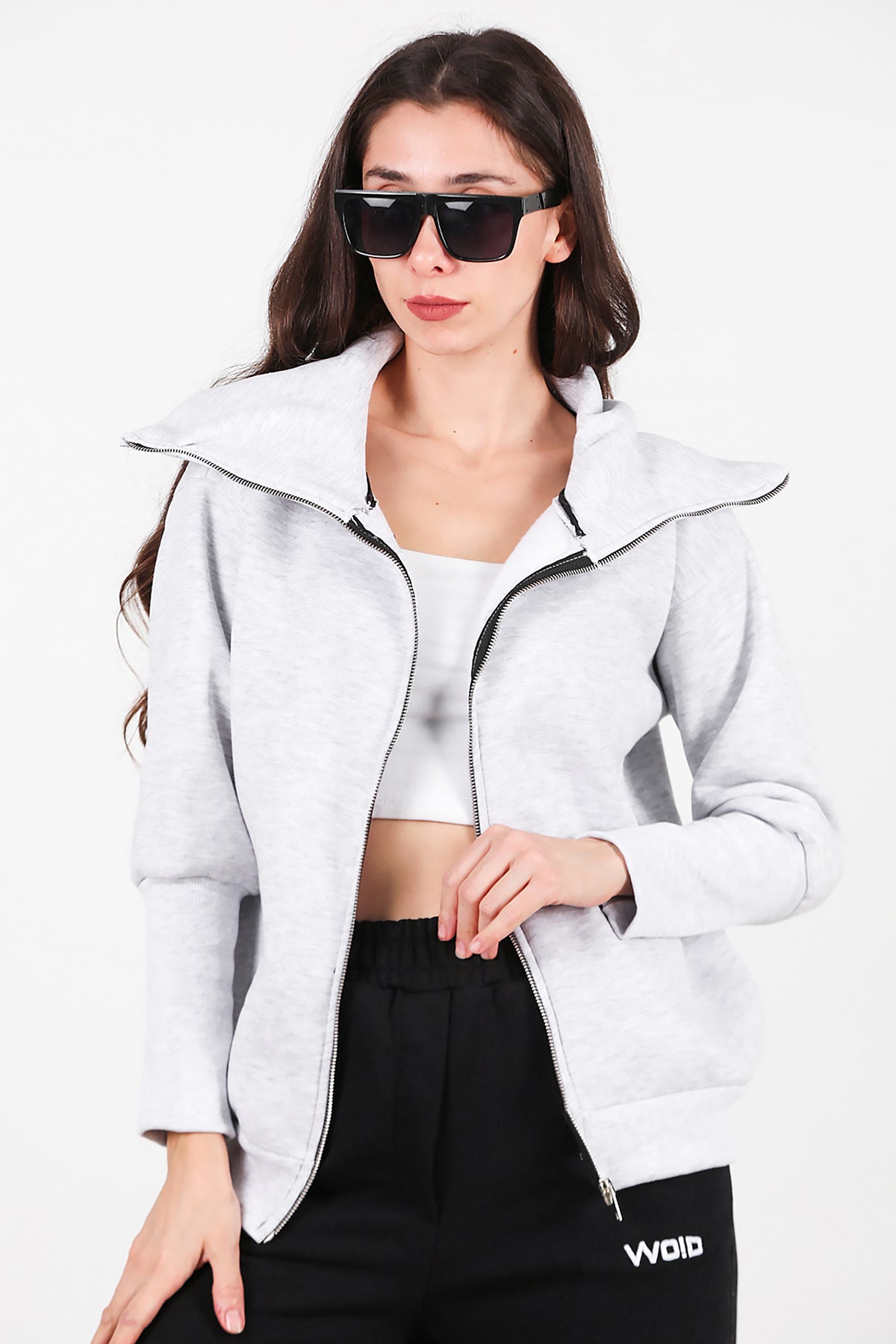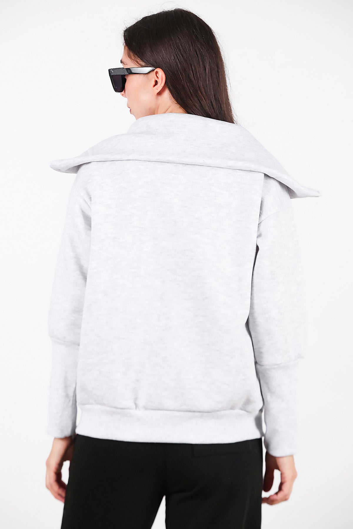 Kadın Dik Yaka Fermuarlı Sweat Gri