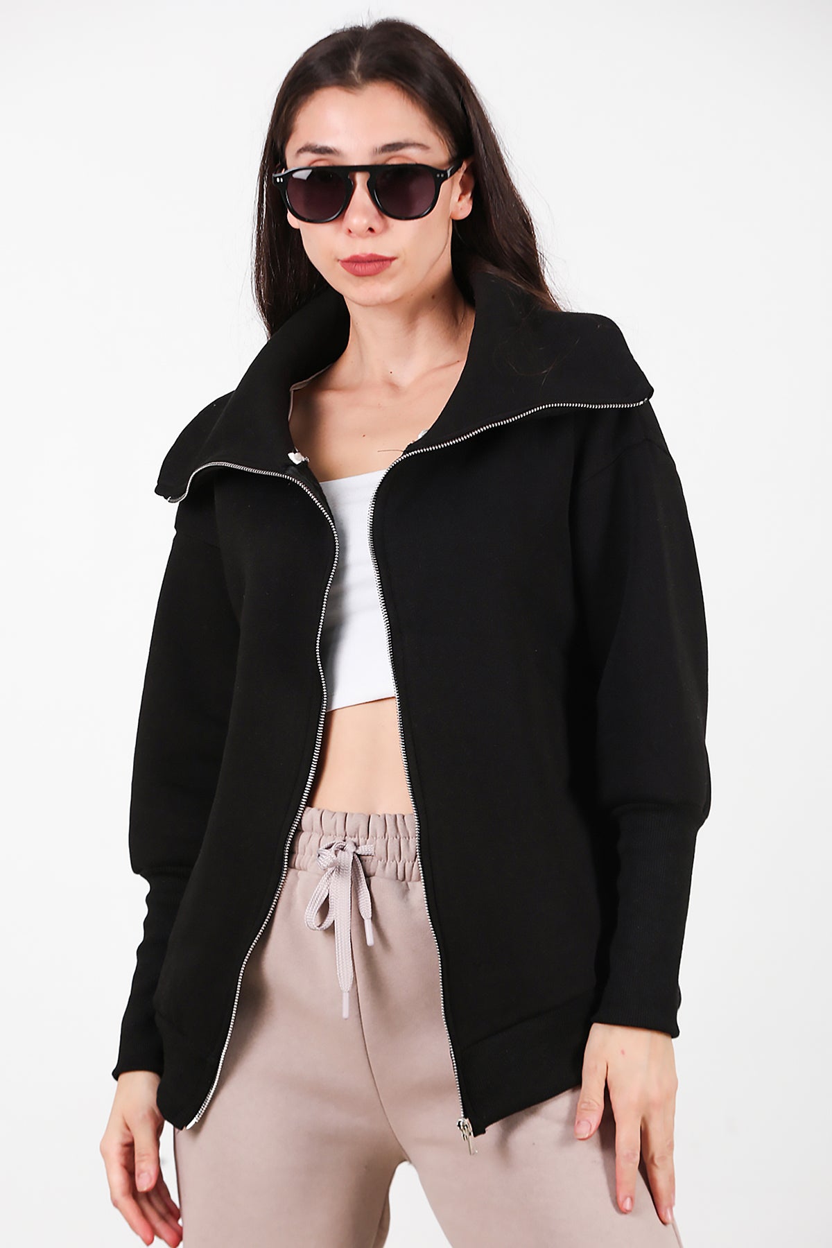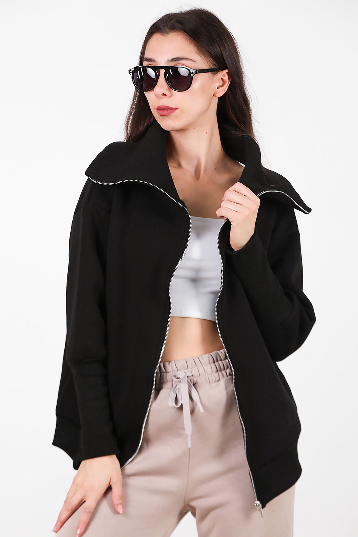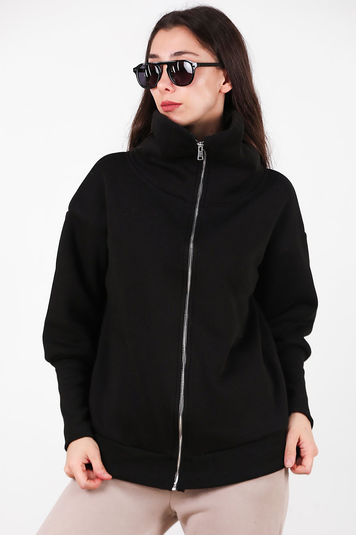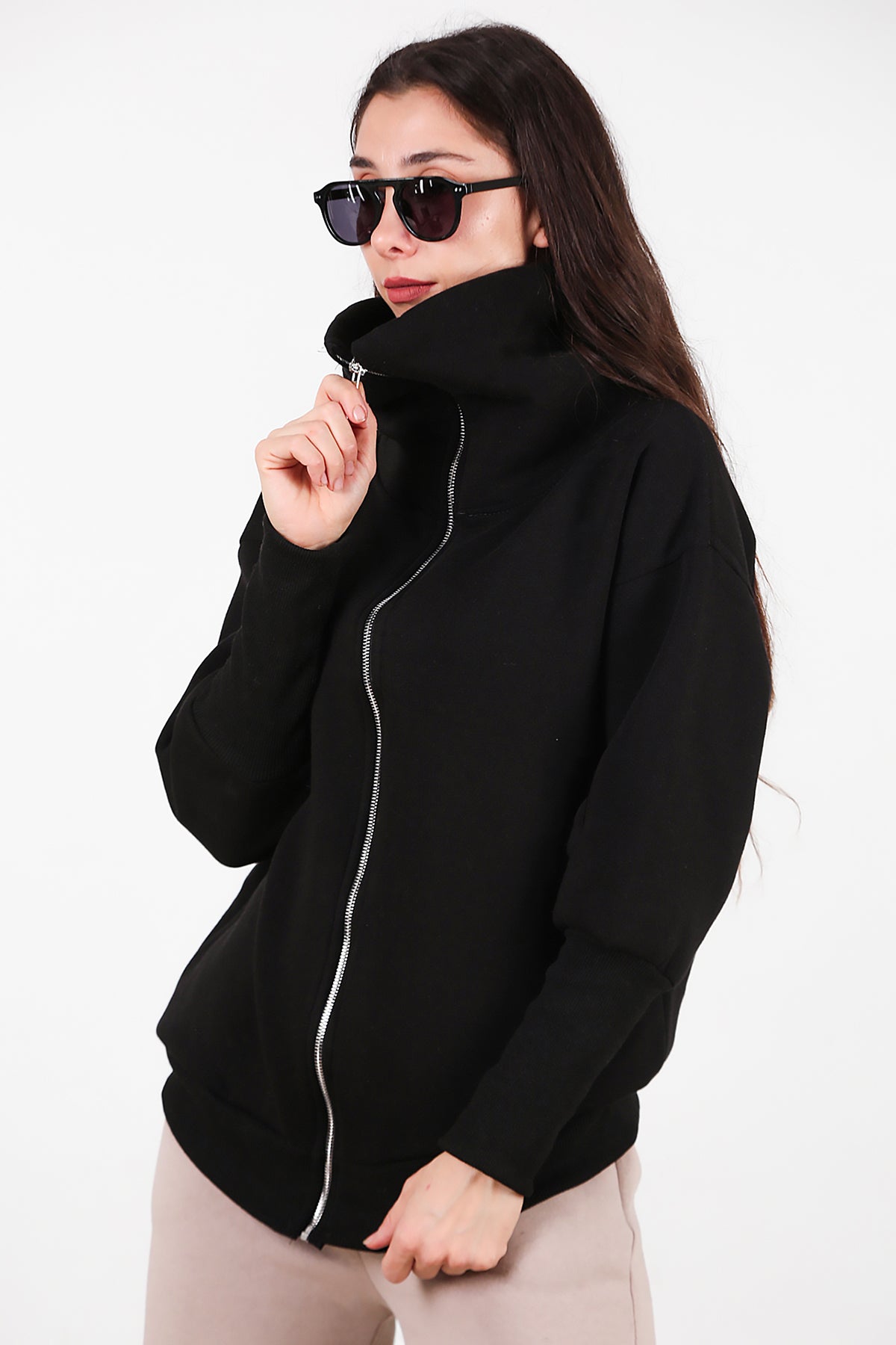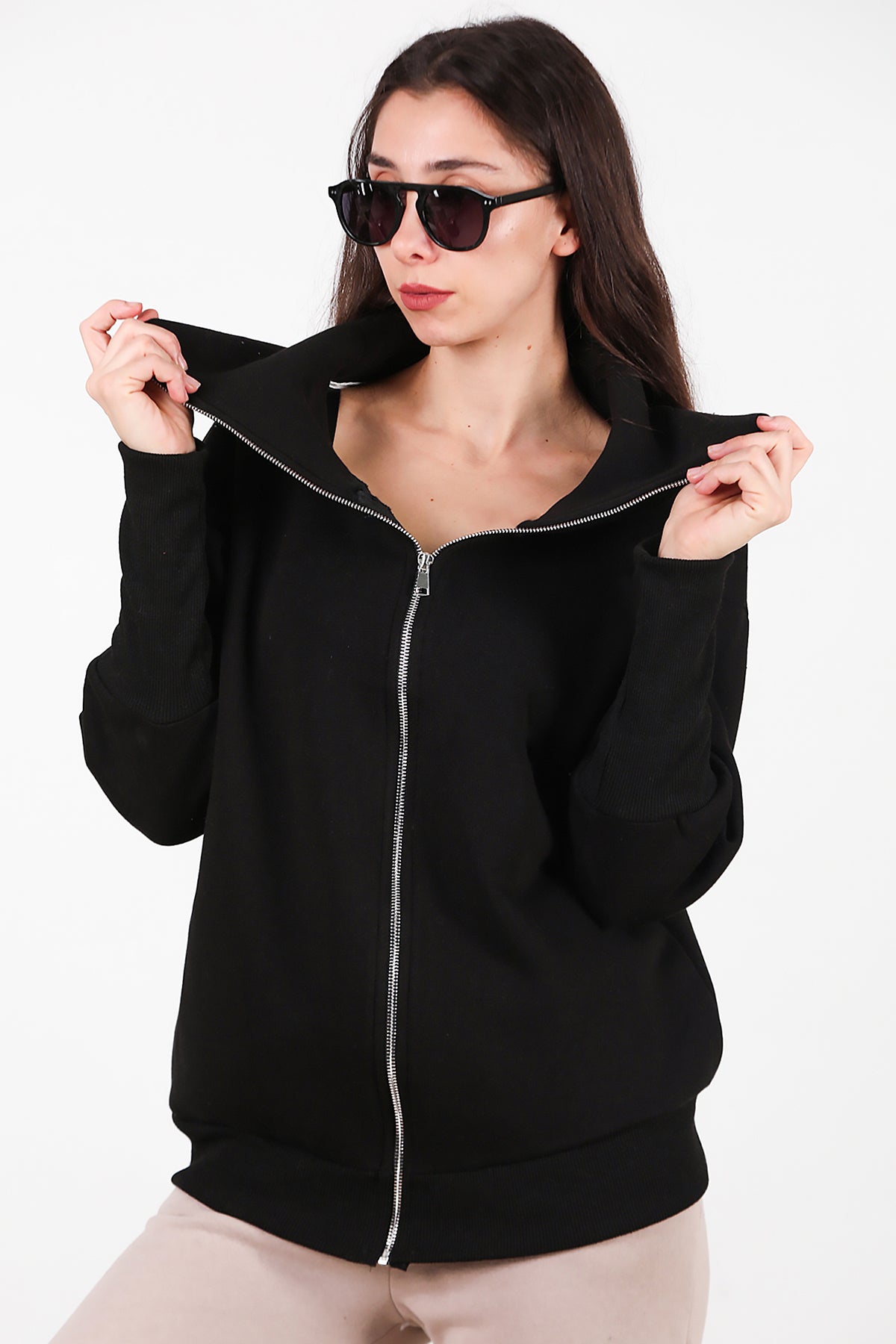 Kadın Dik Yaka Fermuarlı Sweat Siyah