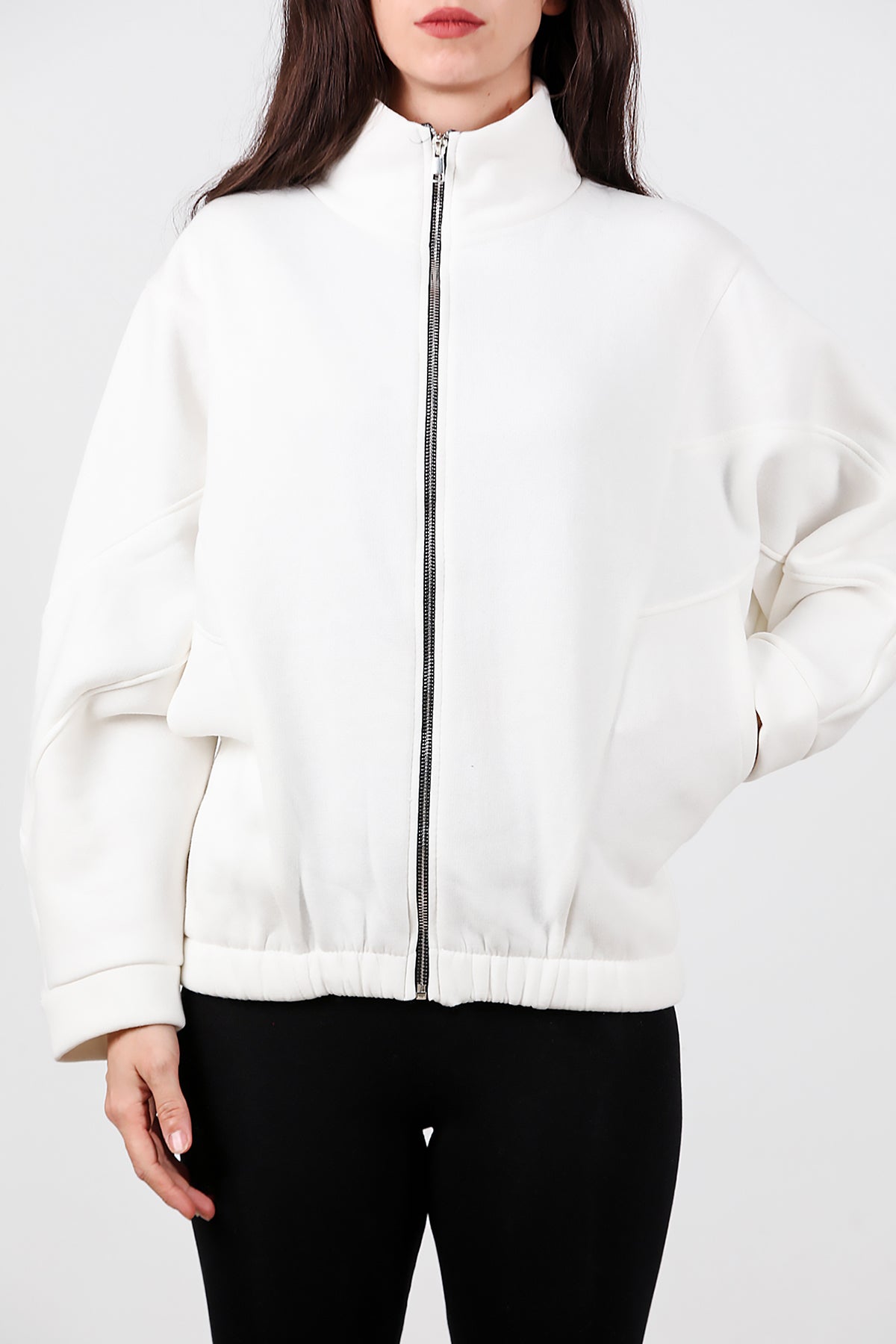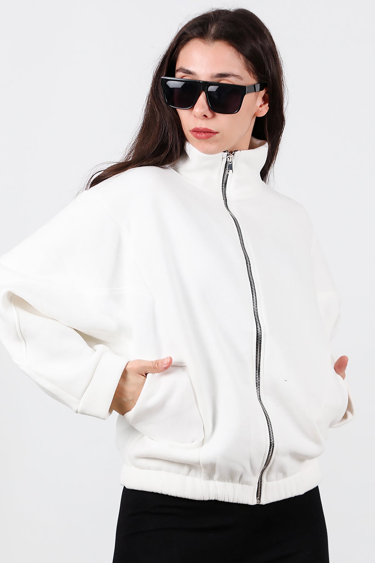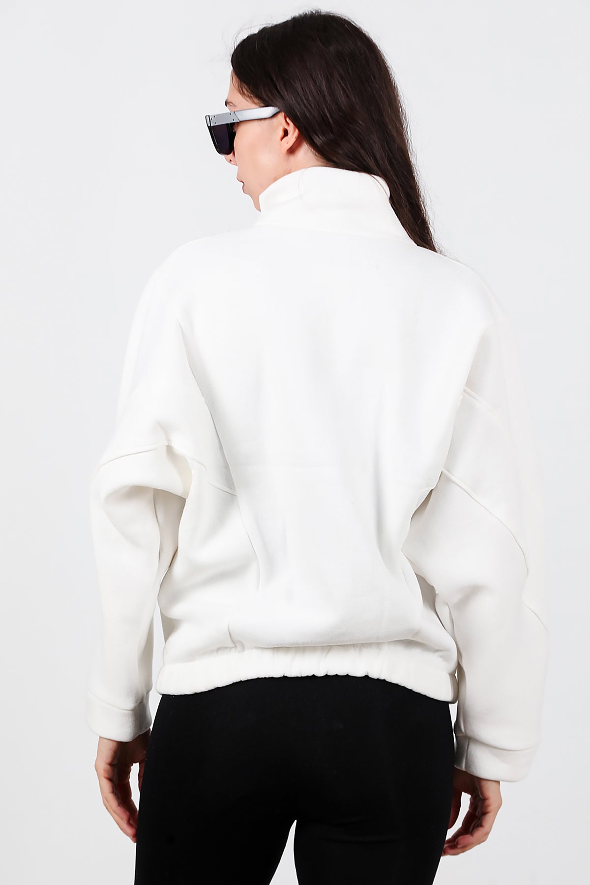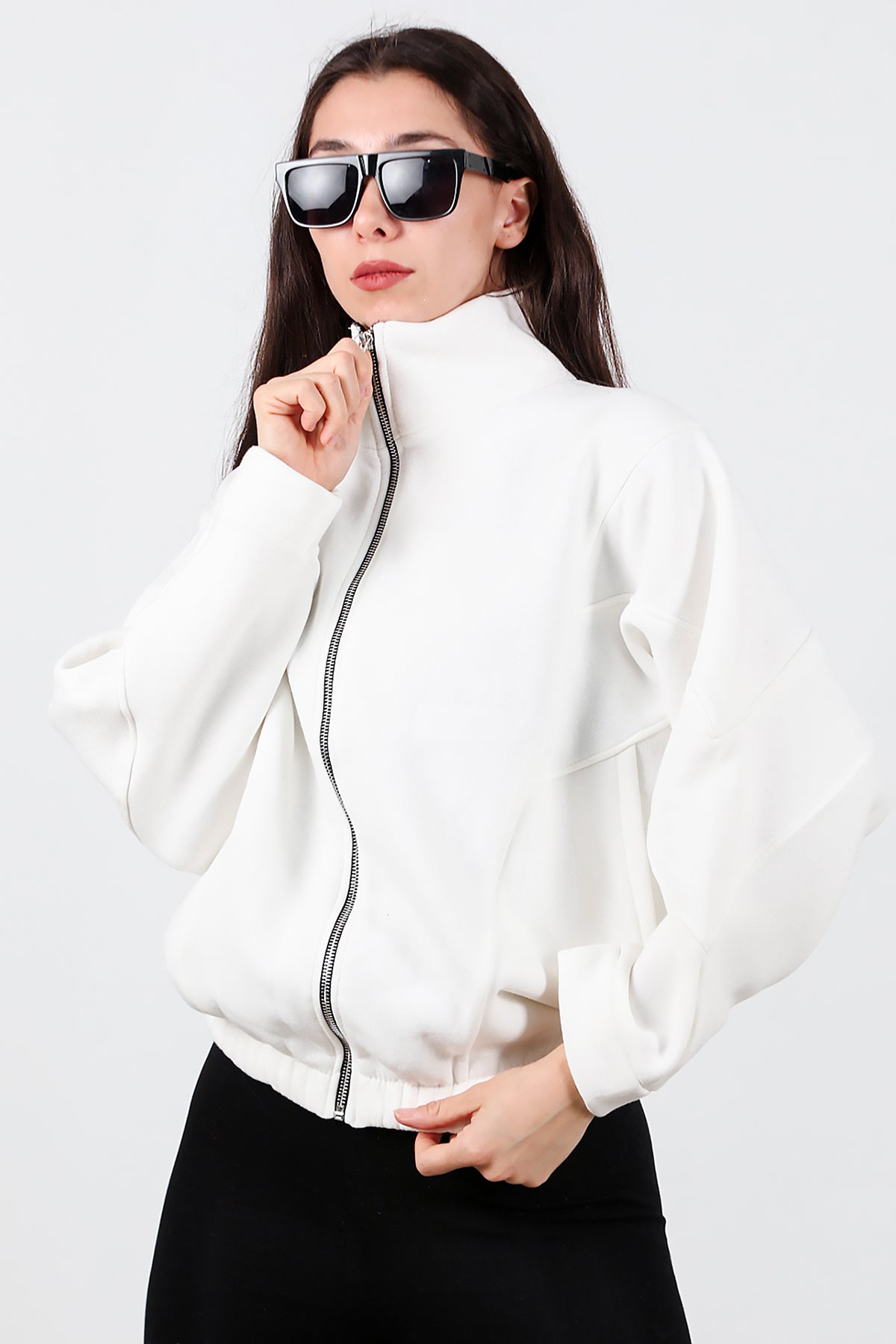 Kadın Dik Yaka Fermuarlı Sweat Beyaz