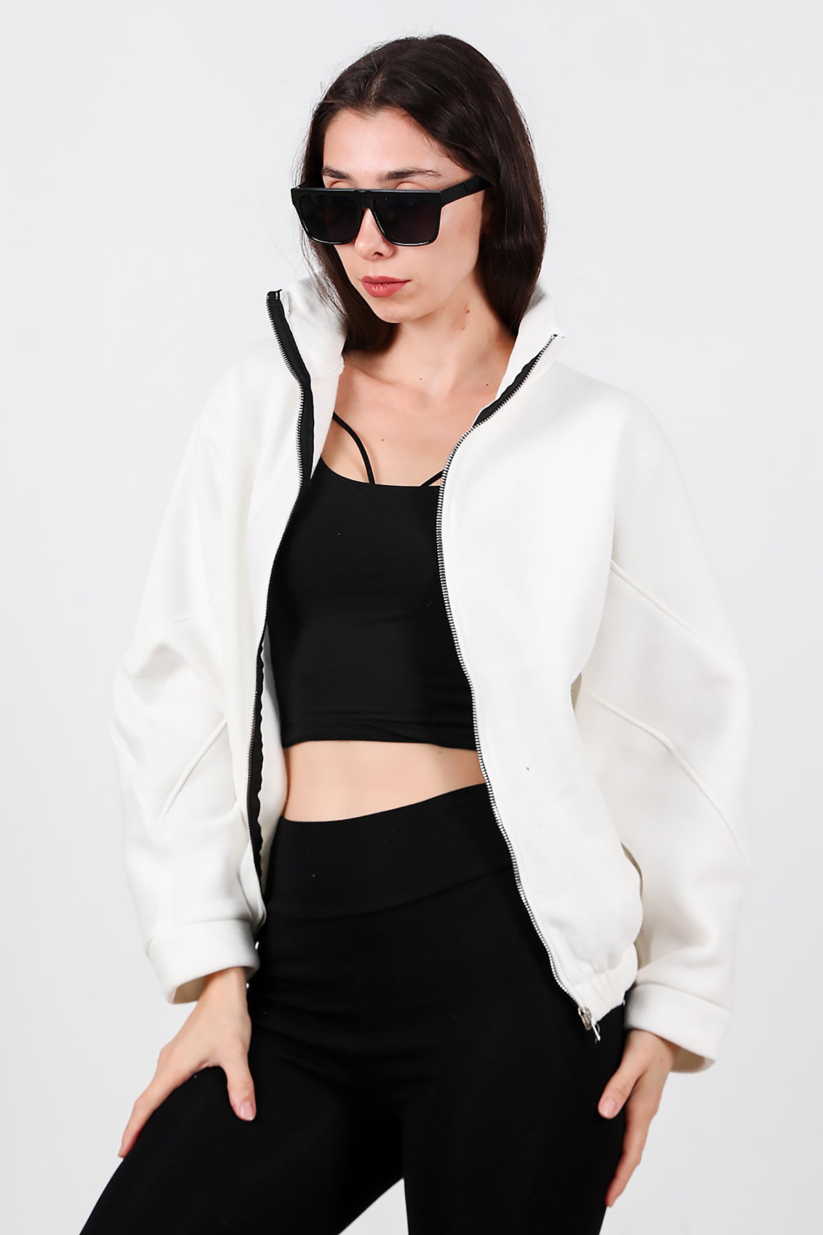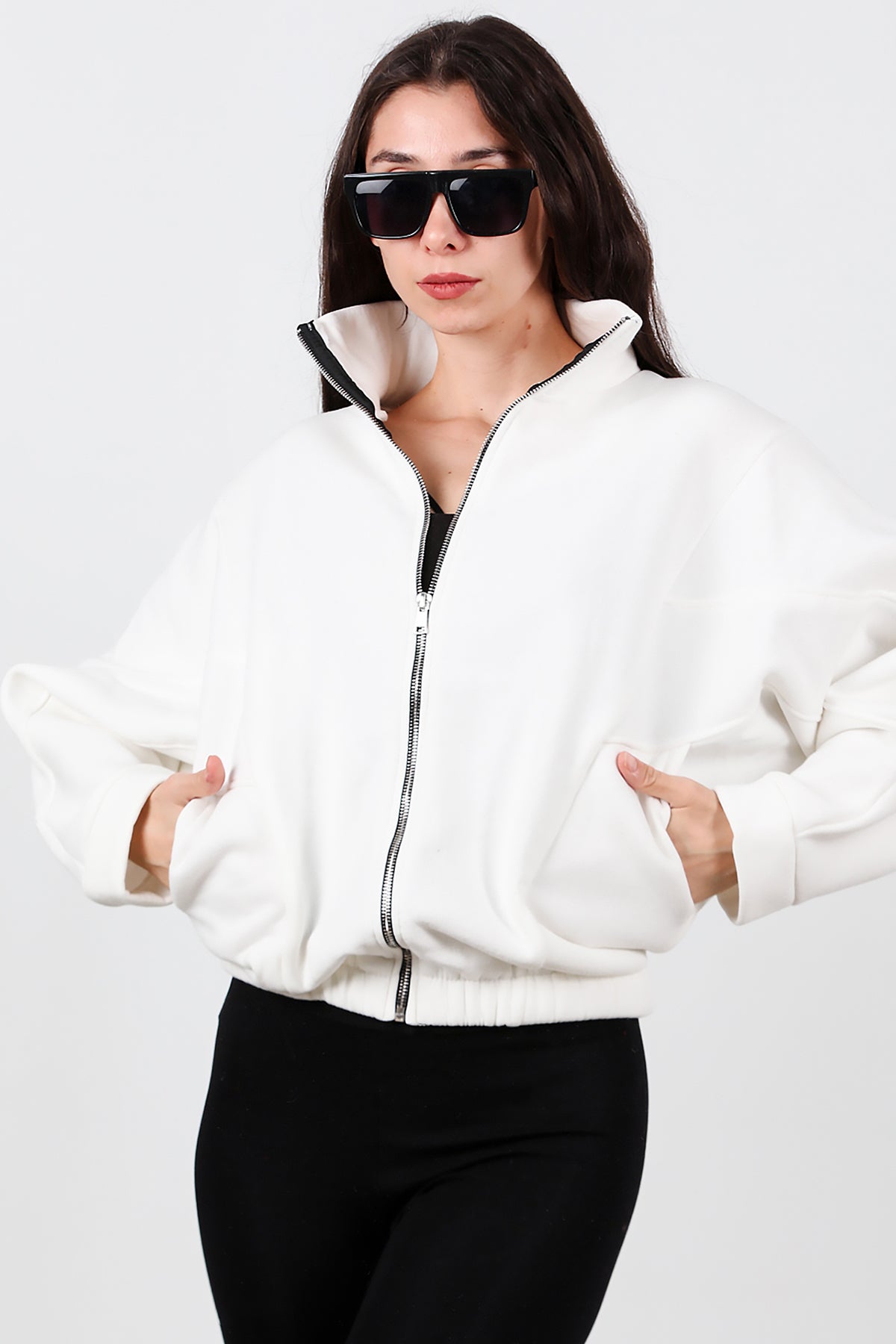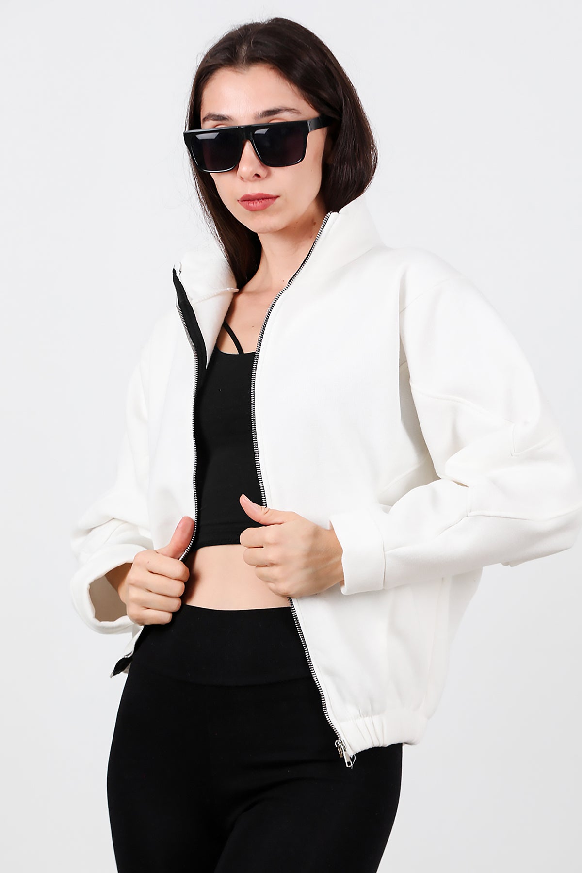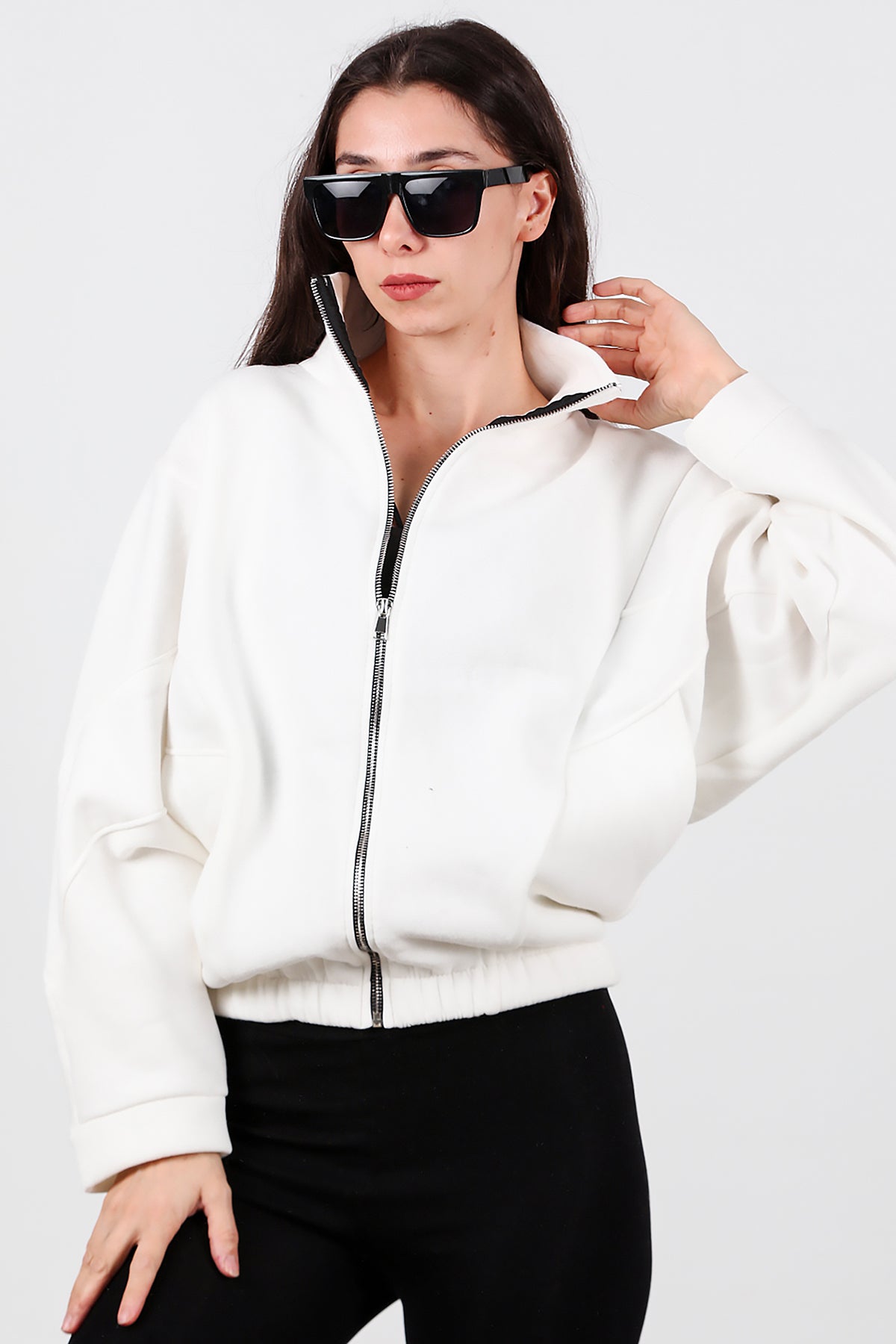 Kadın Dik Yaka Fermuarlı Sweat Beyaz