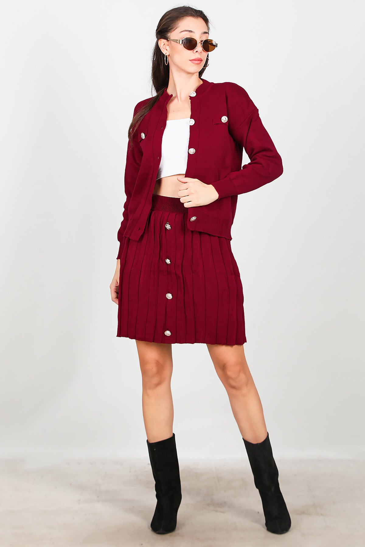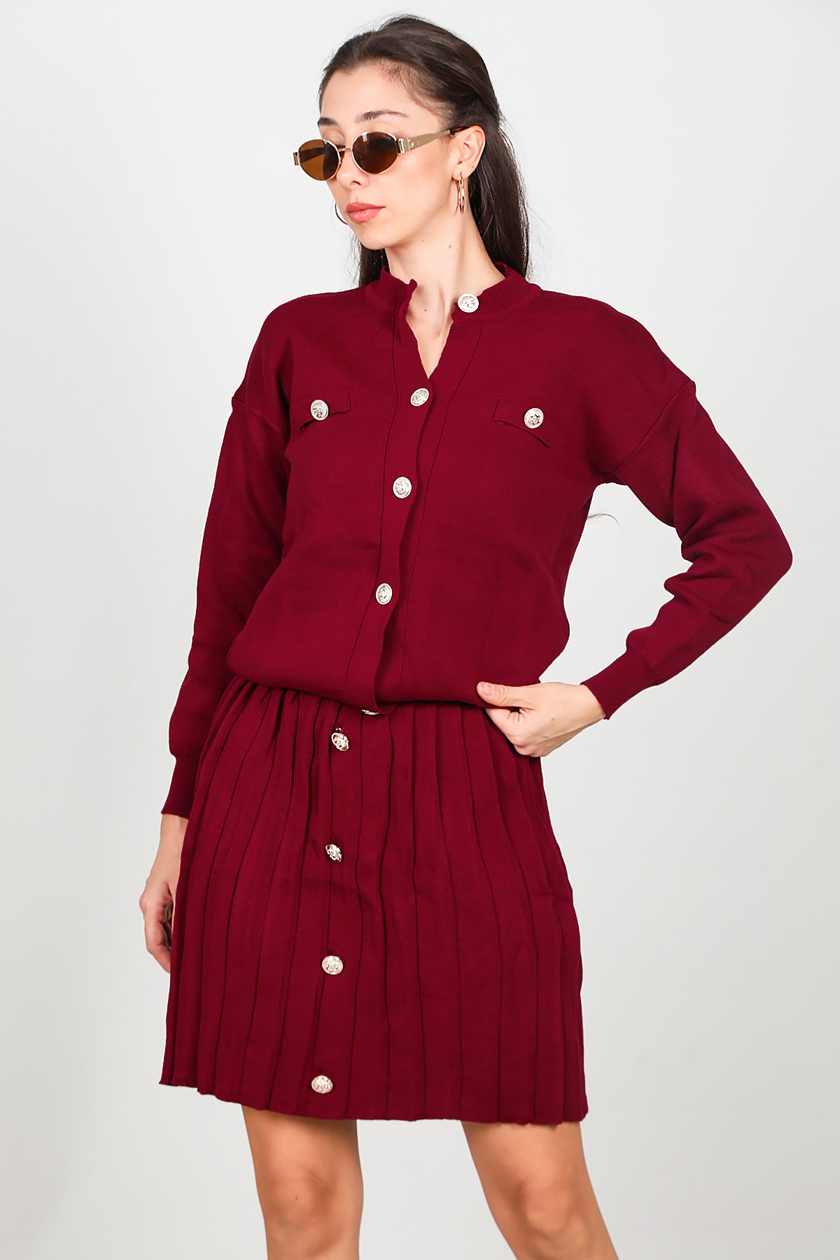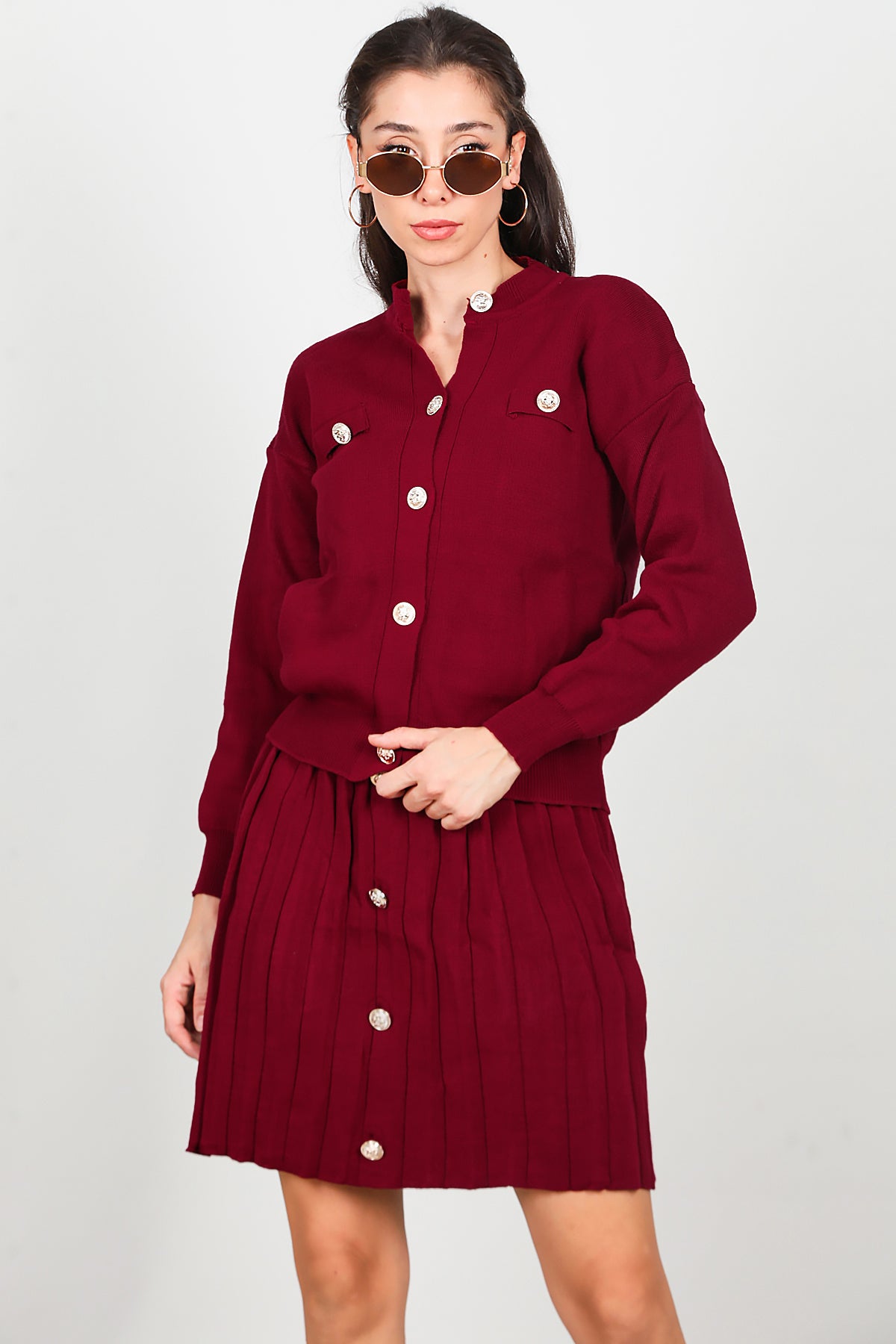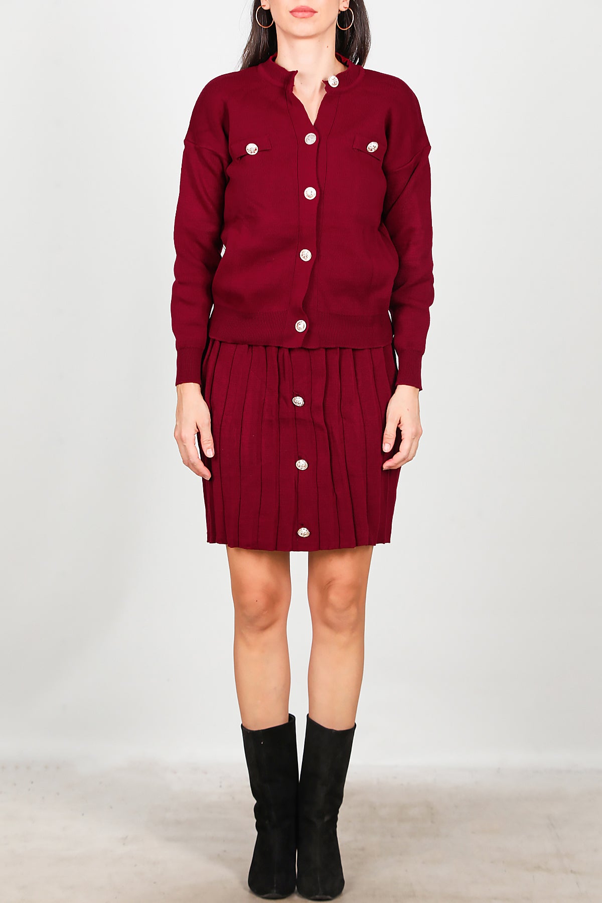 Kadın Düğmeli Etekli Triko Takım Bordo