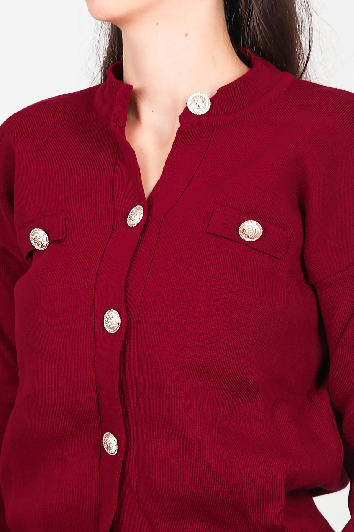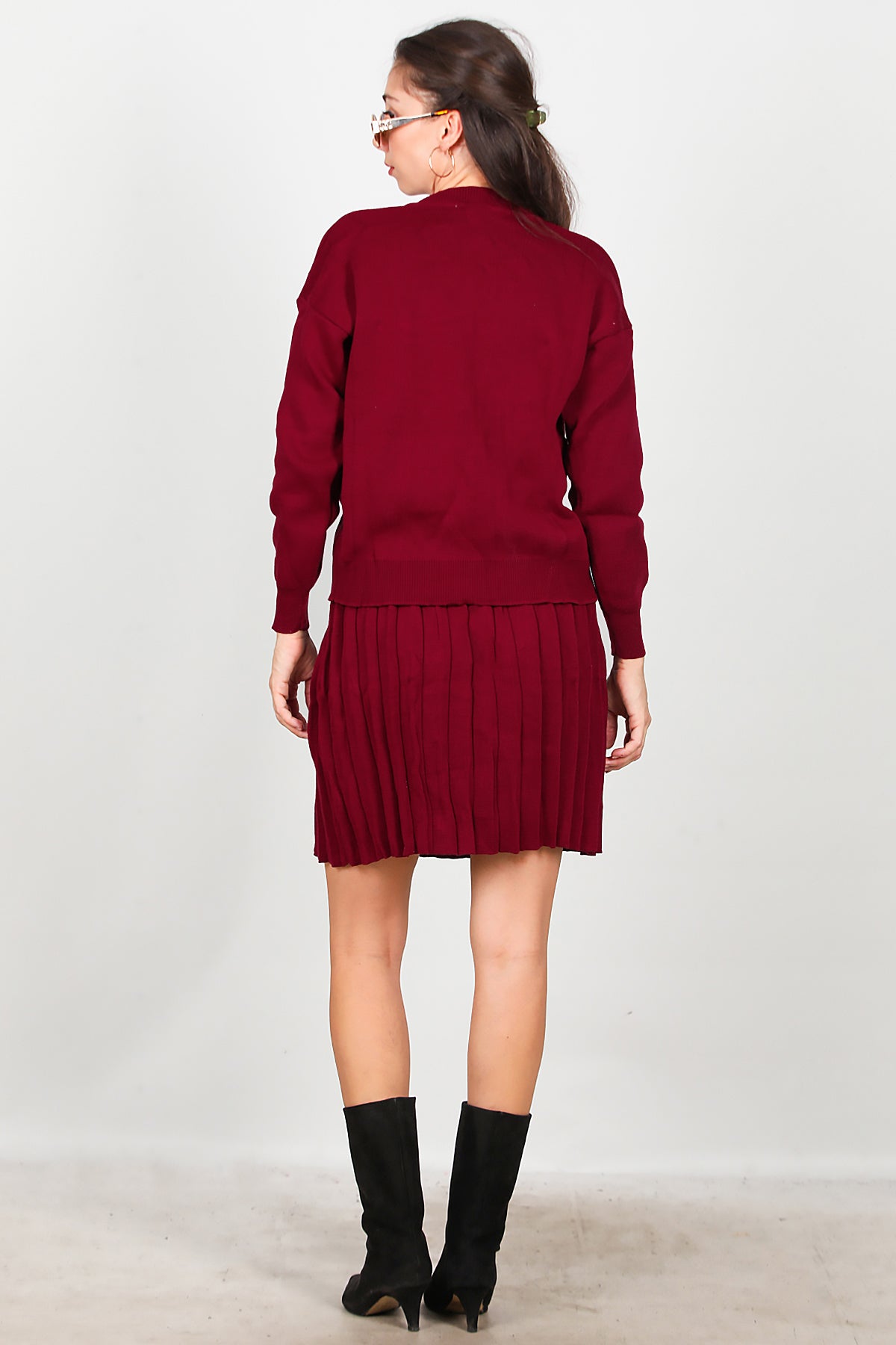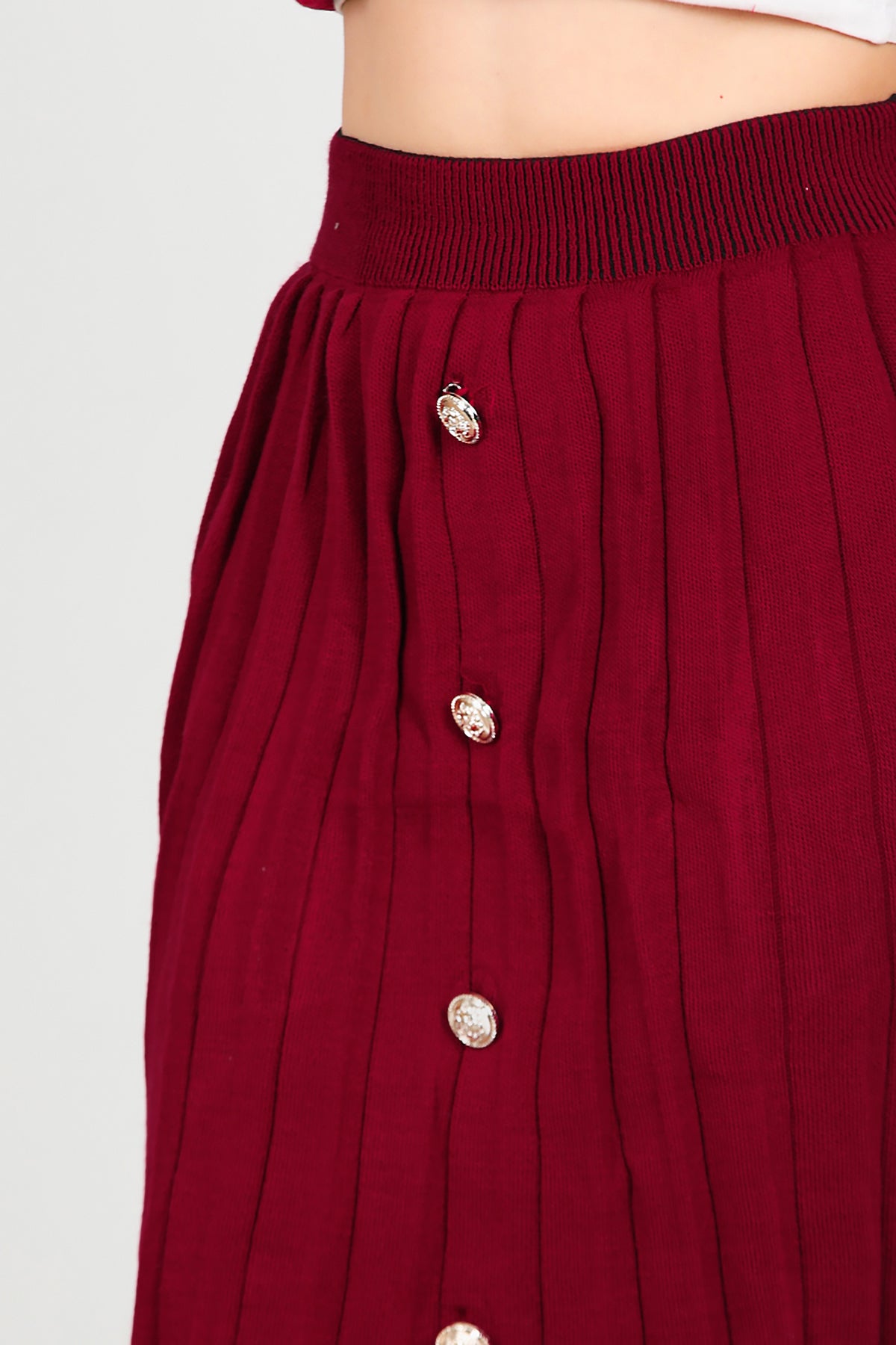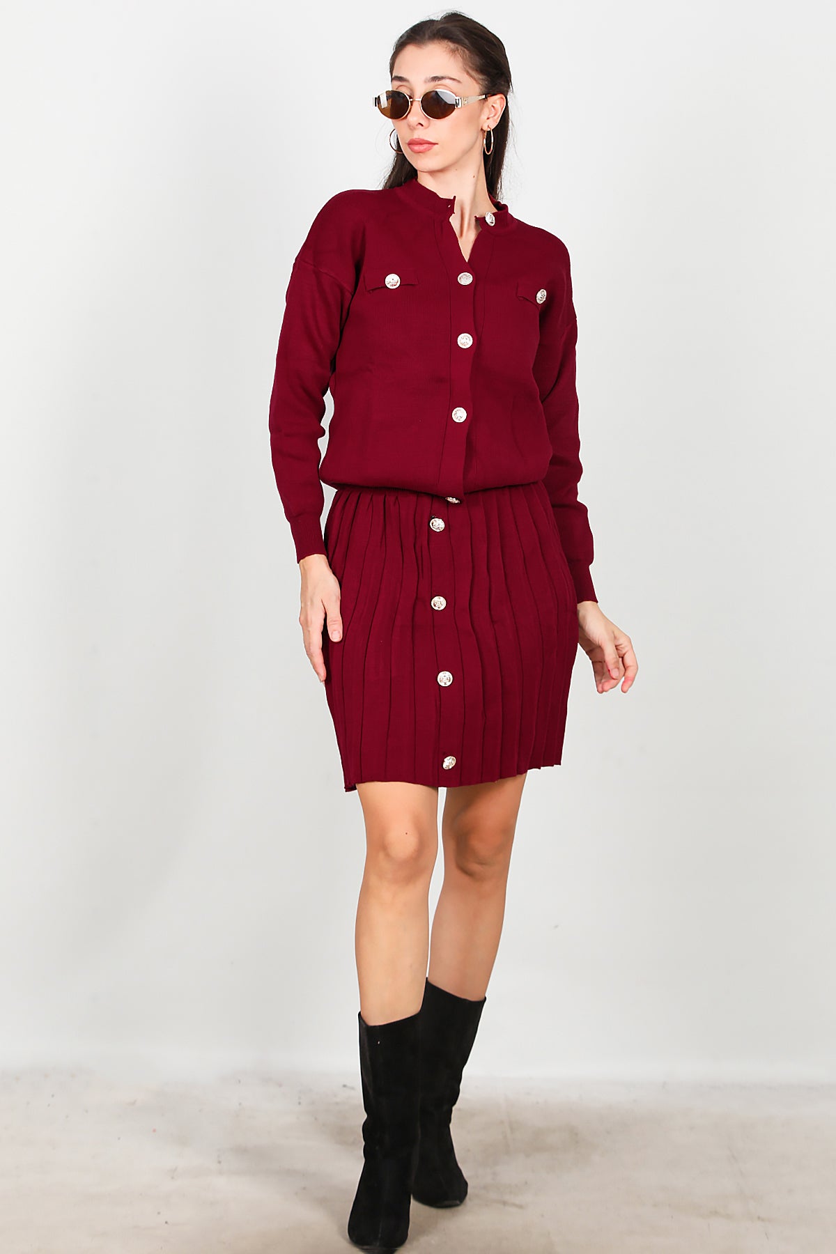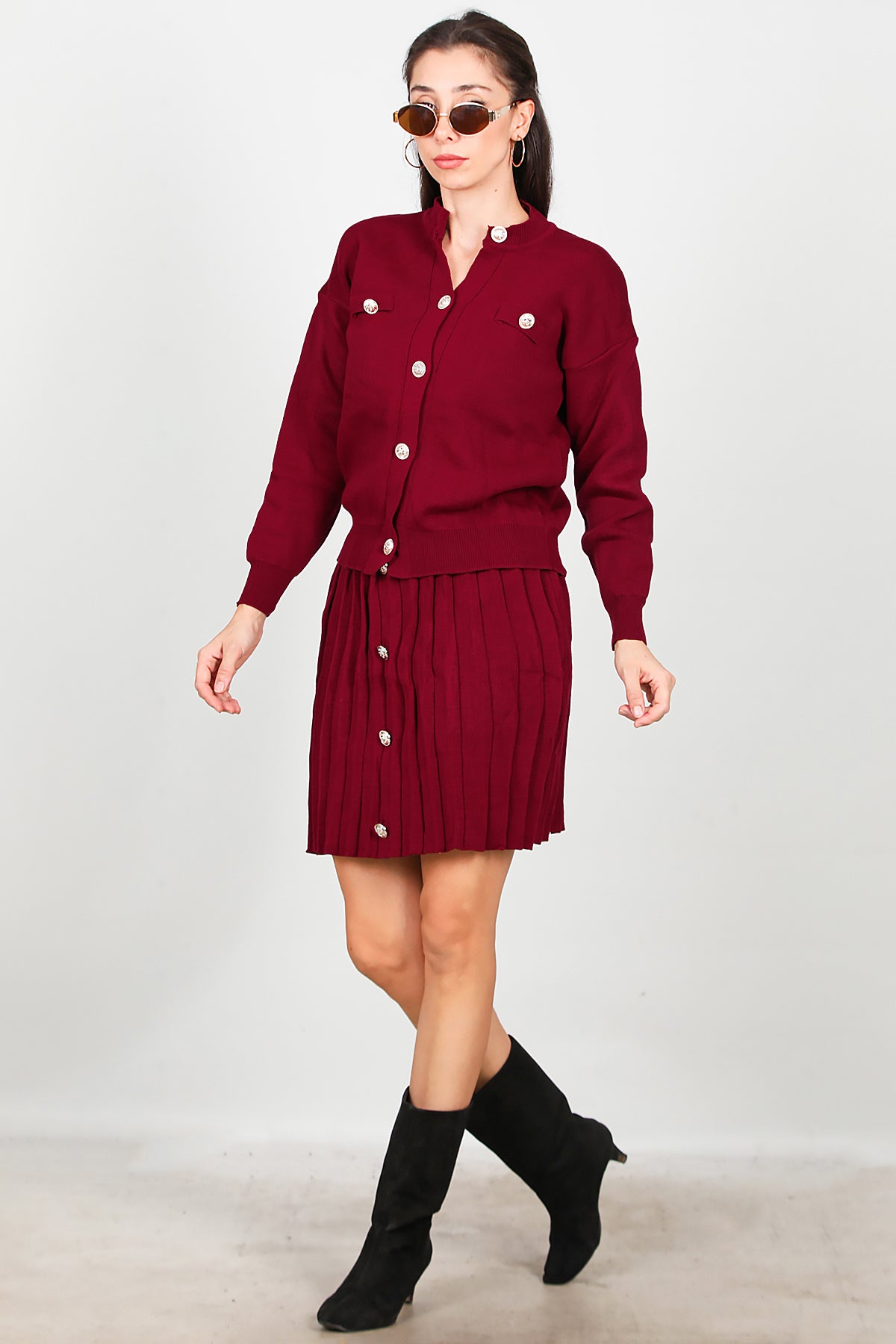 Kadın Düğmeli Etekli Triko Takım Bordo
