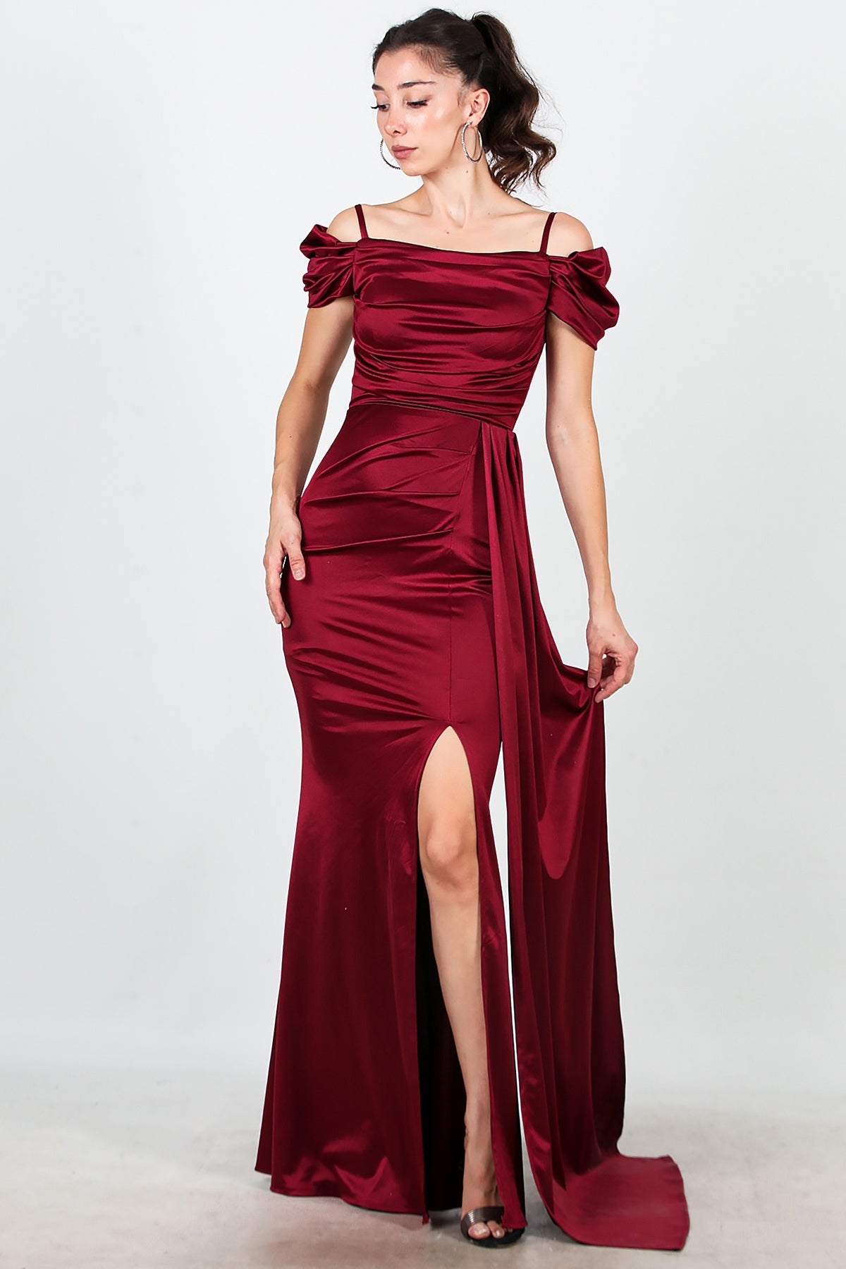 Kadın Düşük Omuz Saten Uzun Abiye Bordo