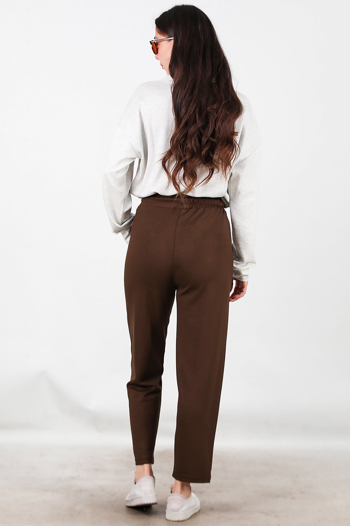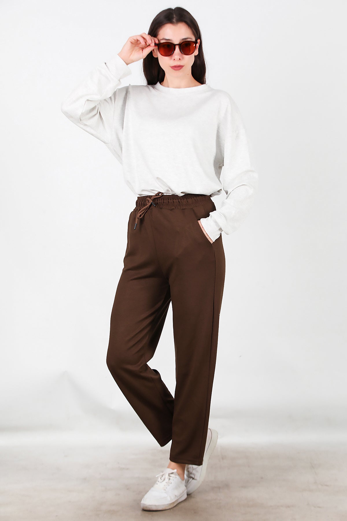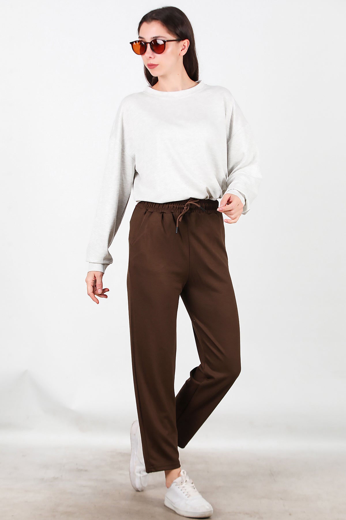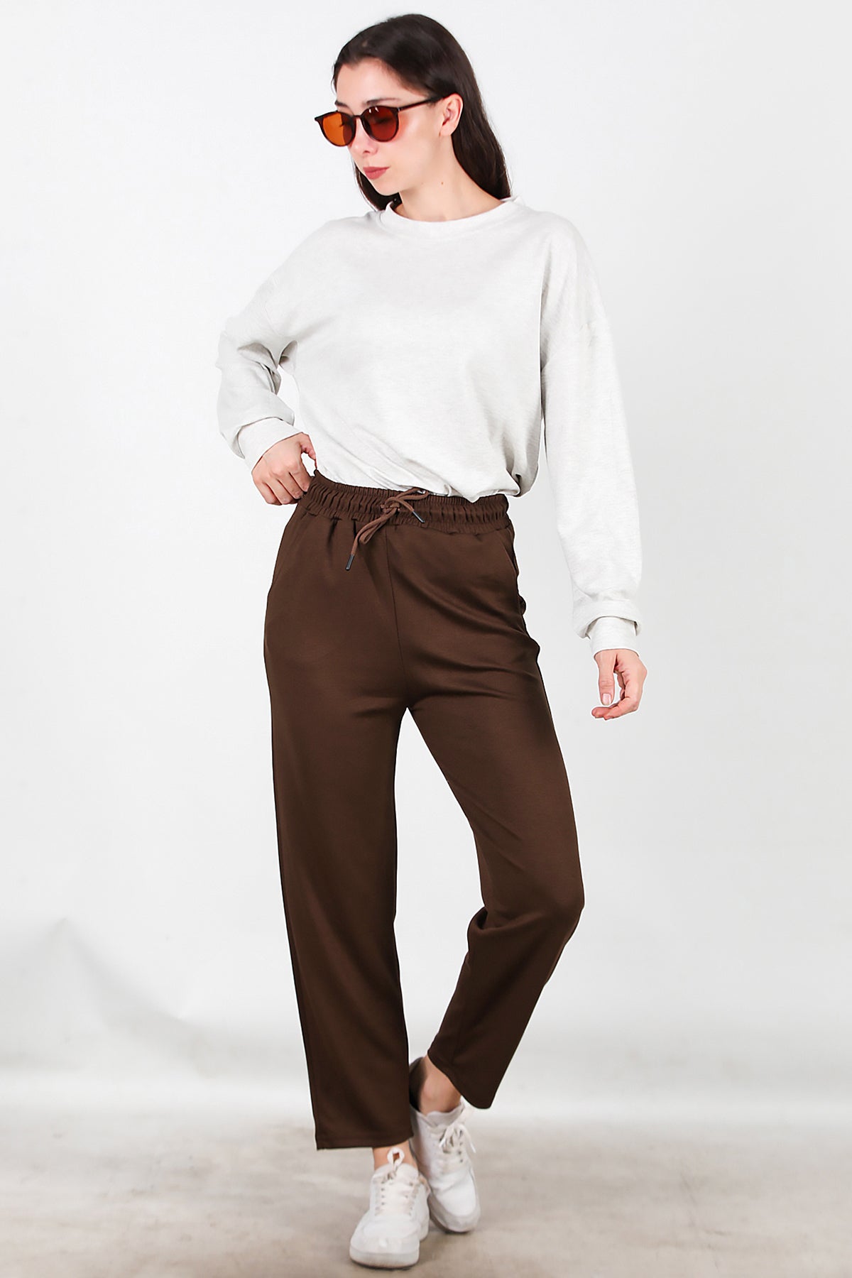 Kadın Düz Paça Cepli Eşofman Kahverengi