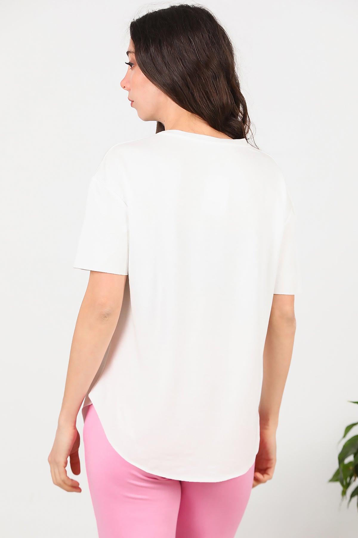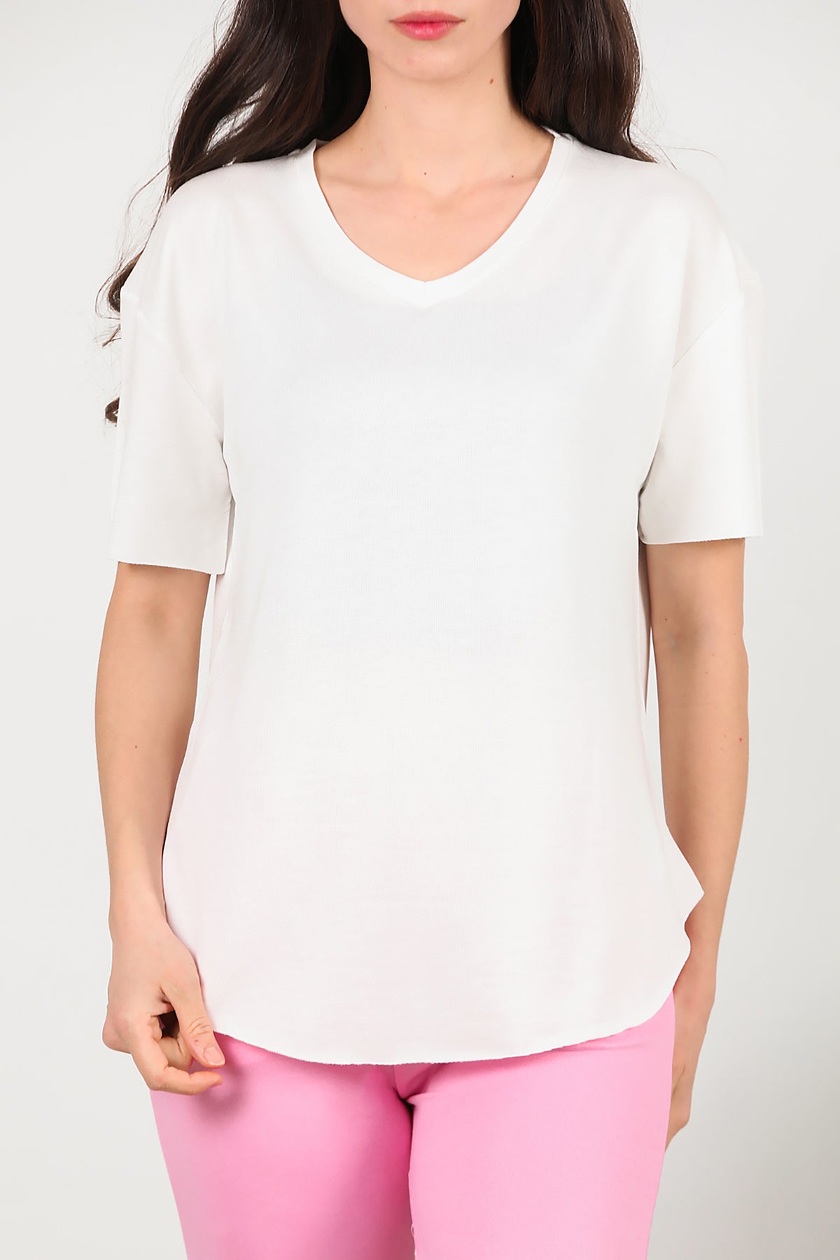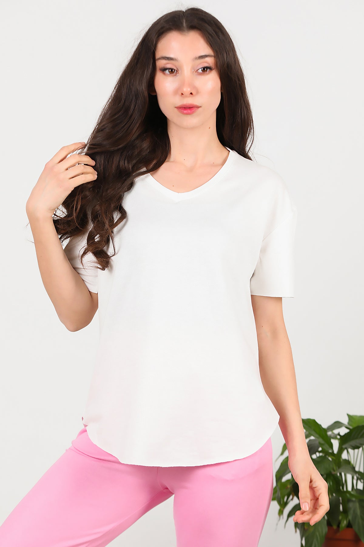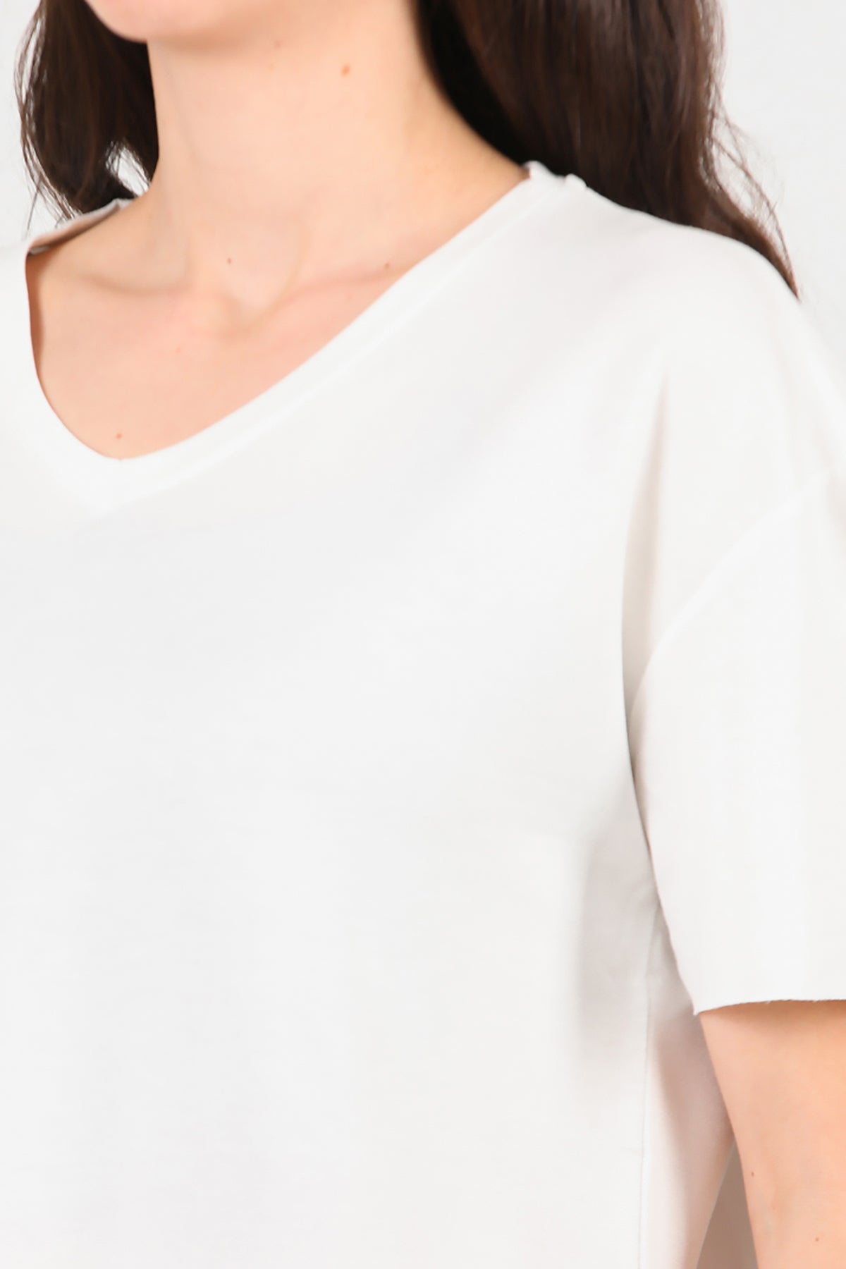 Kadın Eteği Oval V Yaka T-Shirt Ekru