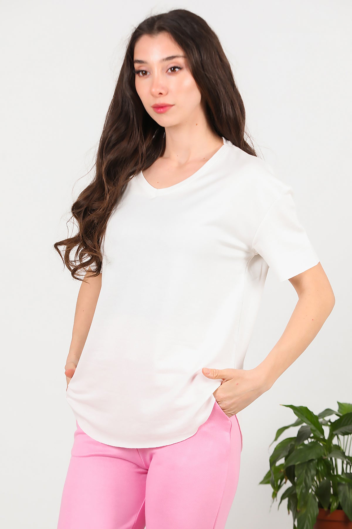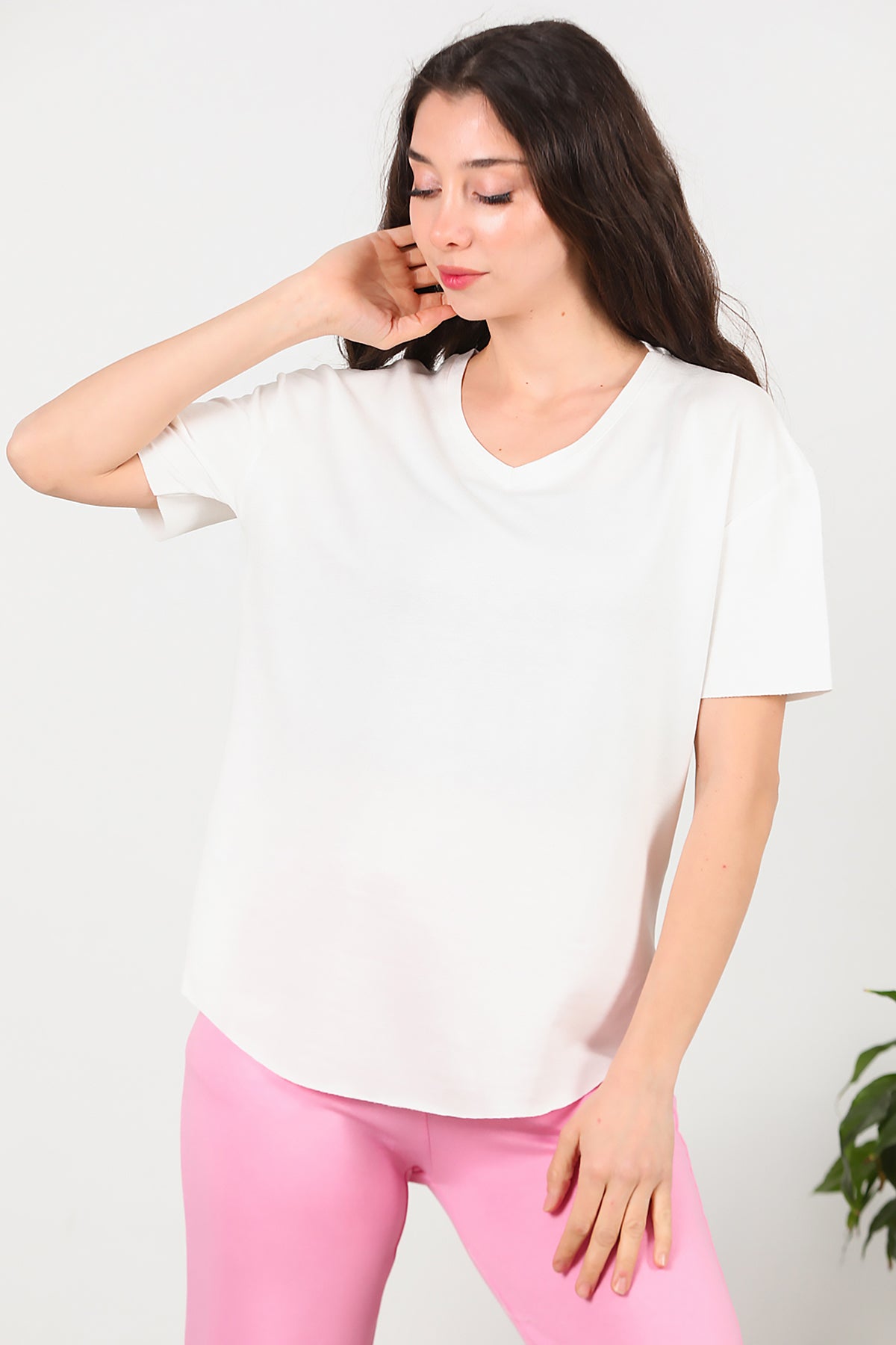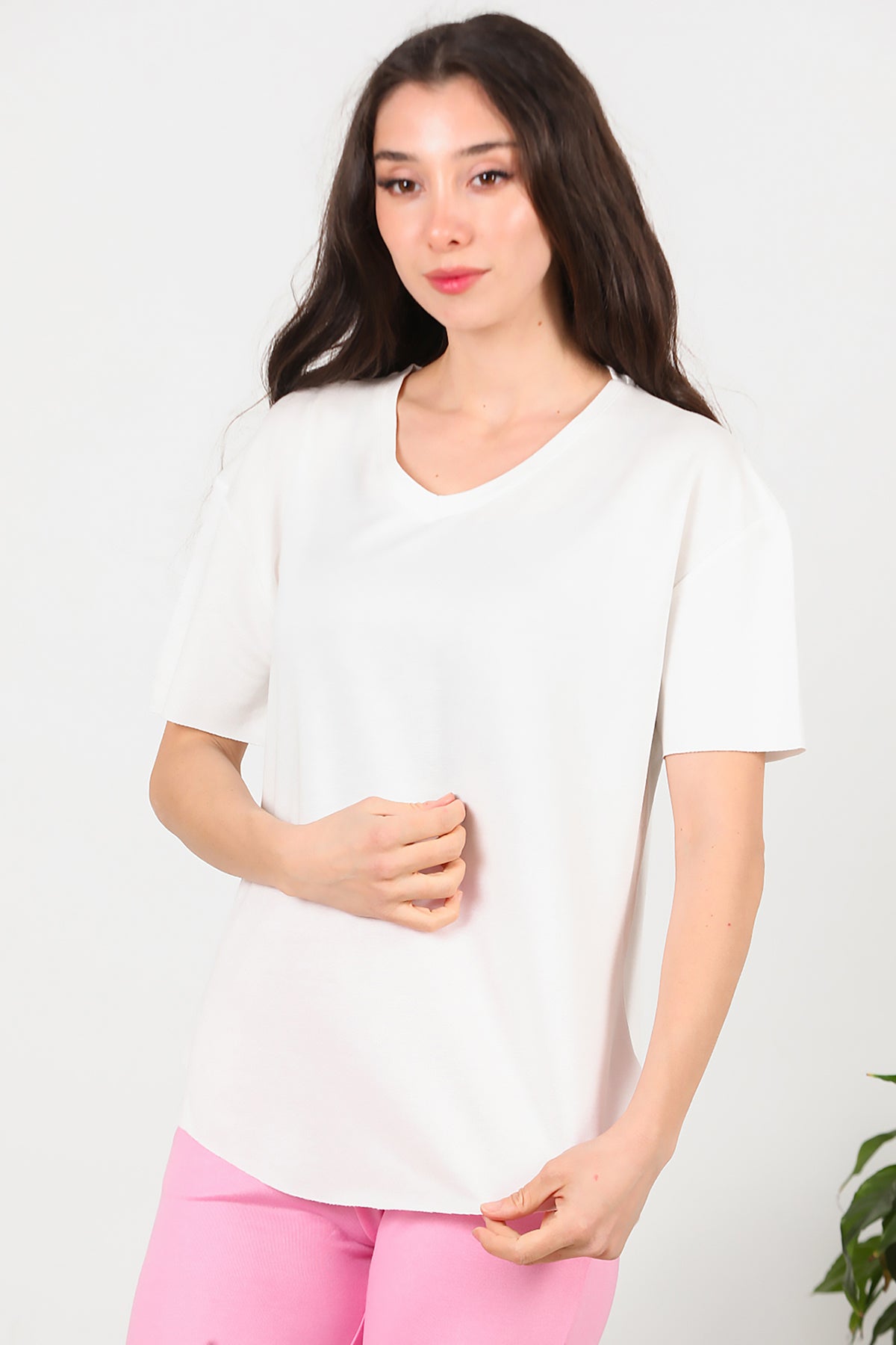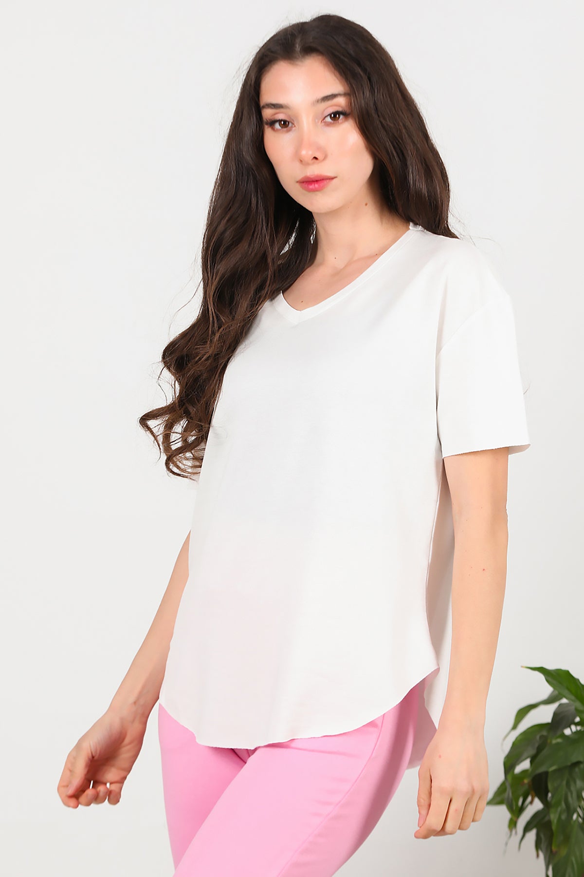 Kadın Eteği Oval V Yaka T-Shirt Ekru