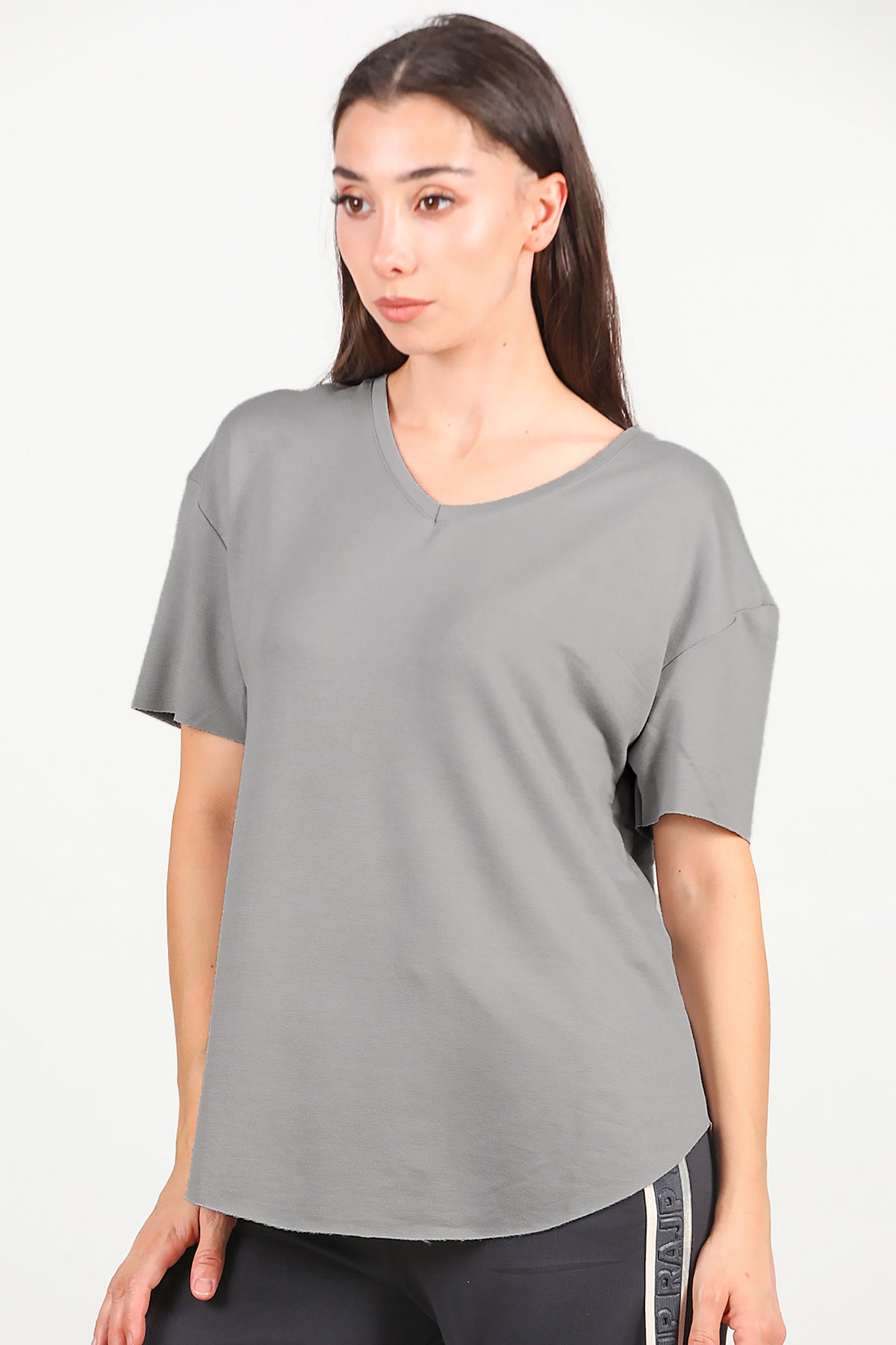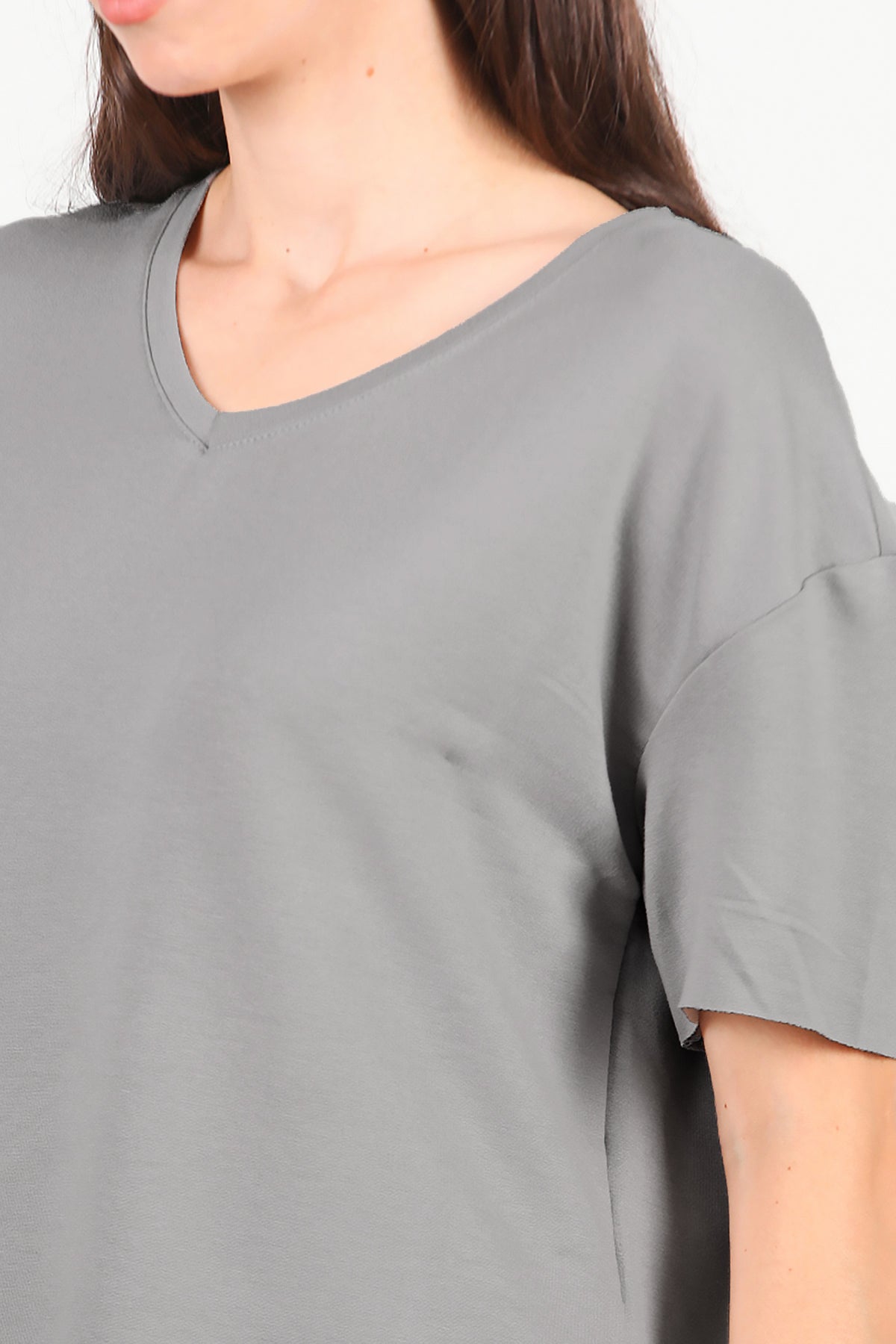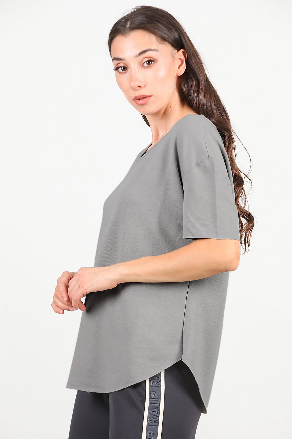 Kadın Eteği Oval V Yaka T-Shirt Gri