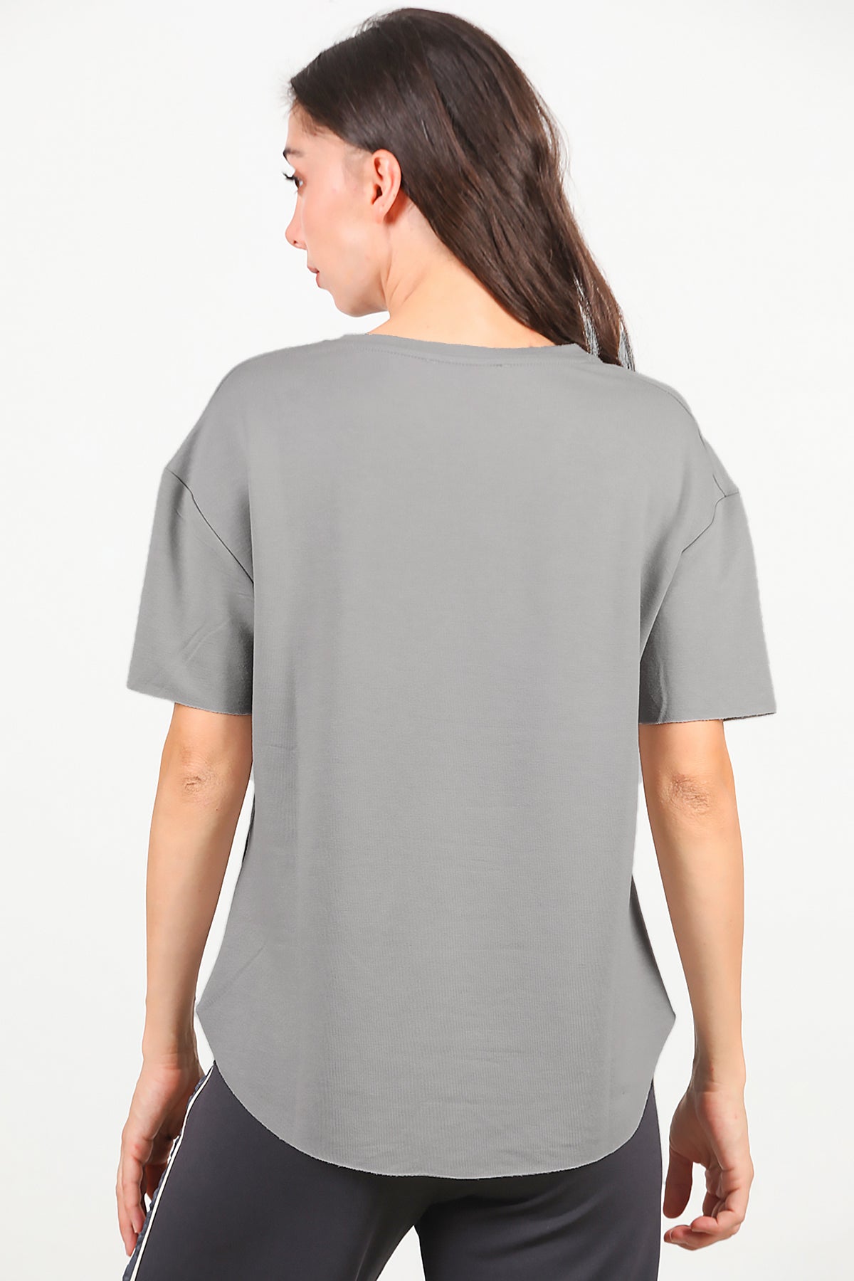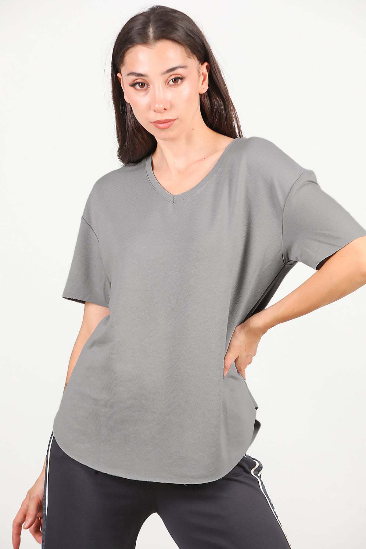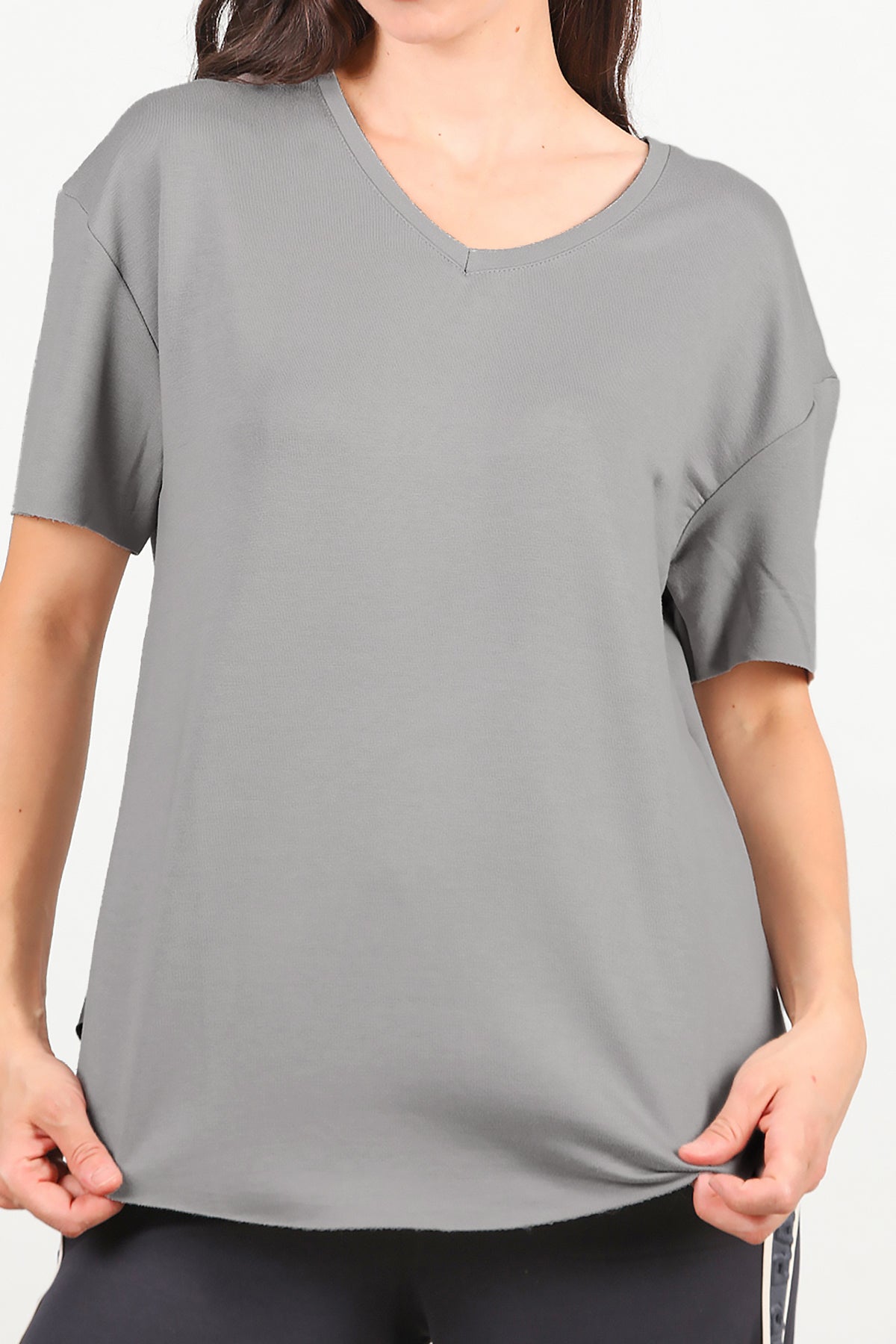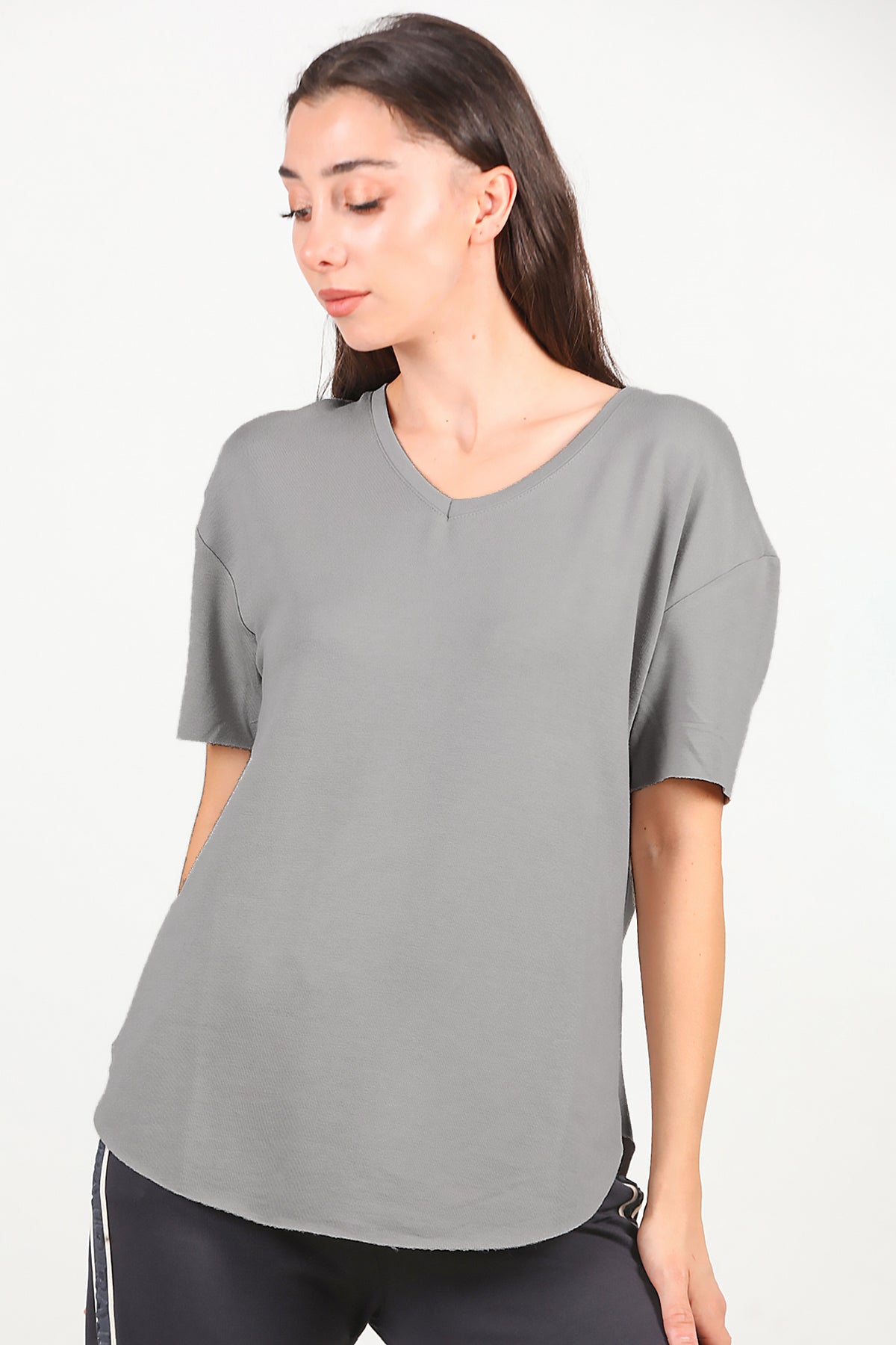 Kadın Eteği Oval V Yaka T-Shirt Gri