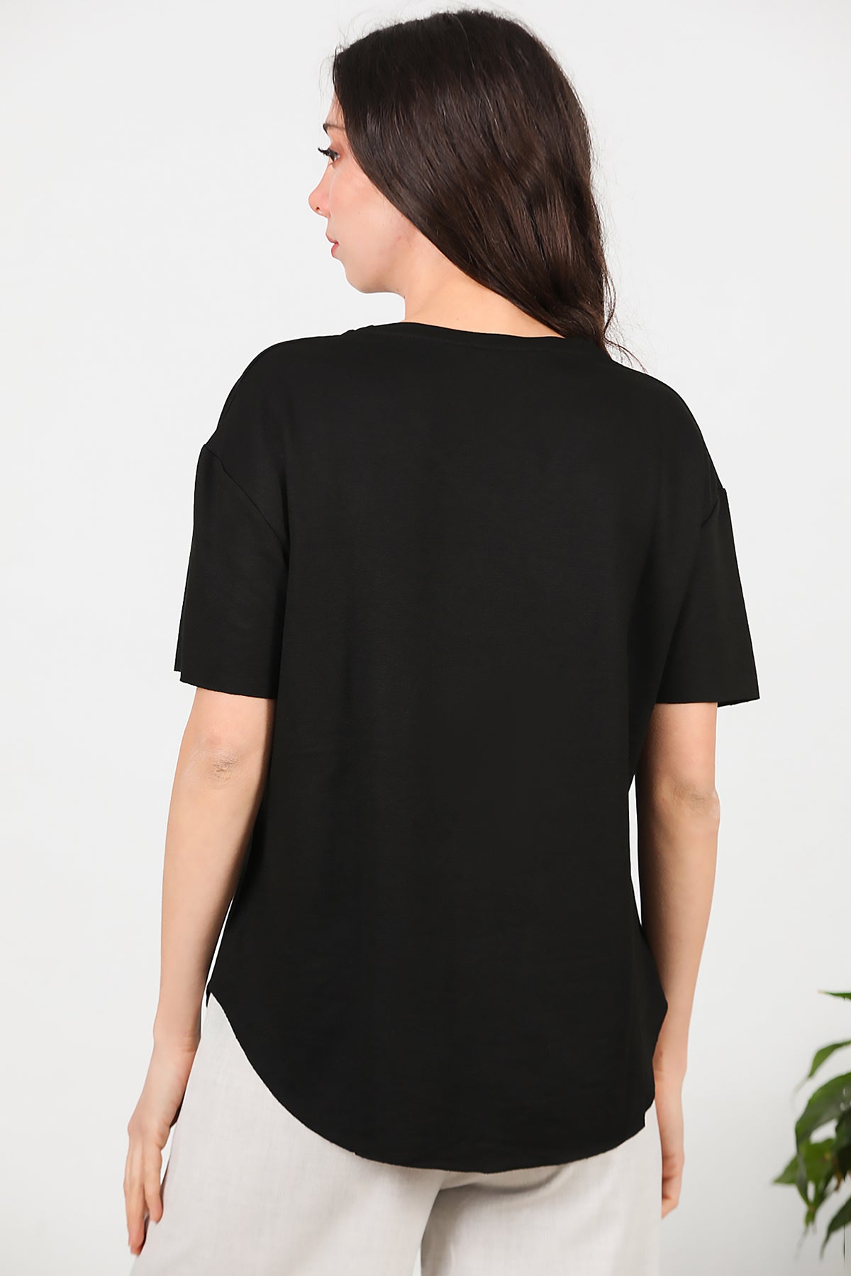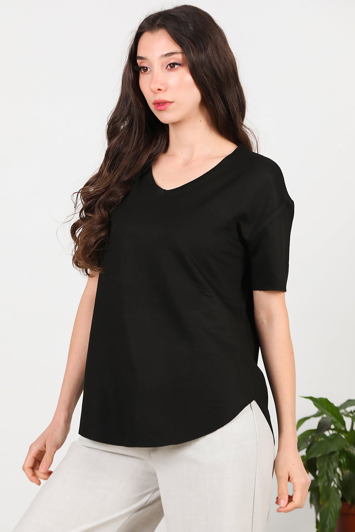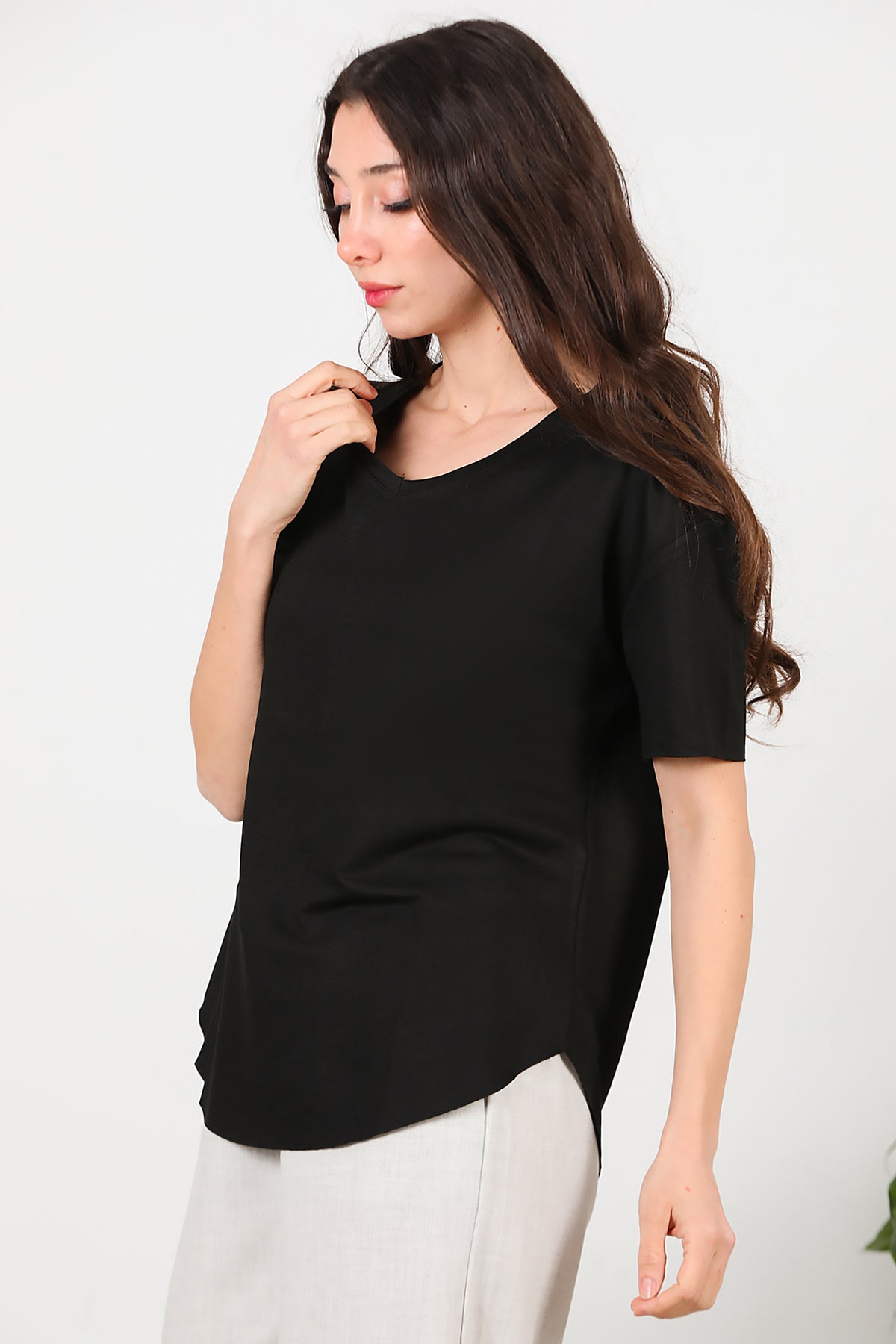Kadın Eteği Oval V Yaka T-Shirt Siyah