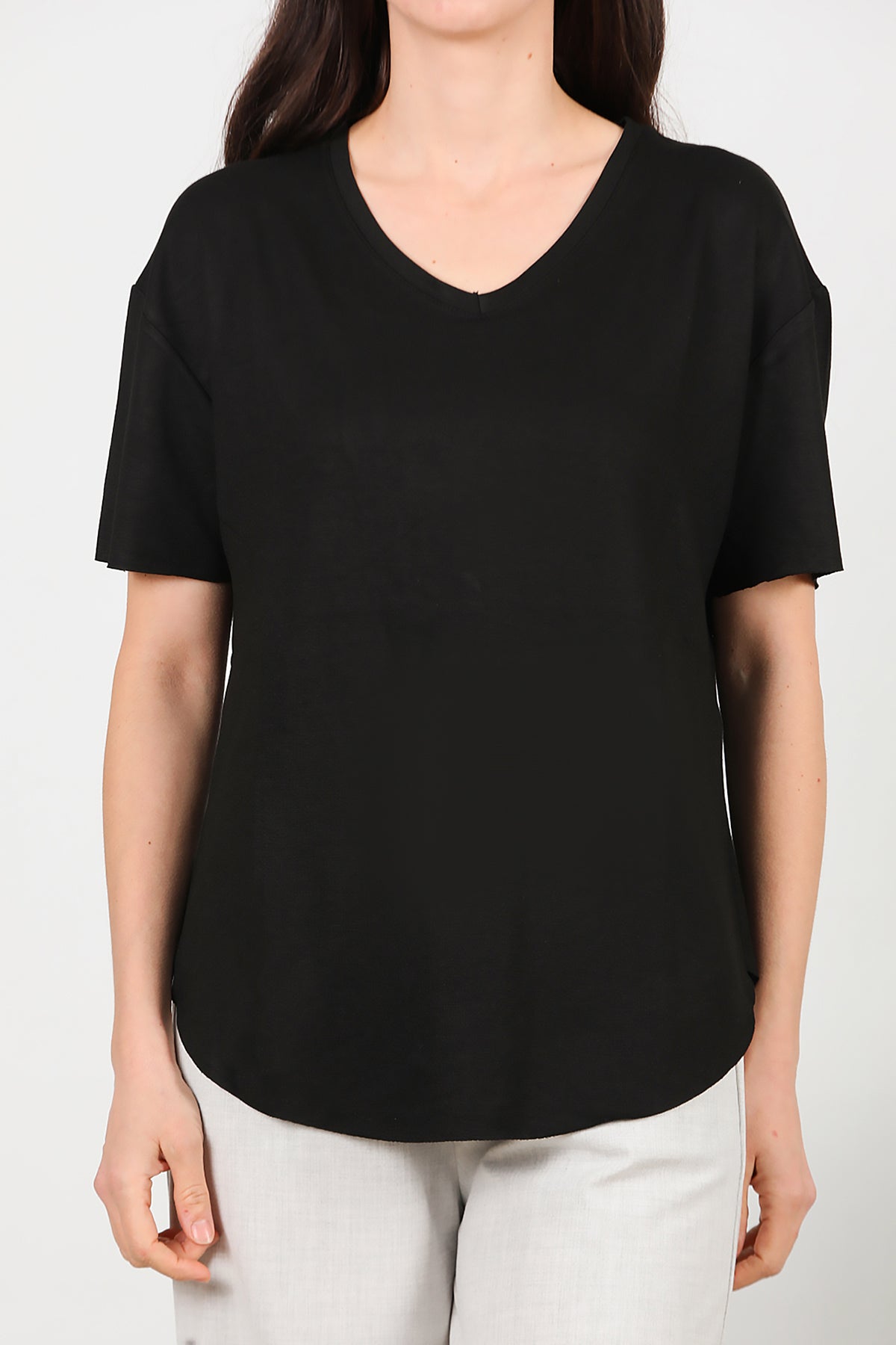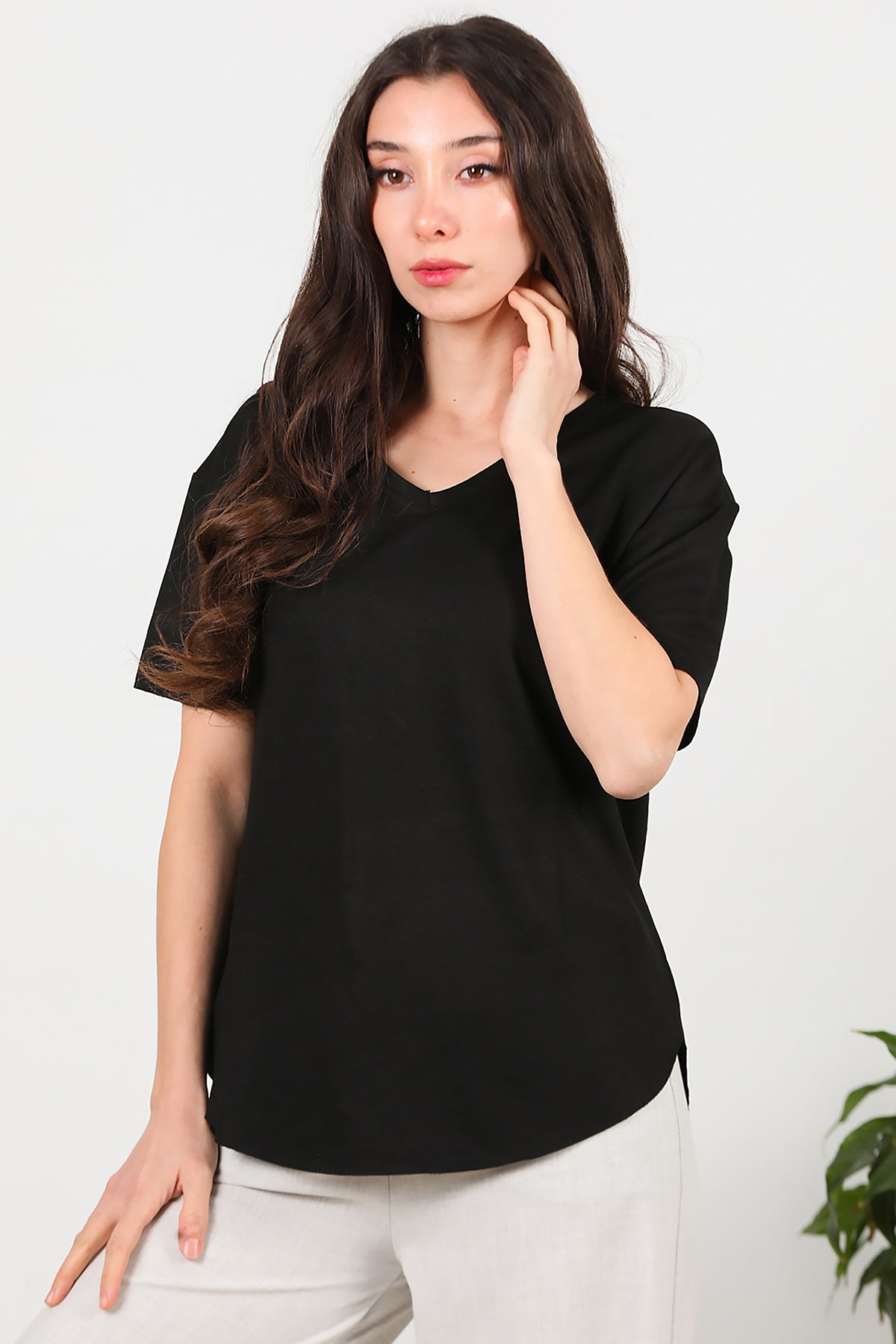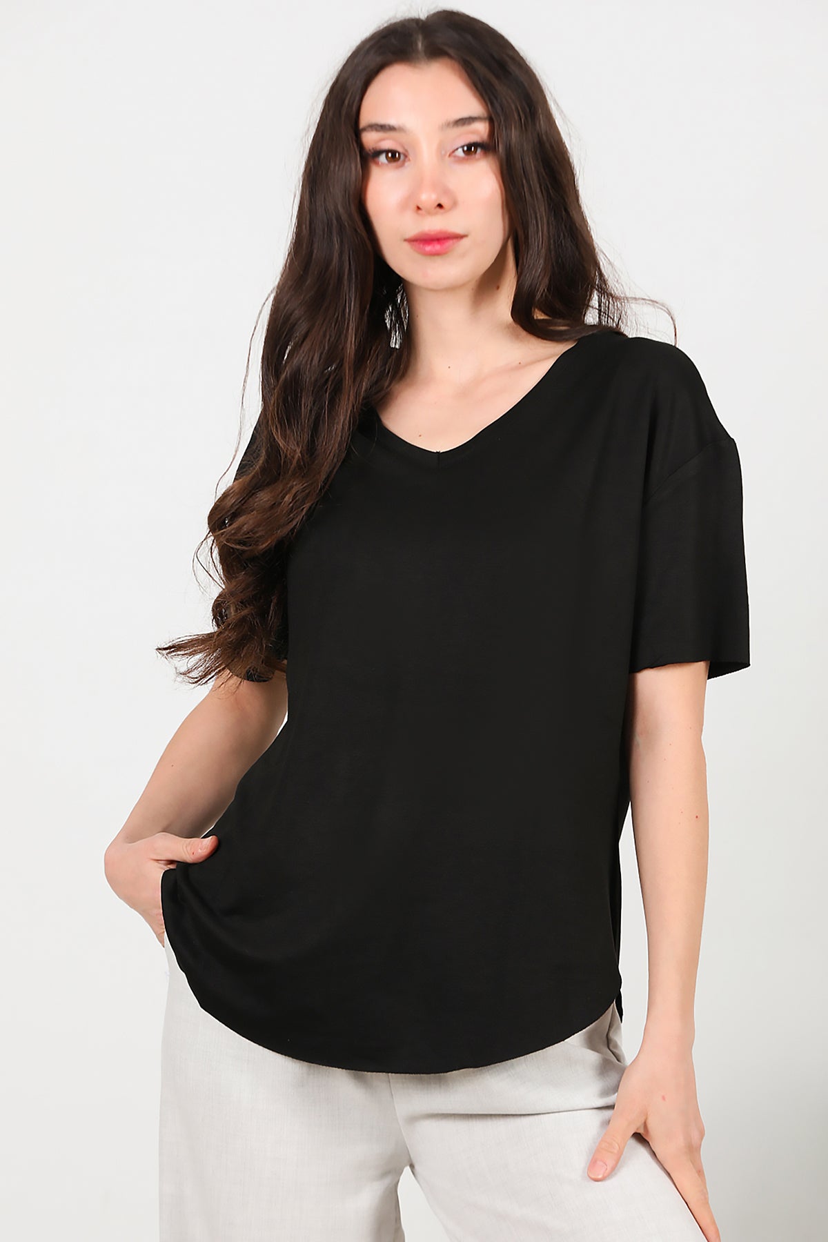 Kadın Eteği Oval V Yaka T-Shirt Siyah