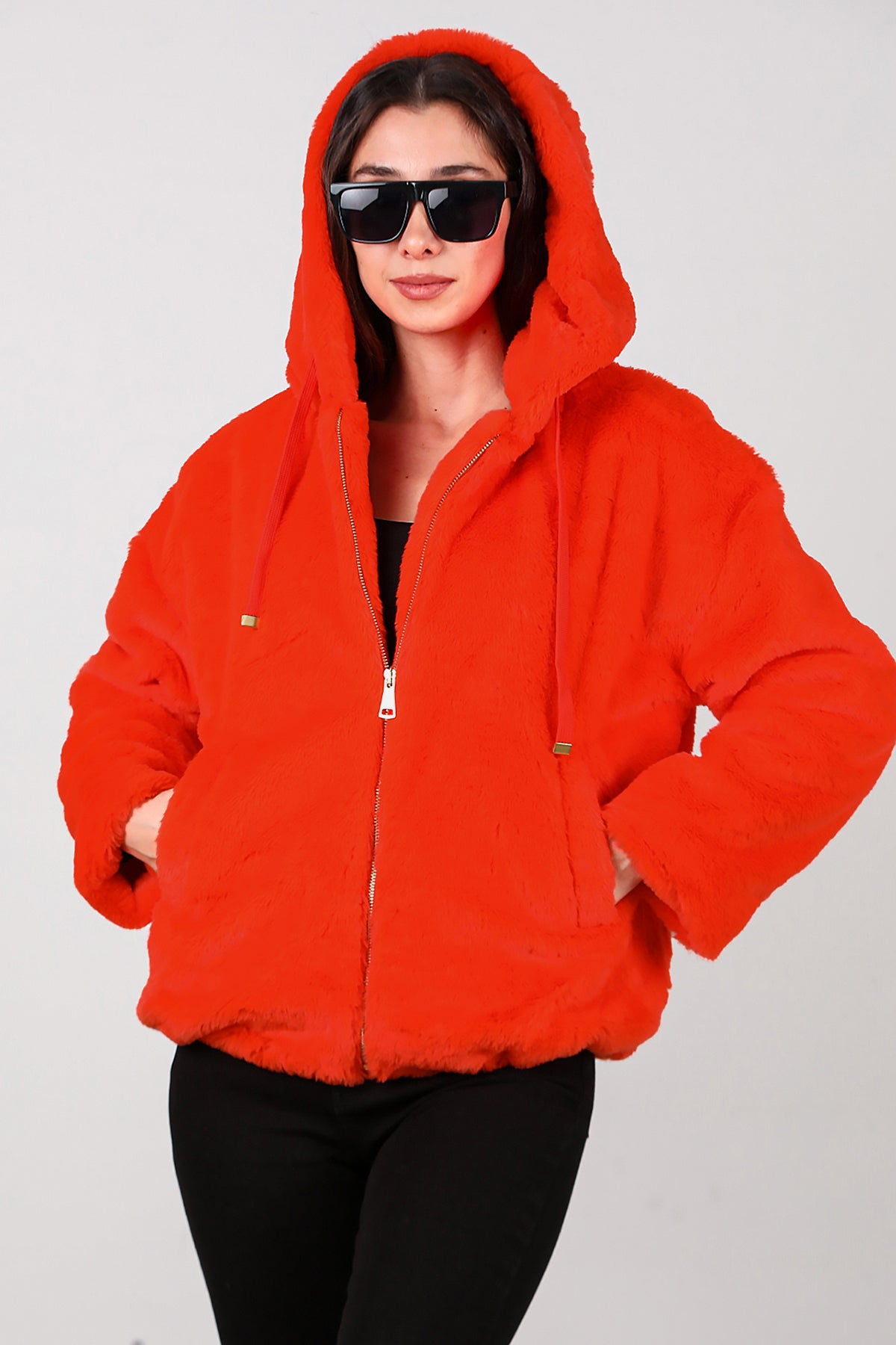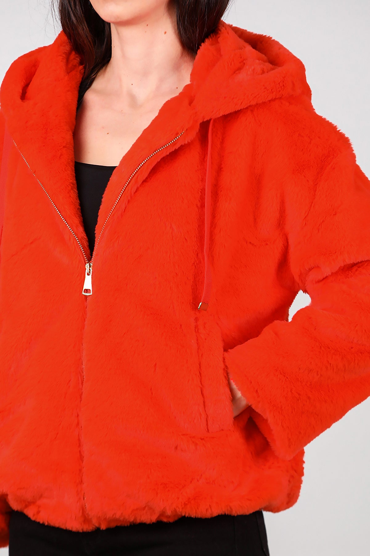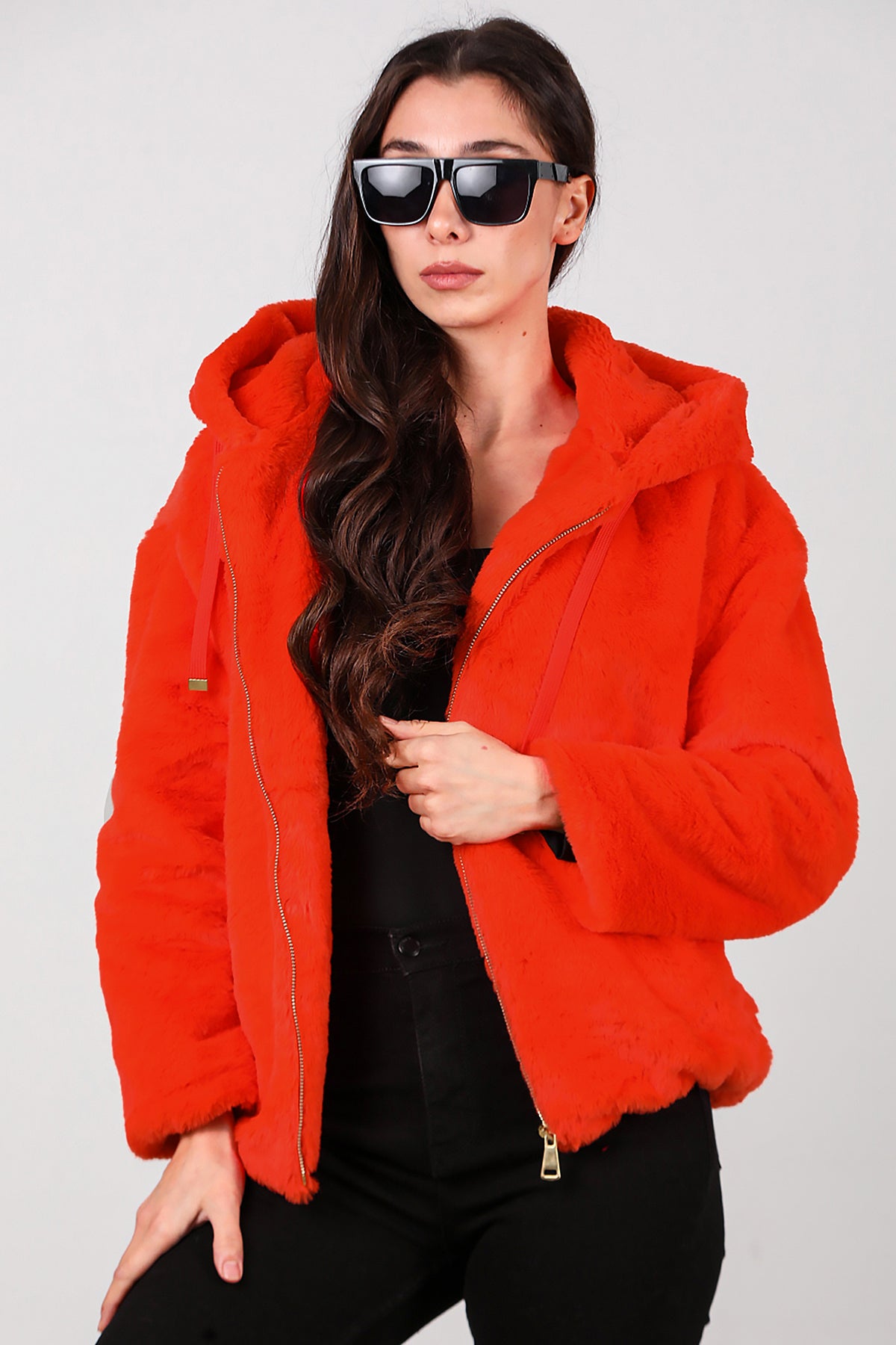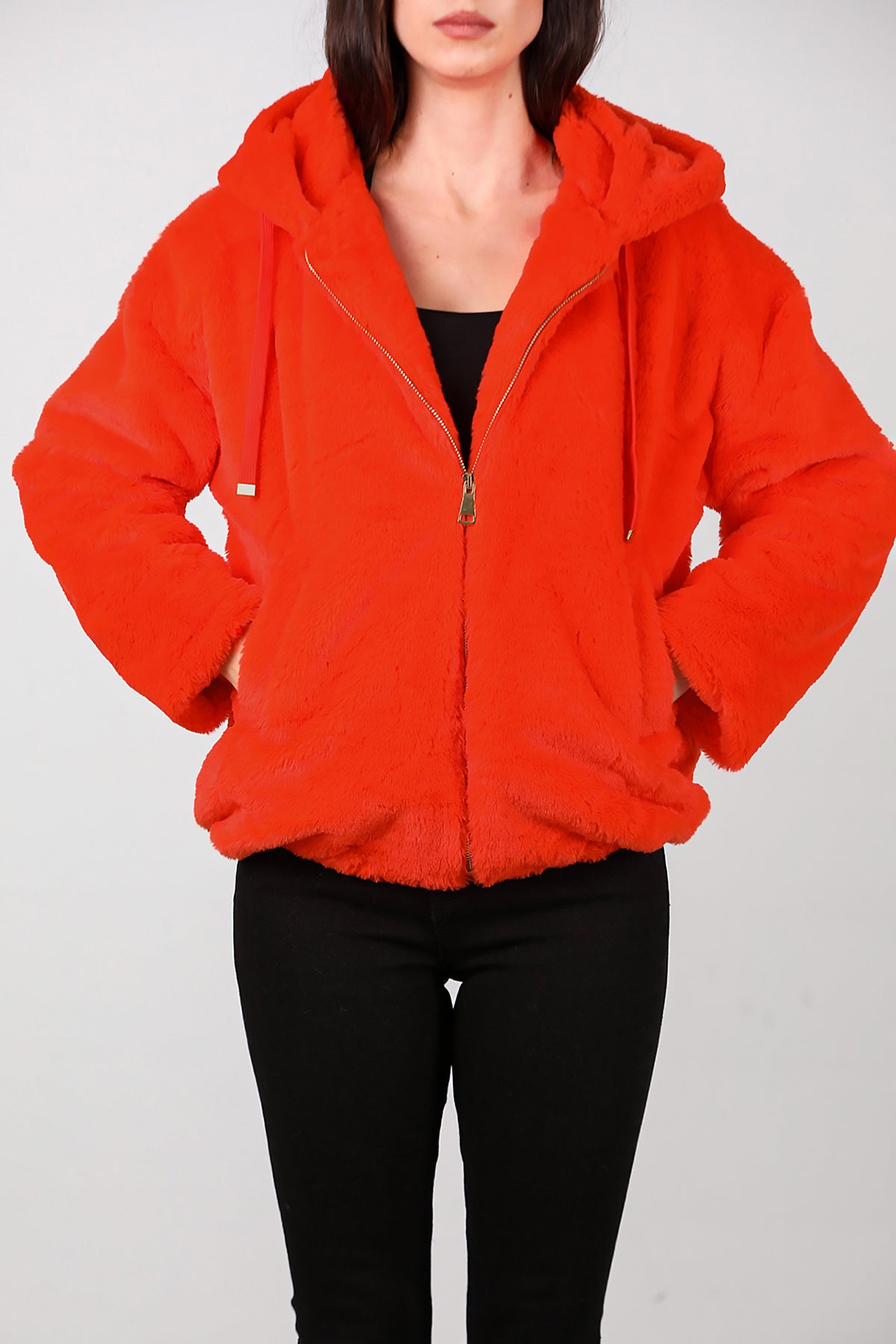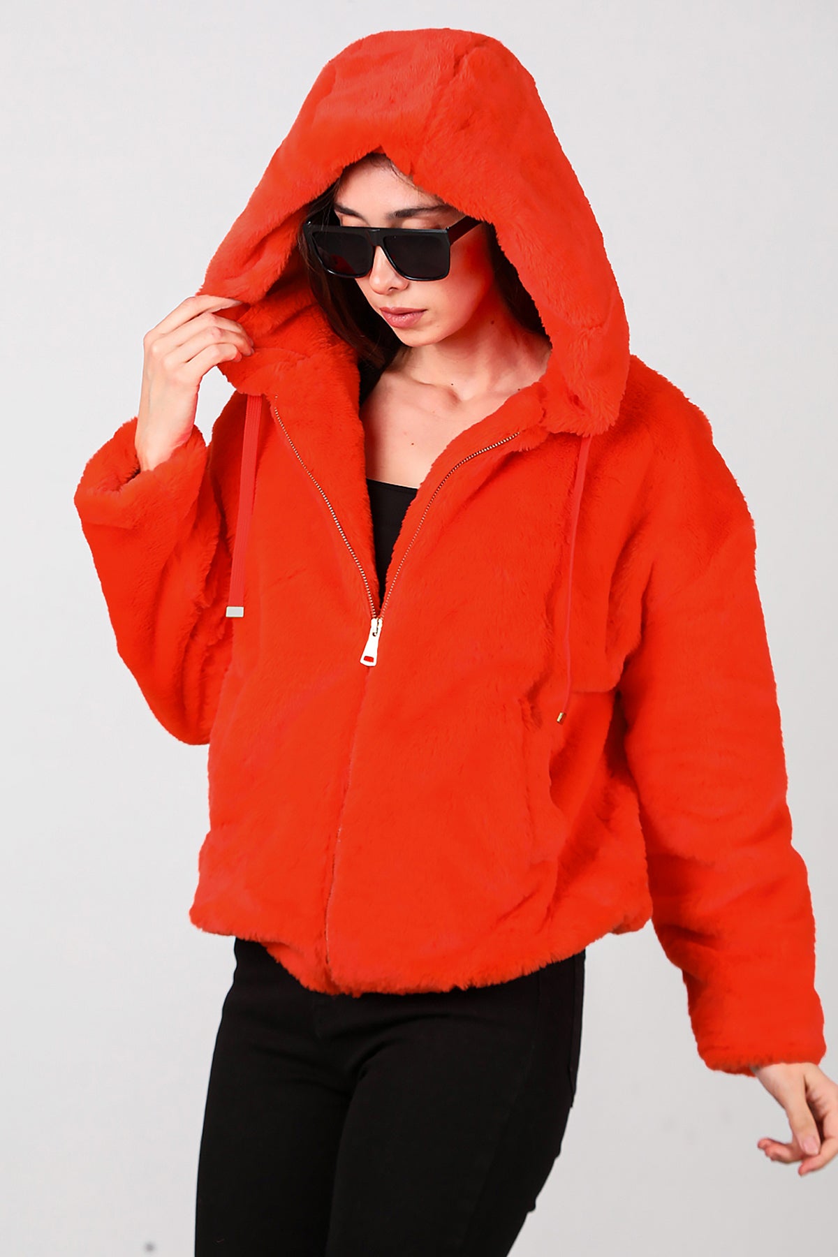 Kadın Etek Ucu Lastikli Kapşonlu Peluş Mont Turuncu