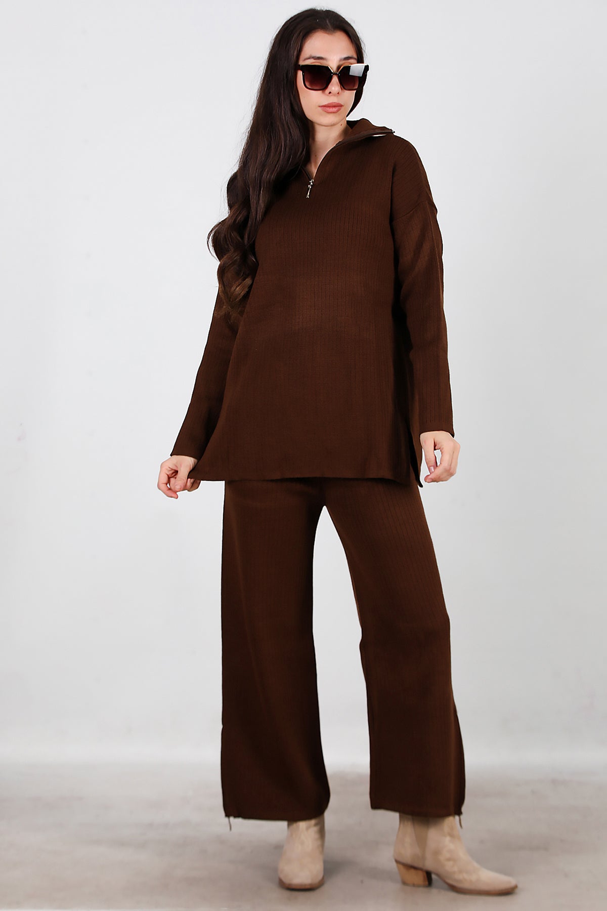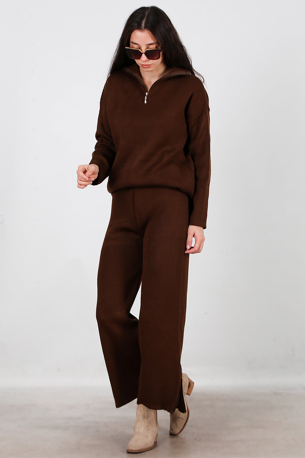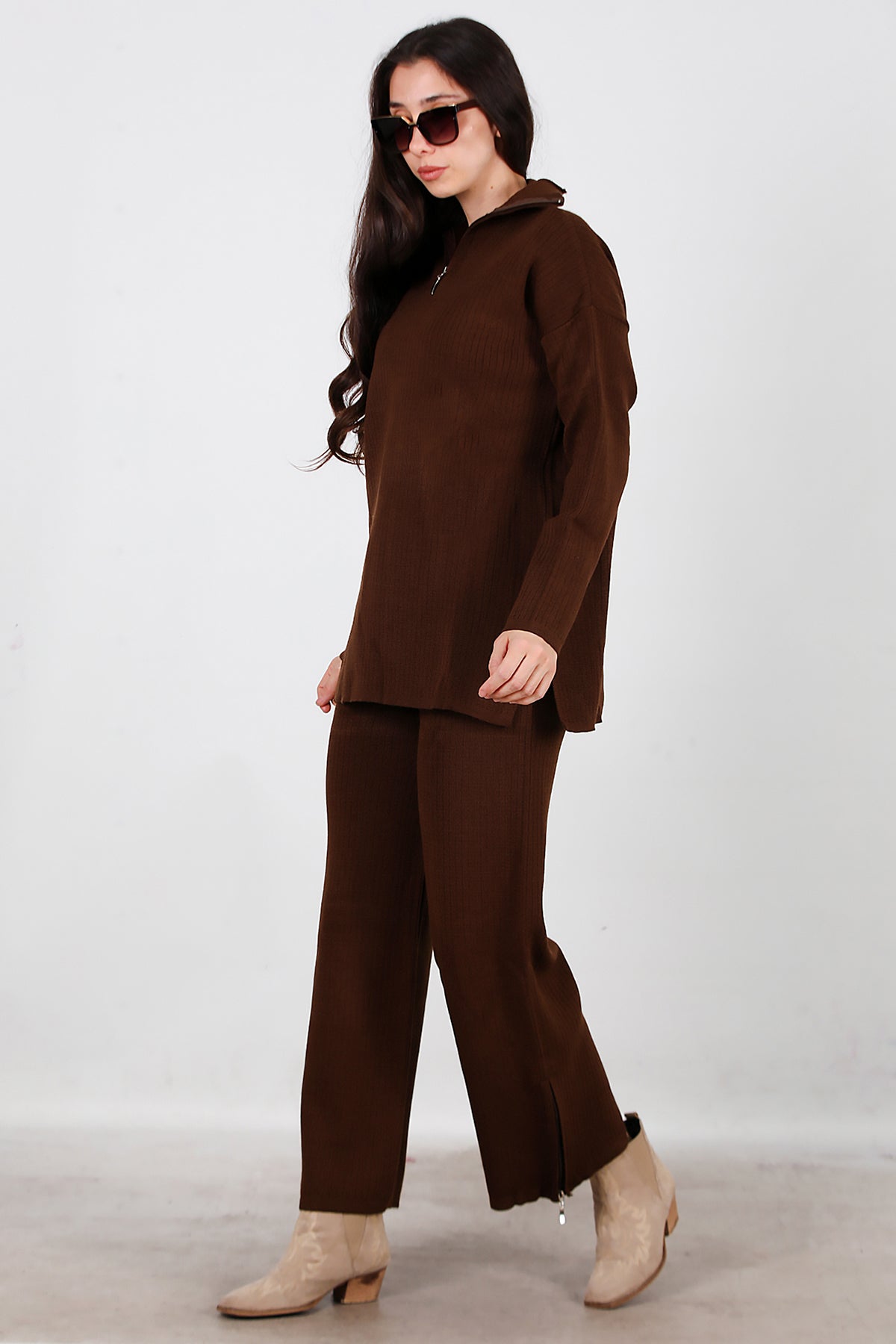 Kadın Fermuar Detay Triko Takım Kahverengi
