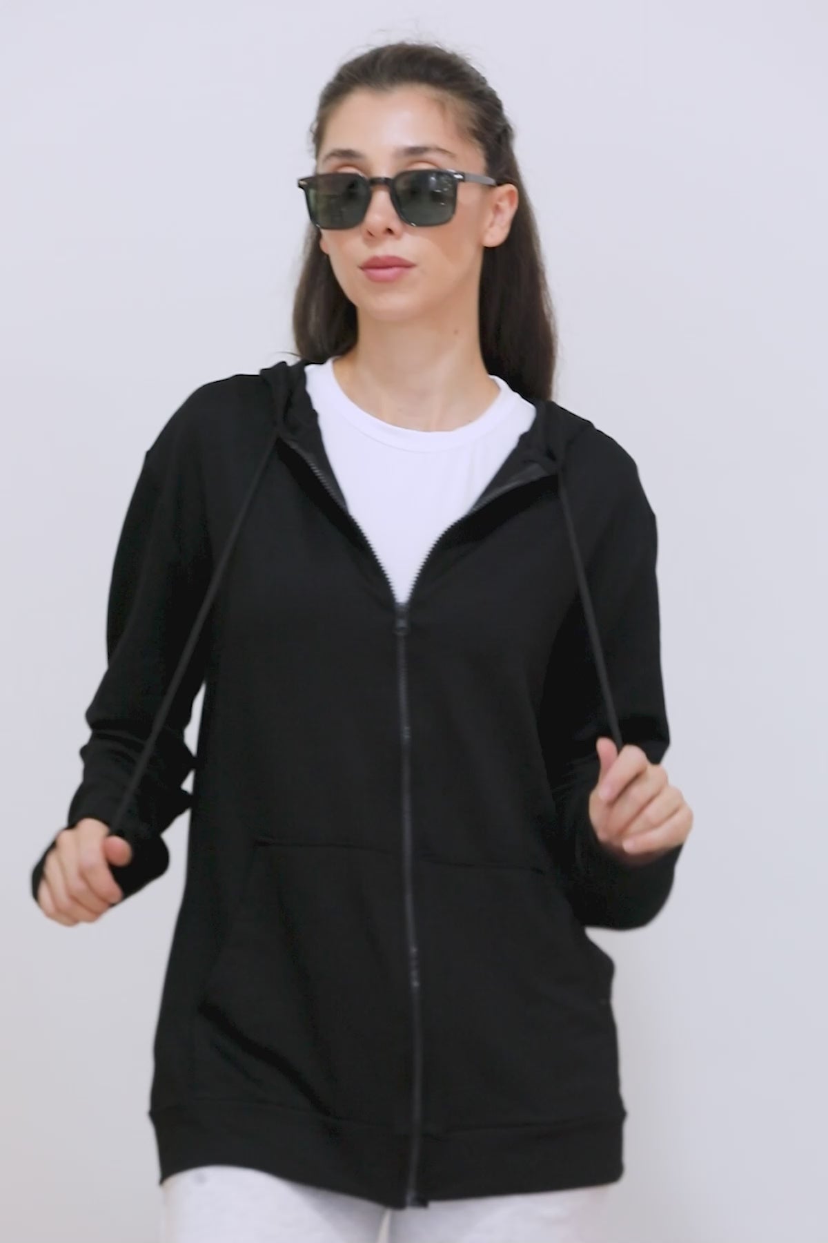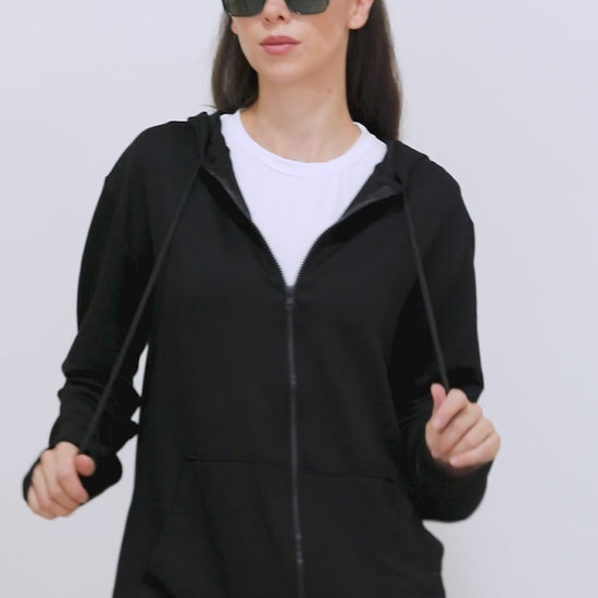 Kadın Fermuarlı Cepli Kapşonlu Ceket Siyah