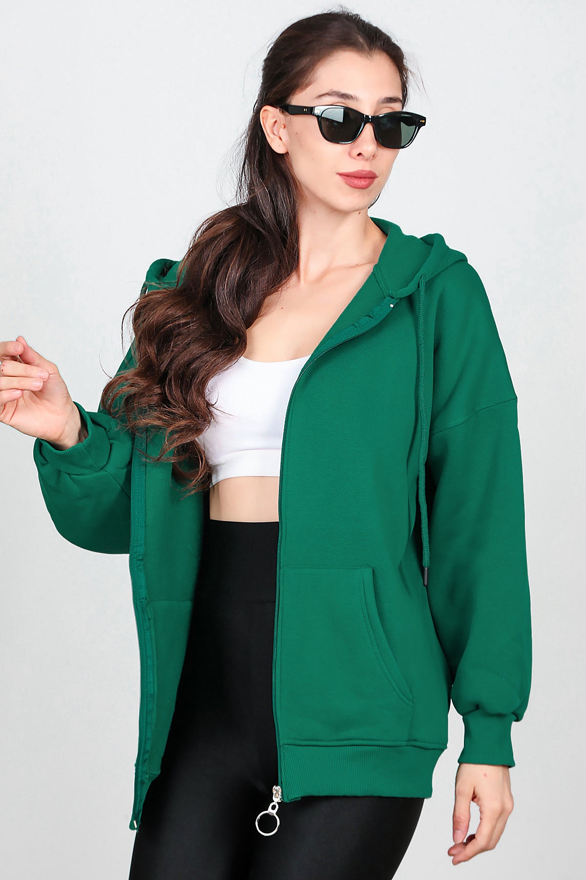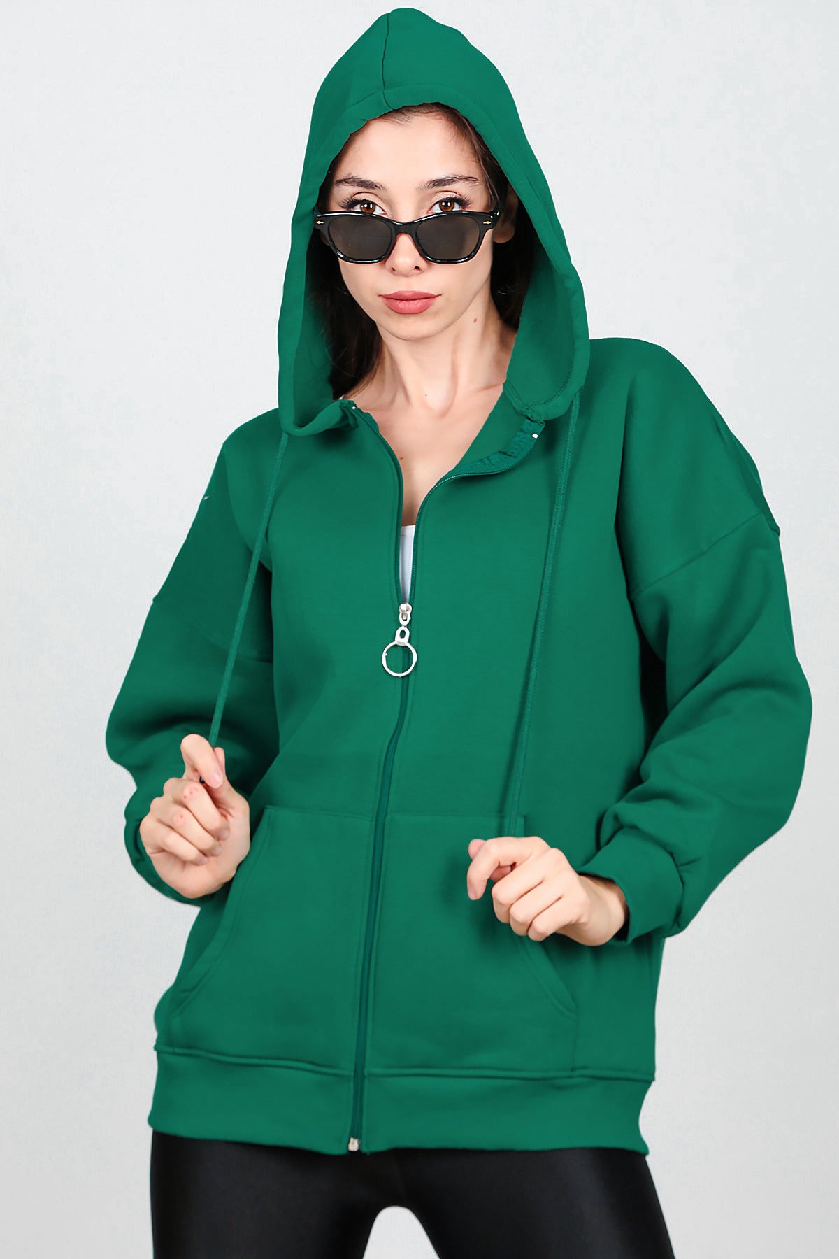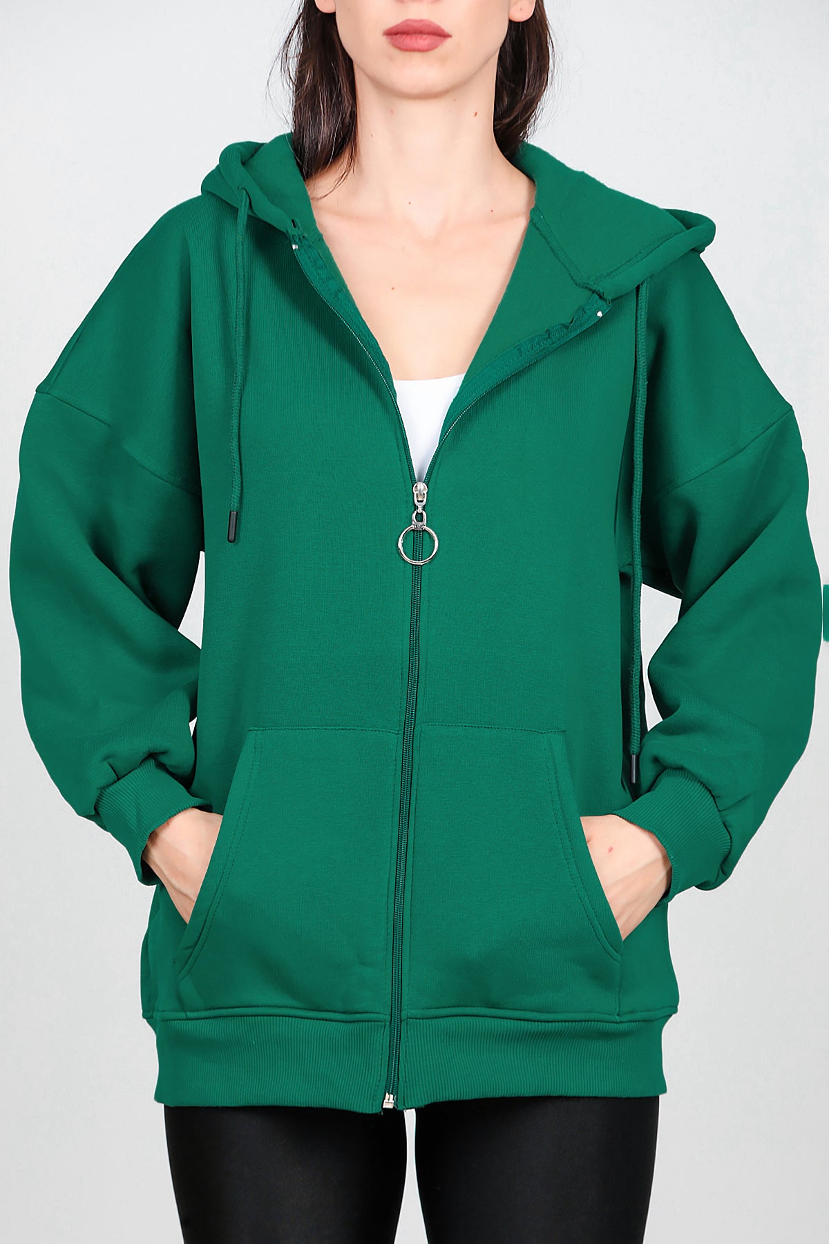 Kadın Fermuarlı Kapşonlu Sweat Zümrüt