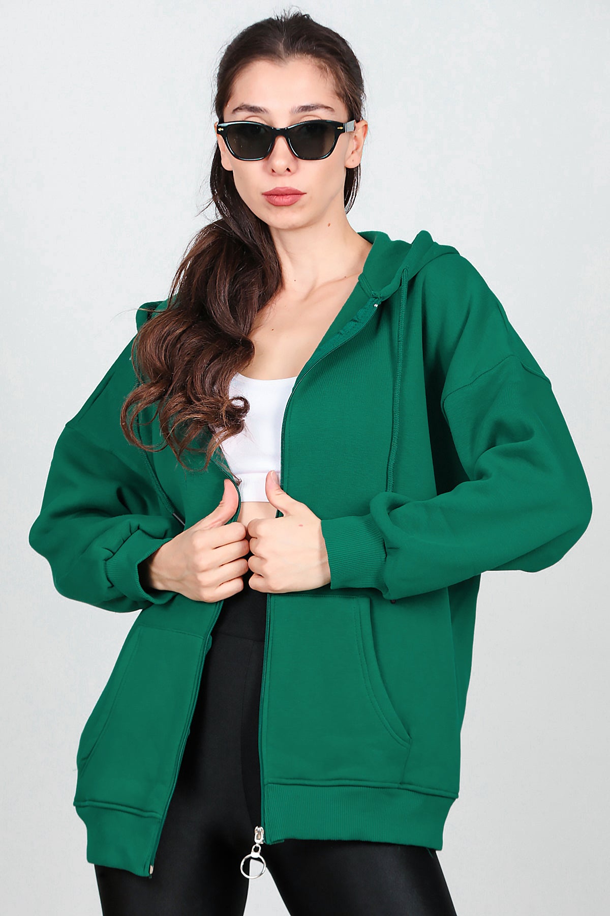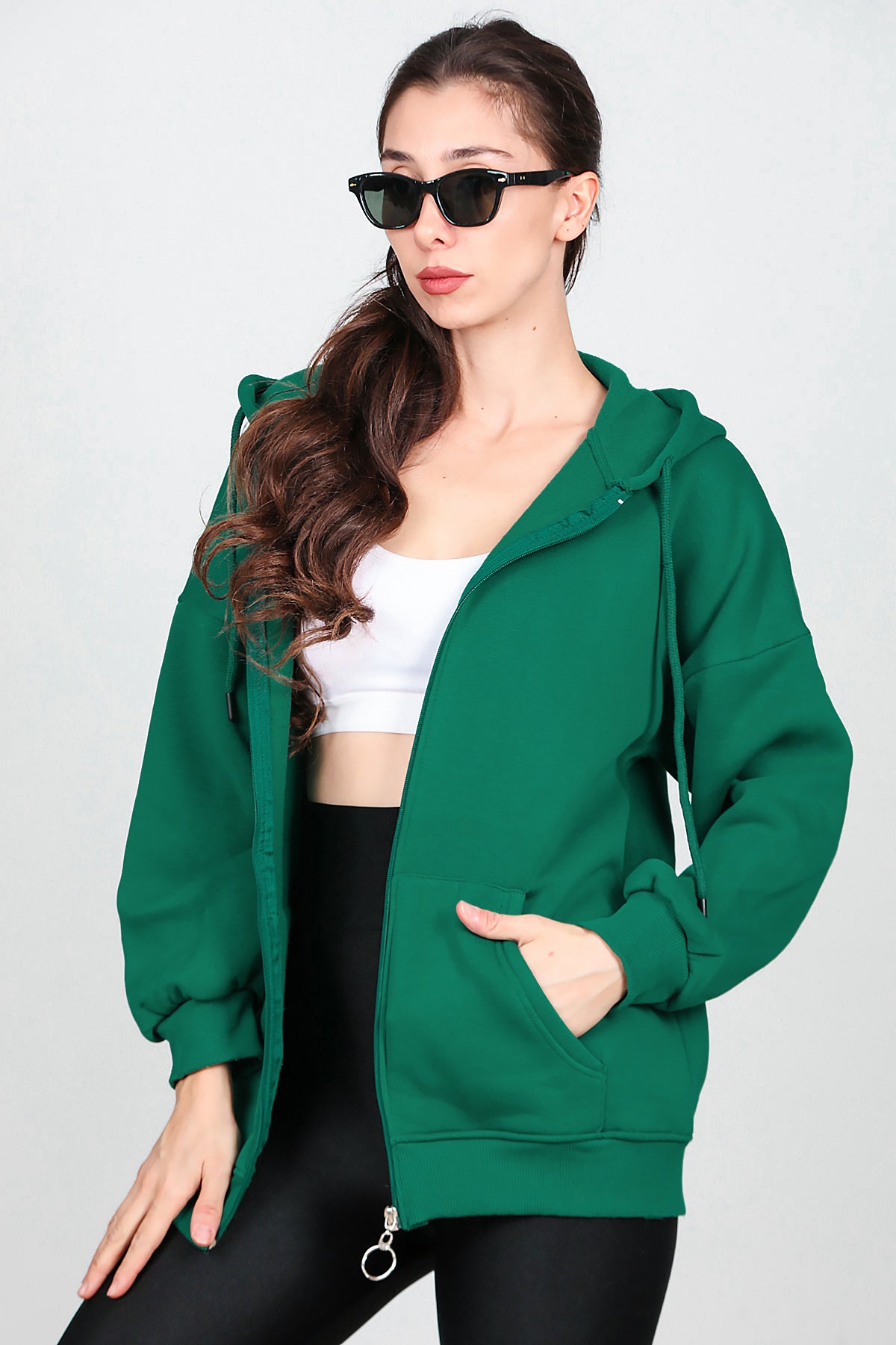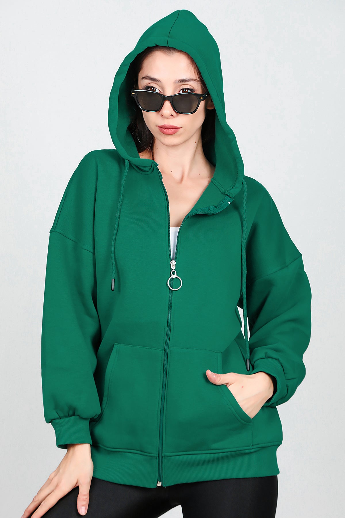 Kadın Fermuarlı Kapşonlu Sweat Zümrüt