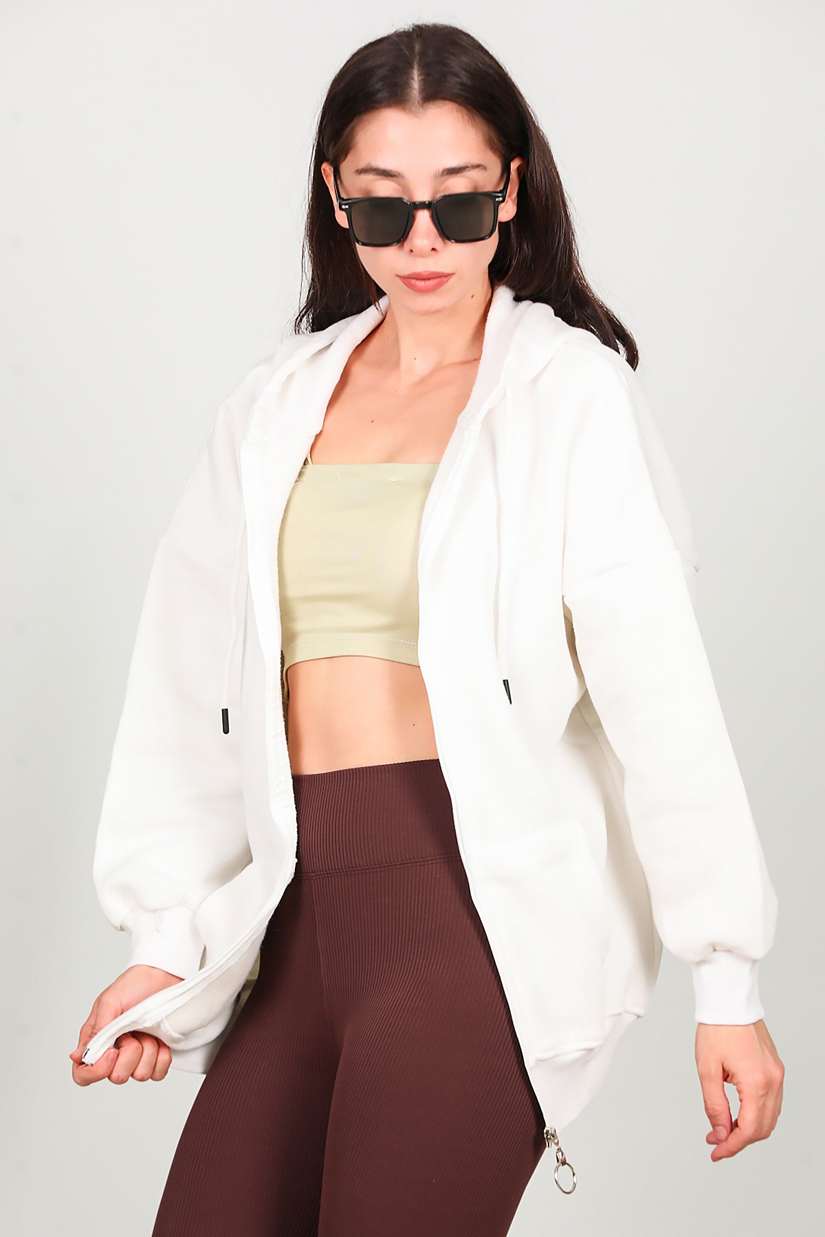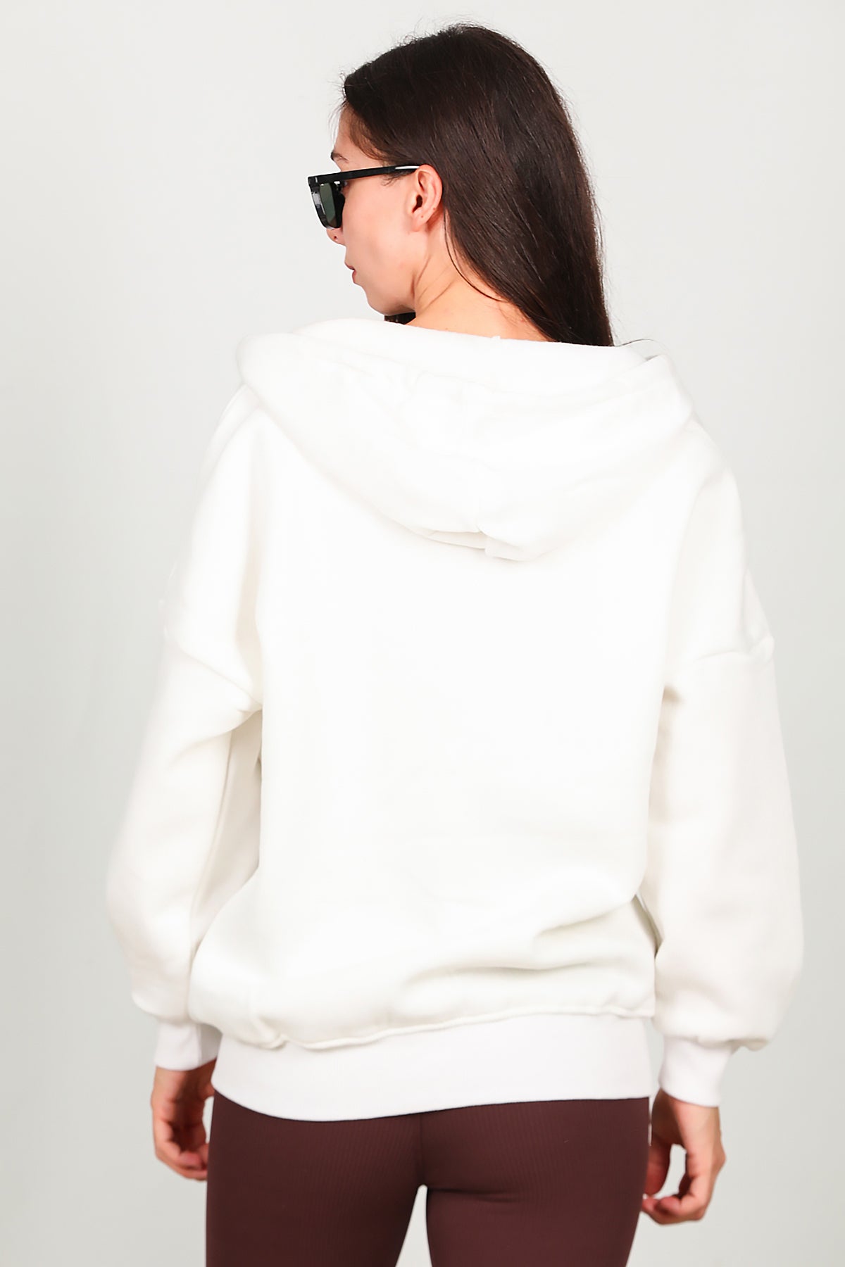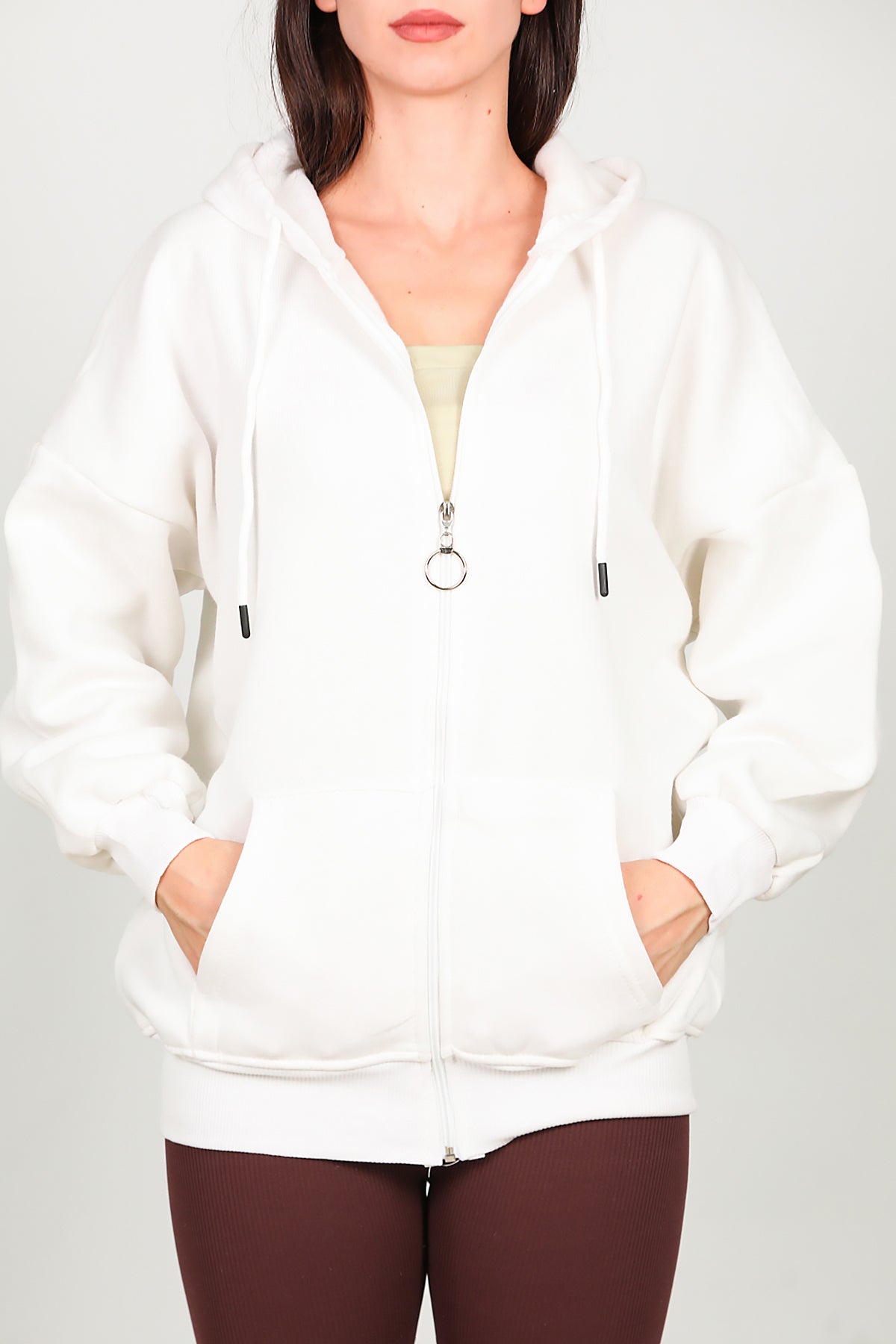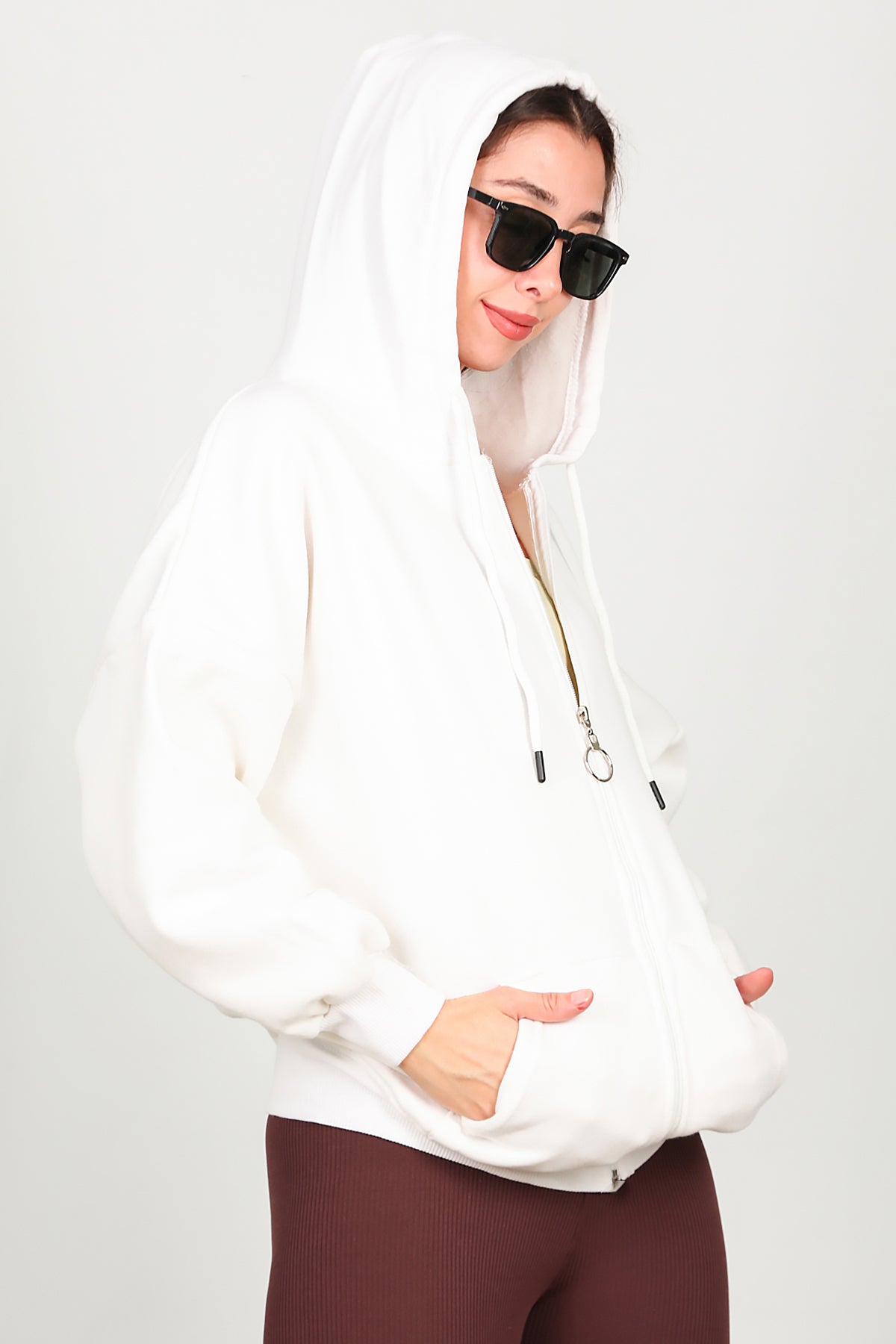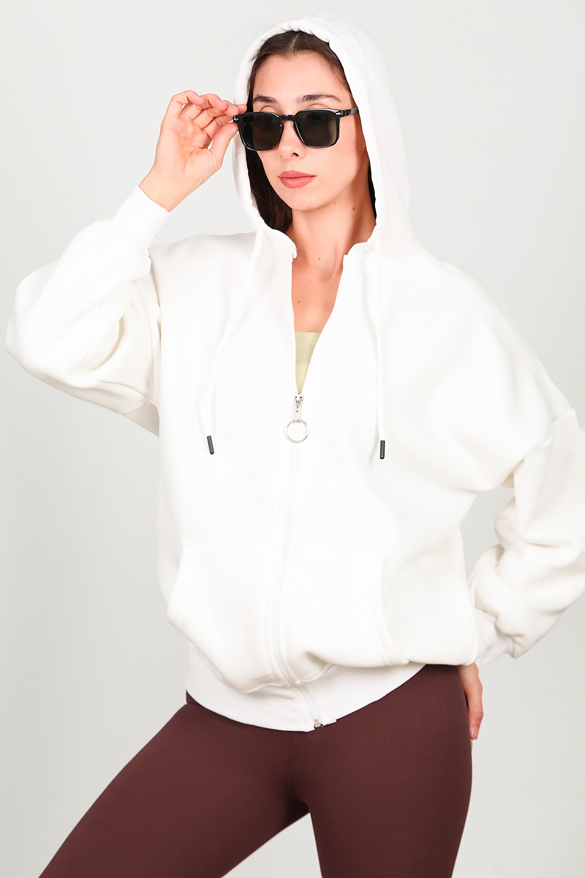 Kadın Fermuarlı Kapşonlu Sweat Ekru