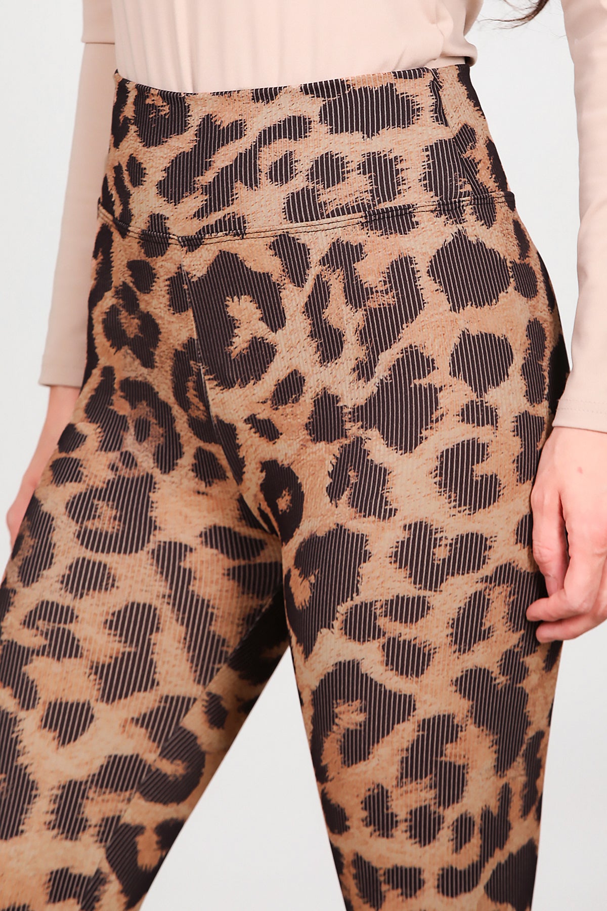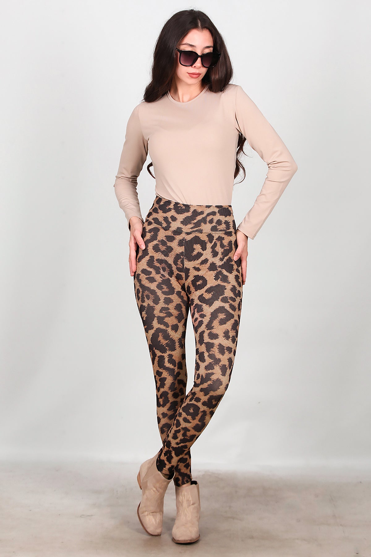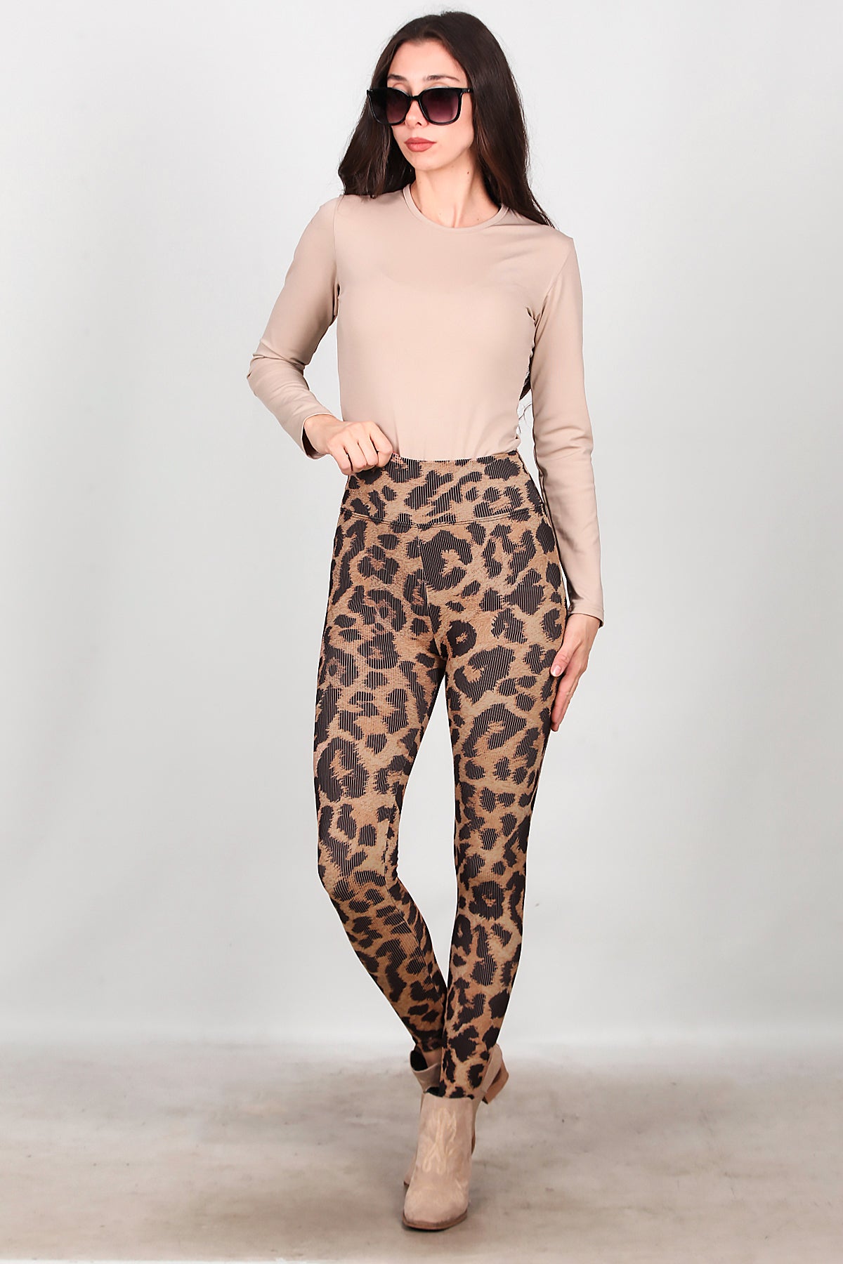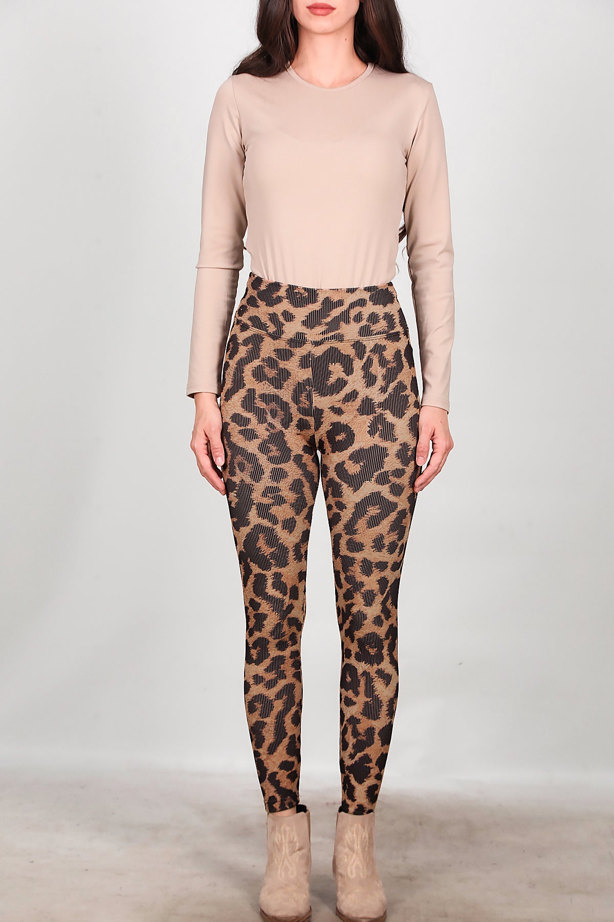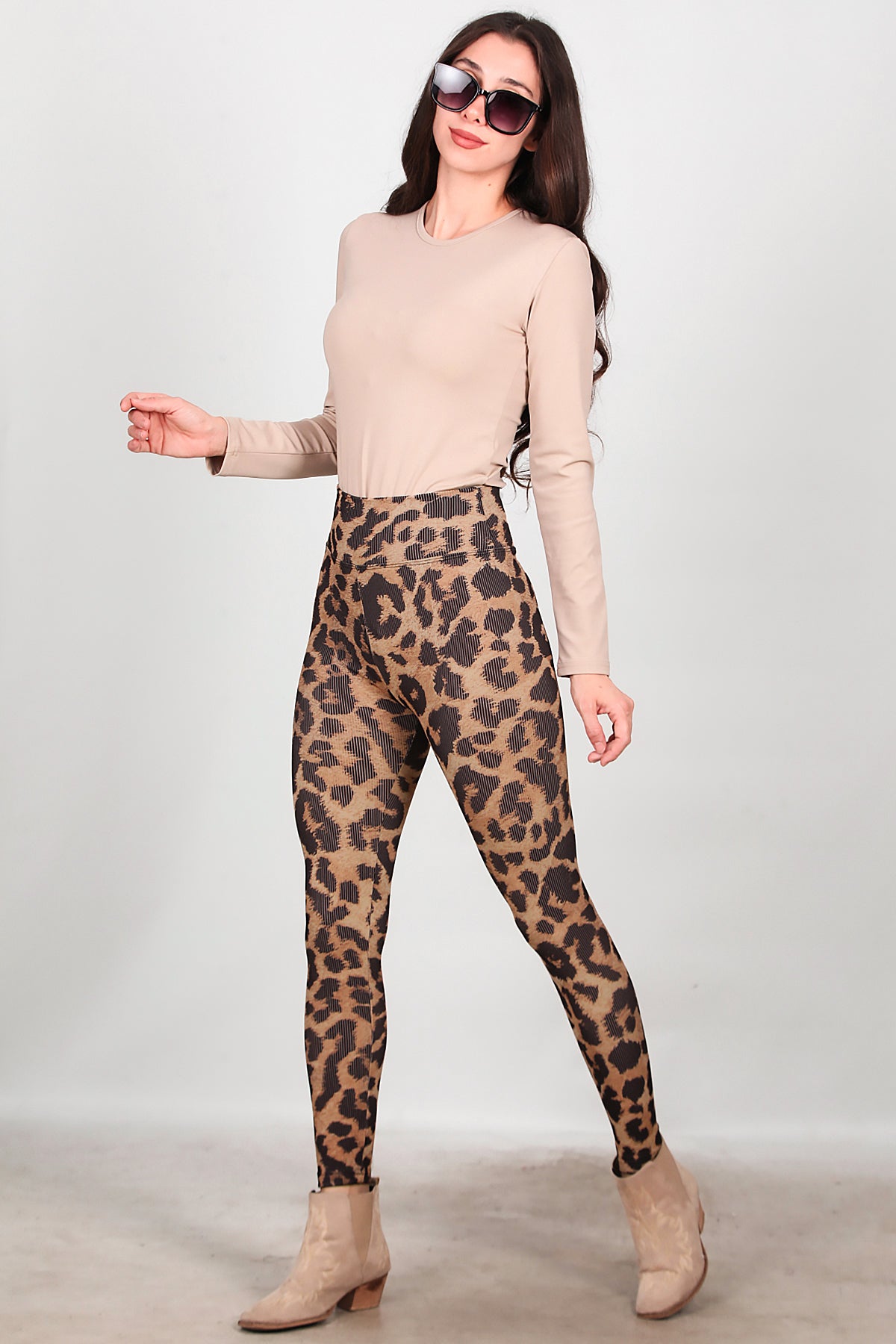 Kadın Fitilli Leopar Desenli Tayt Bej