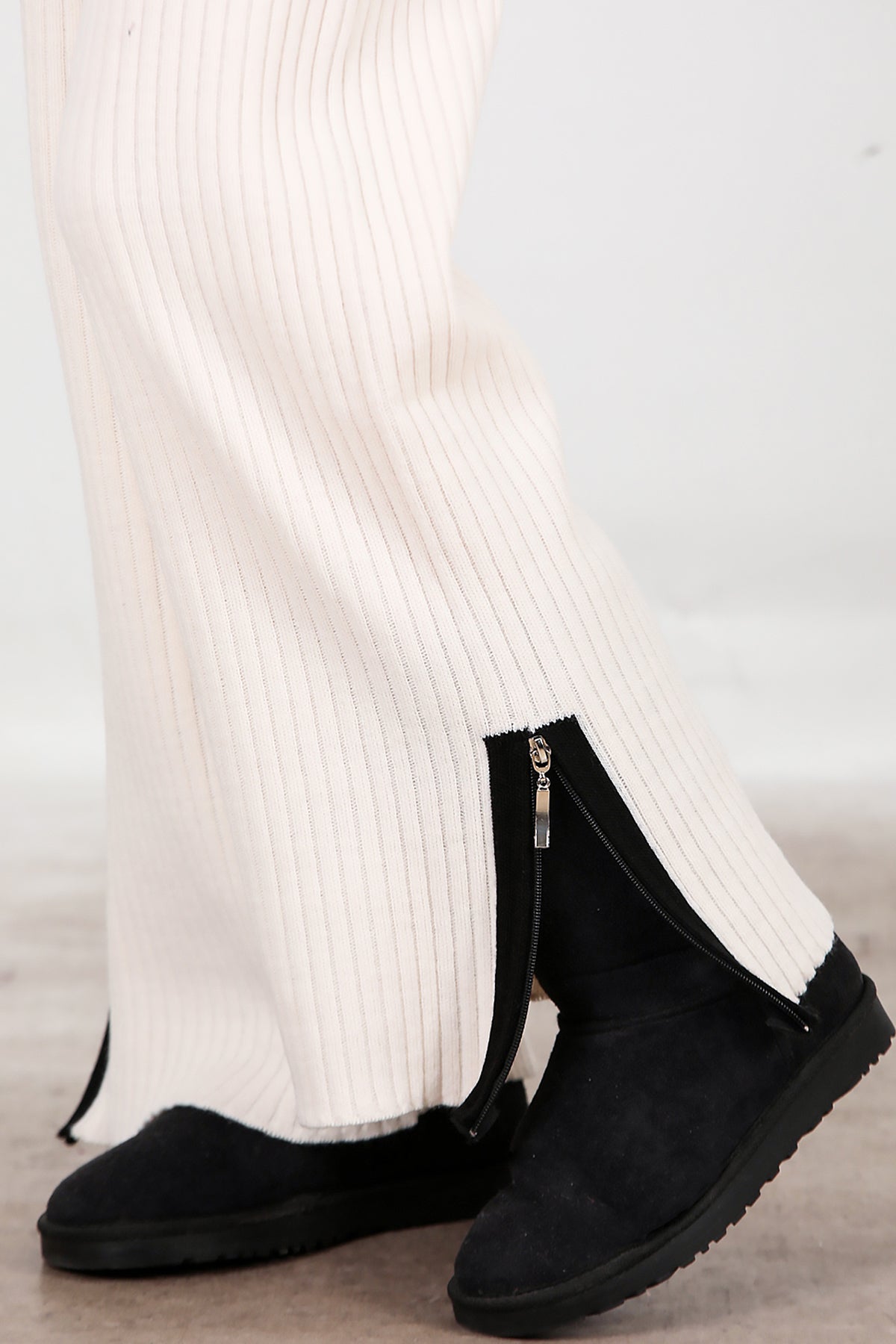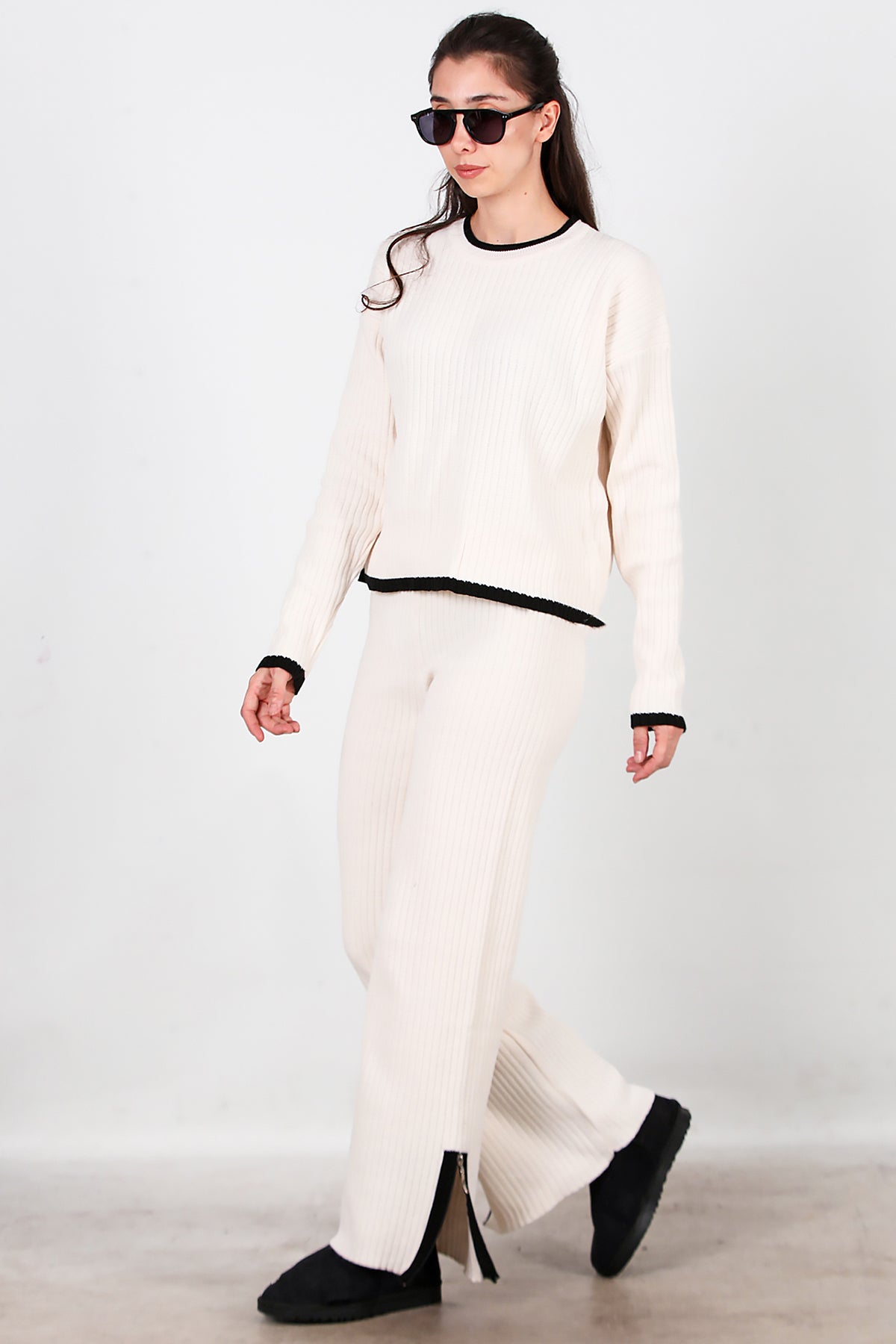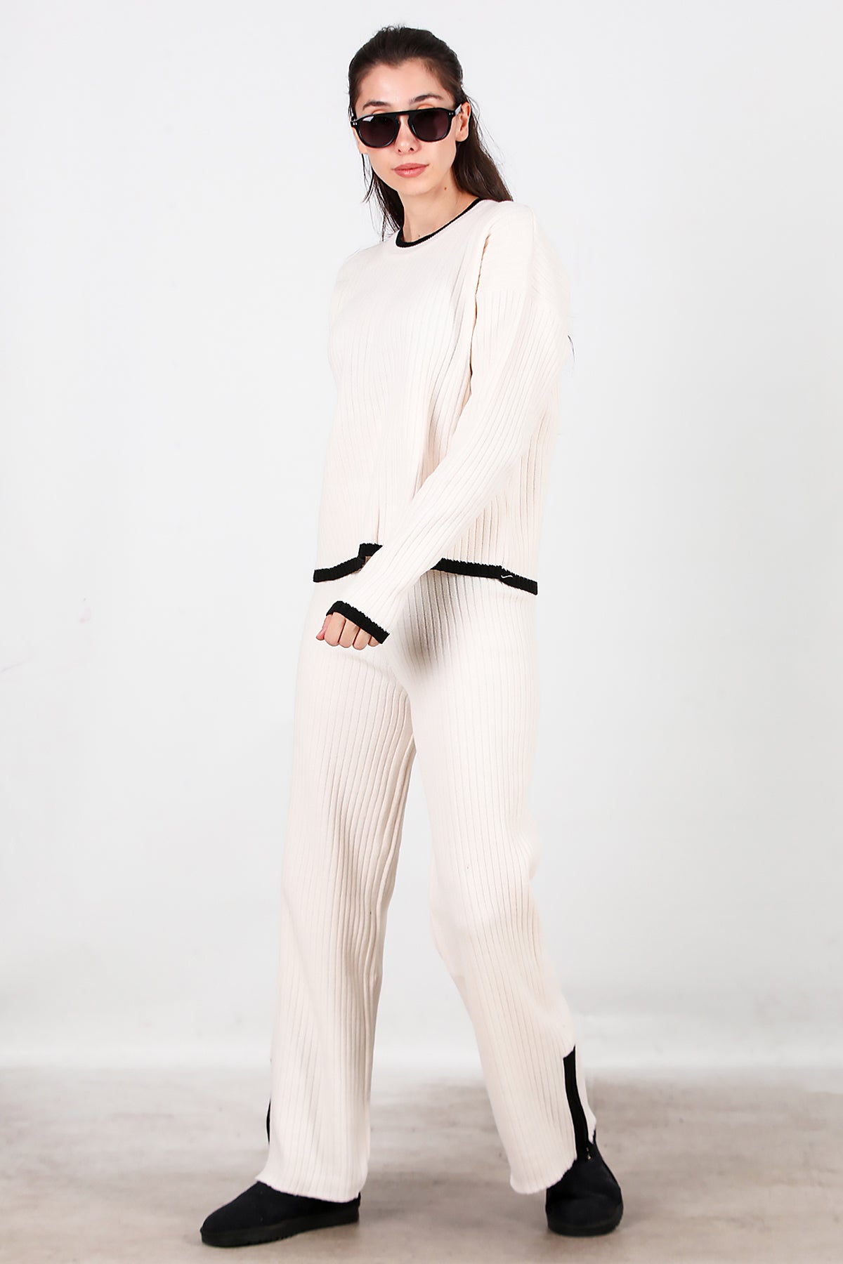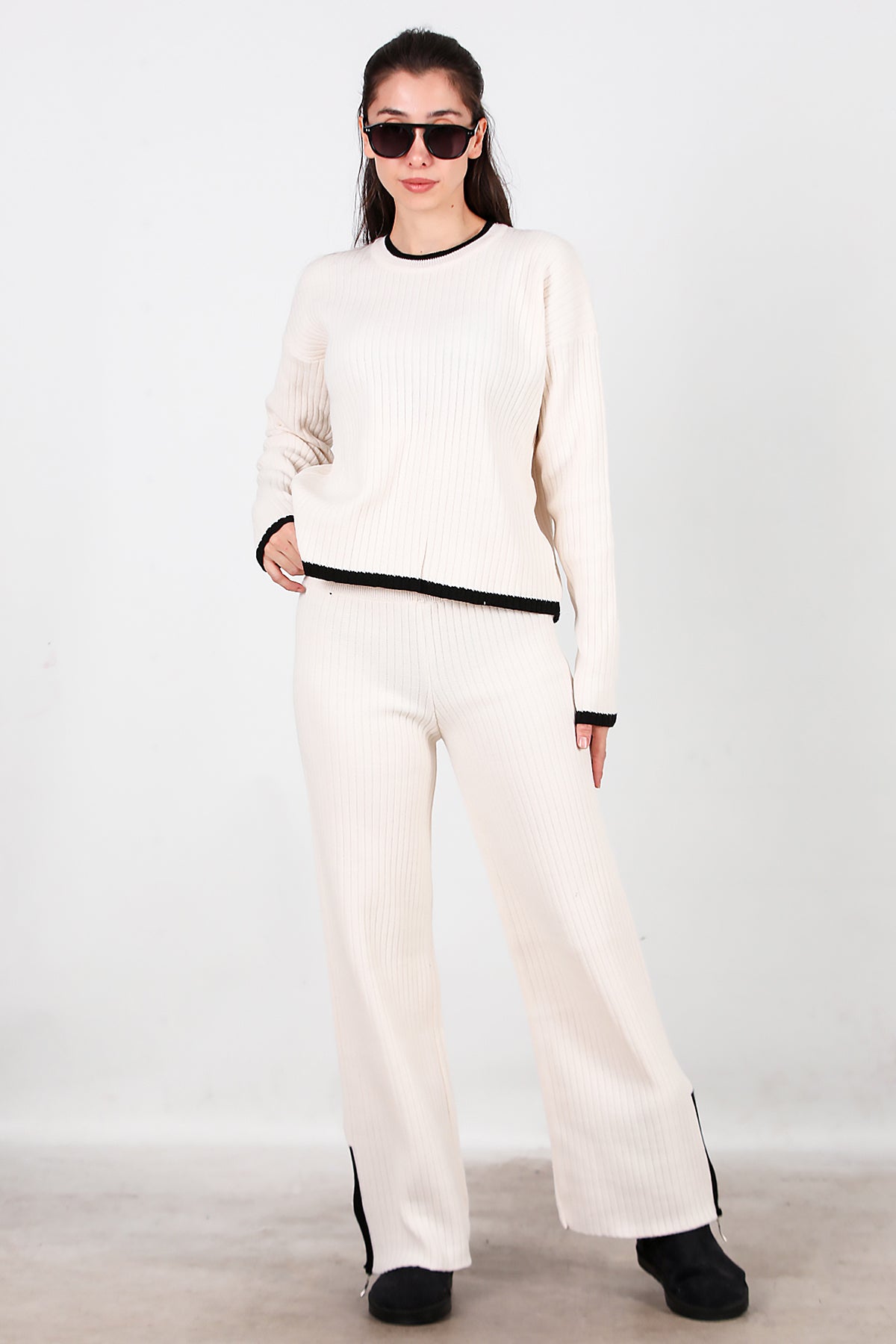 Kadın Garnili Paça Fermuarlı Triko Takım Ekru