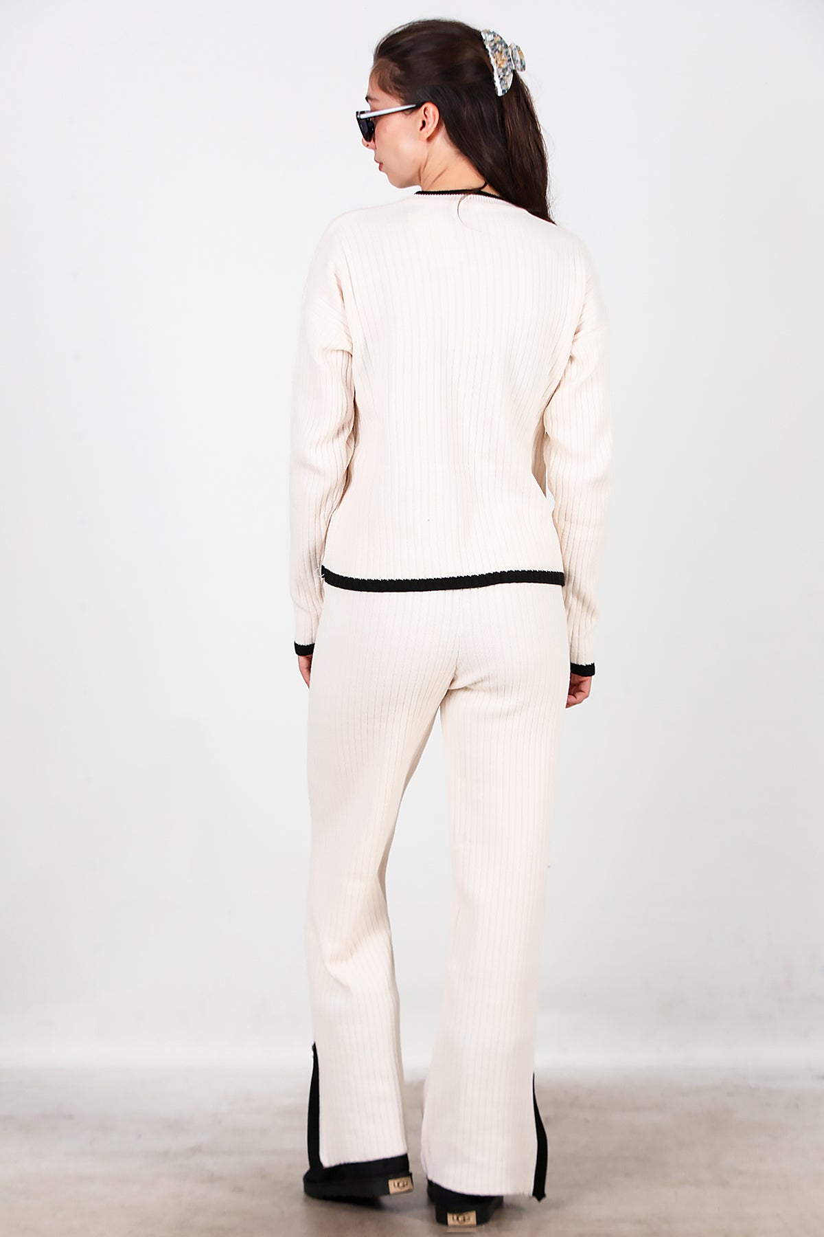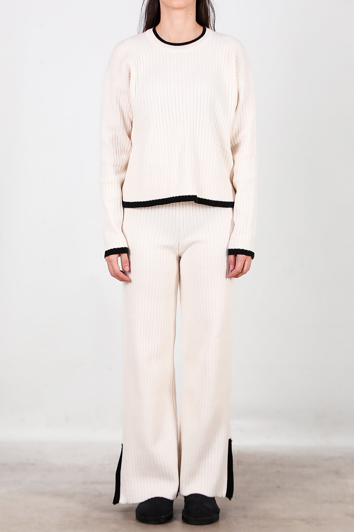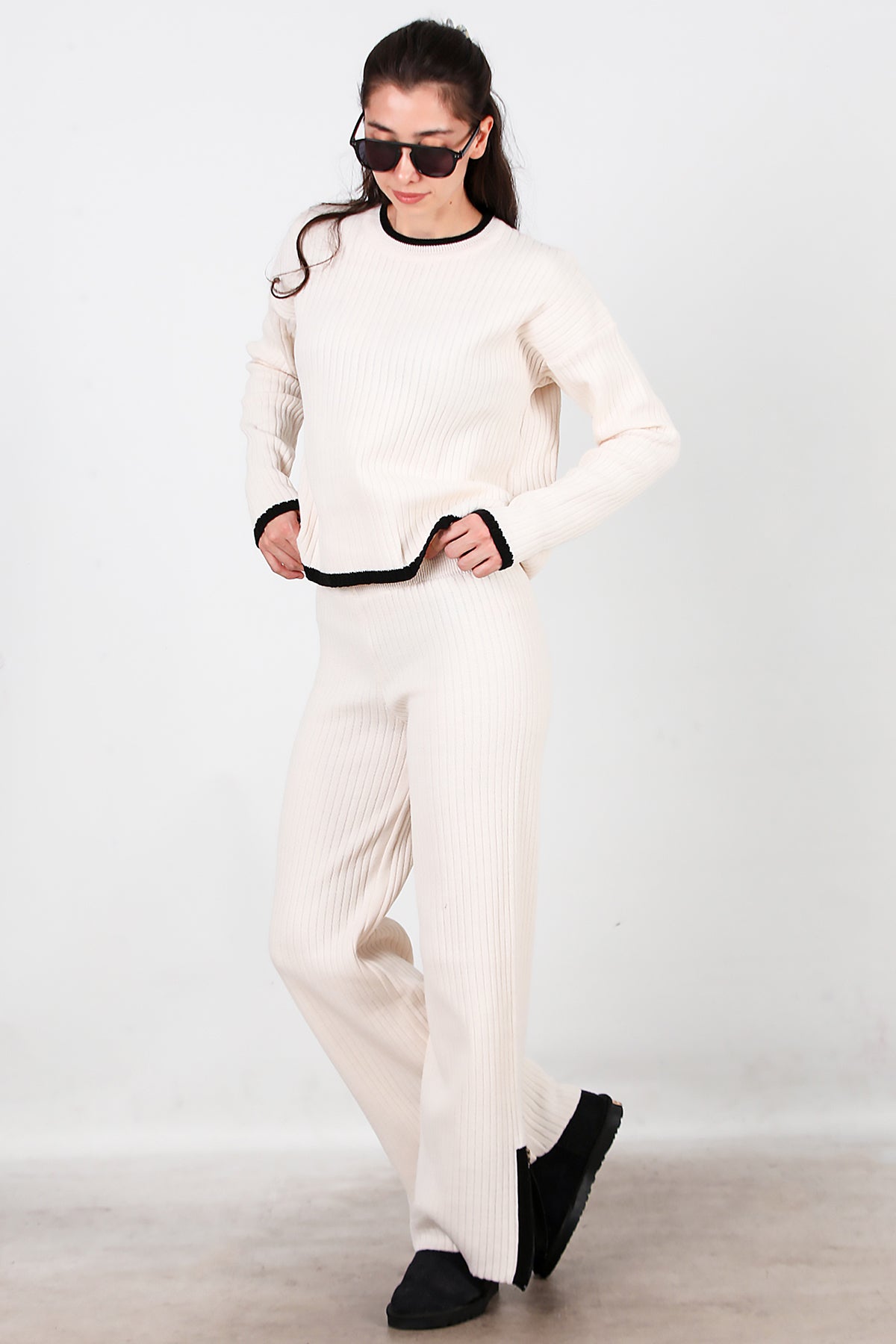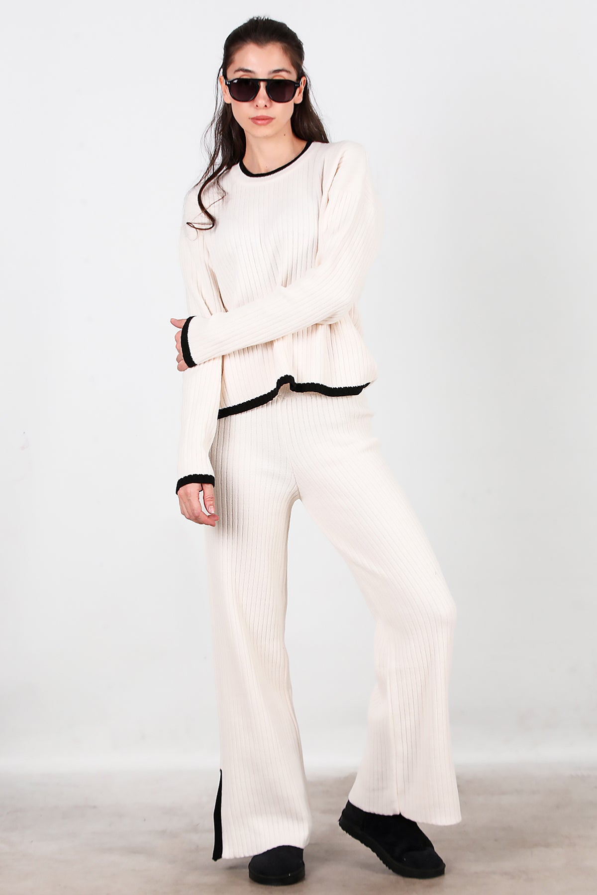 Kadın Garnili Paça Fermuarlı Triko Takım Ekru