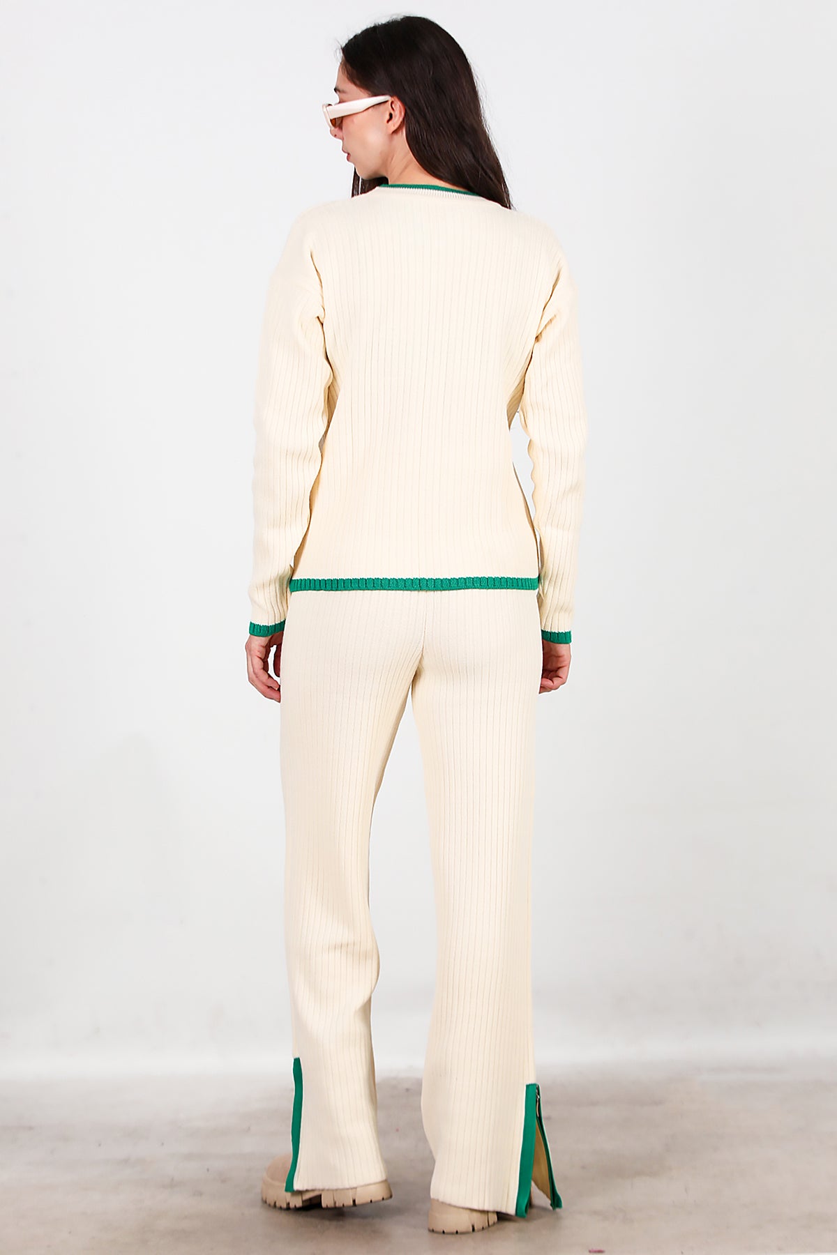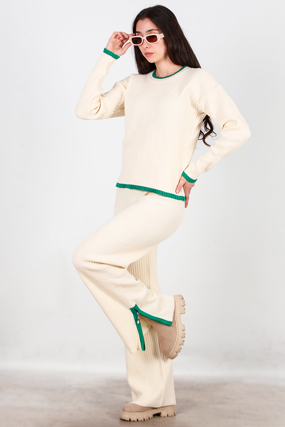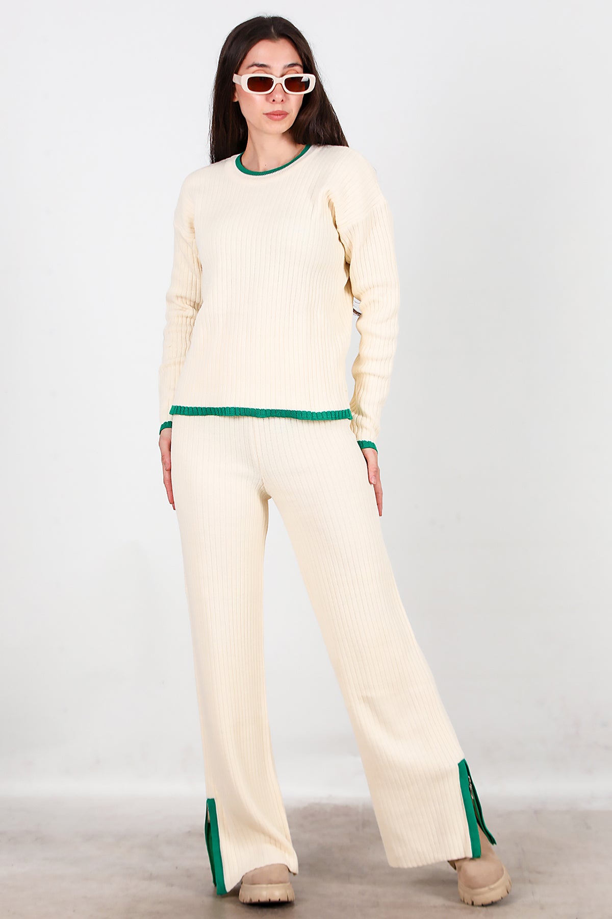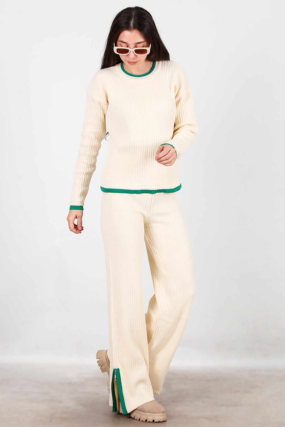 Kadın Garnili Paça Fermuarlı Triko Takım Yeşil