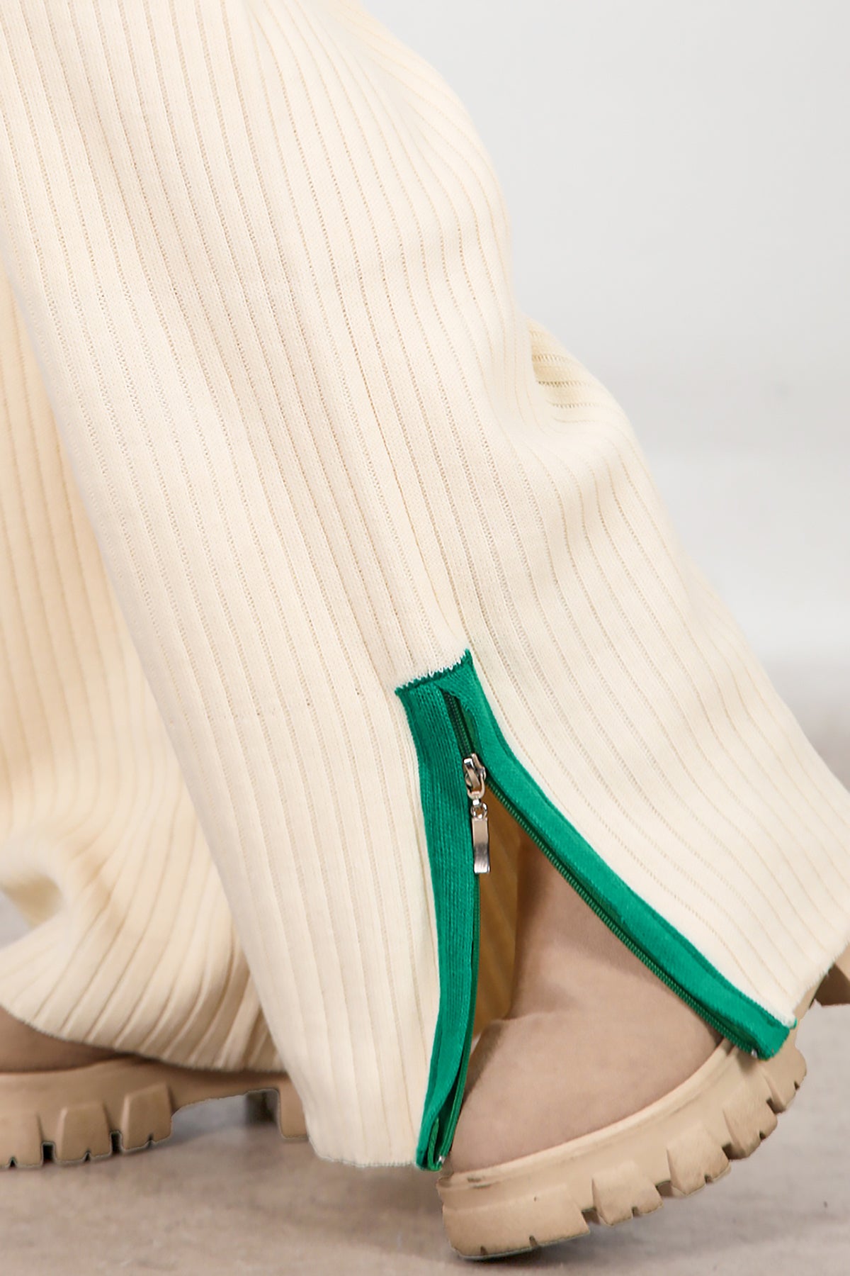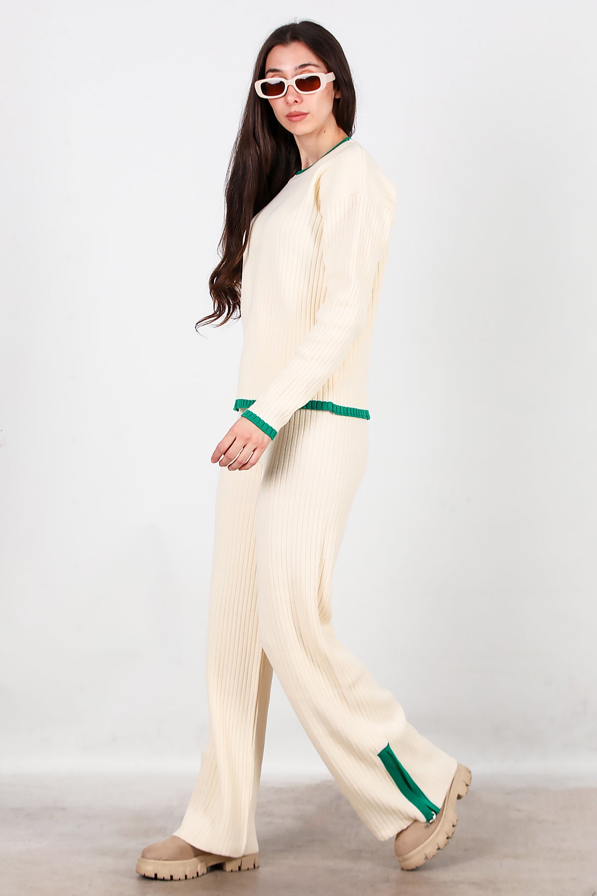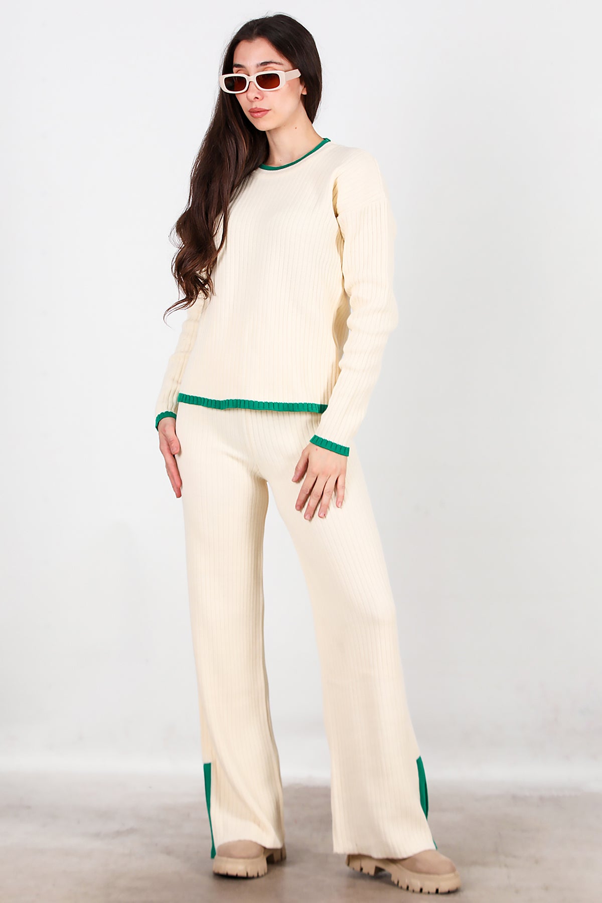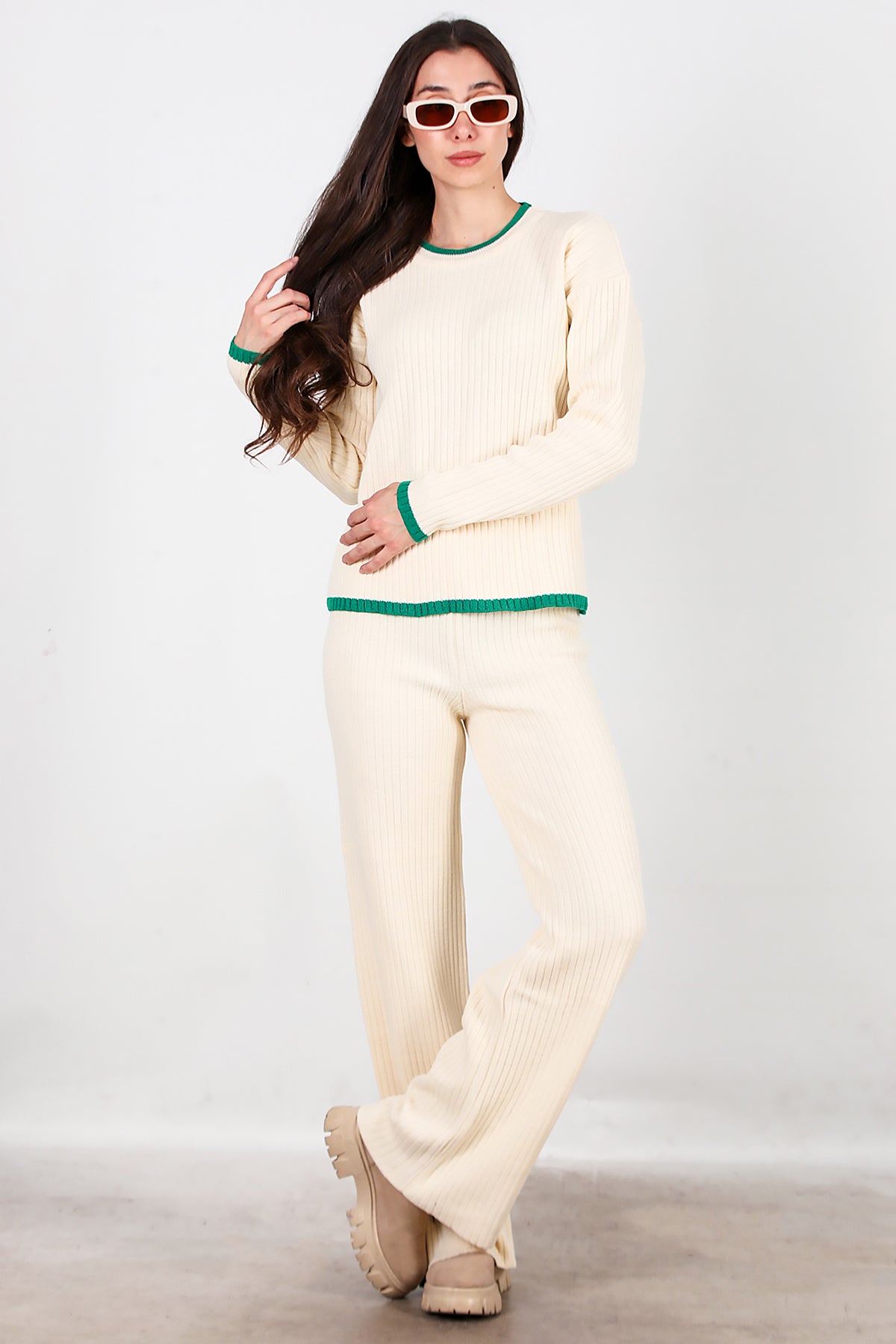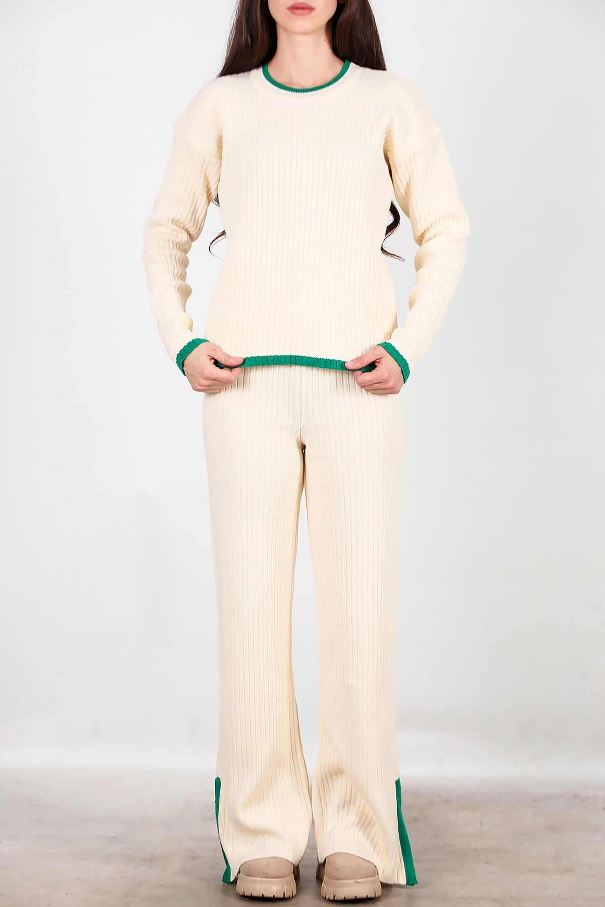 Kadın Garnili Paça Fermuarlı Triko Takım Yeşil