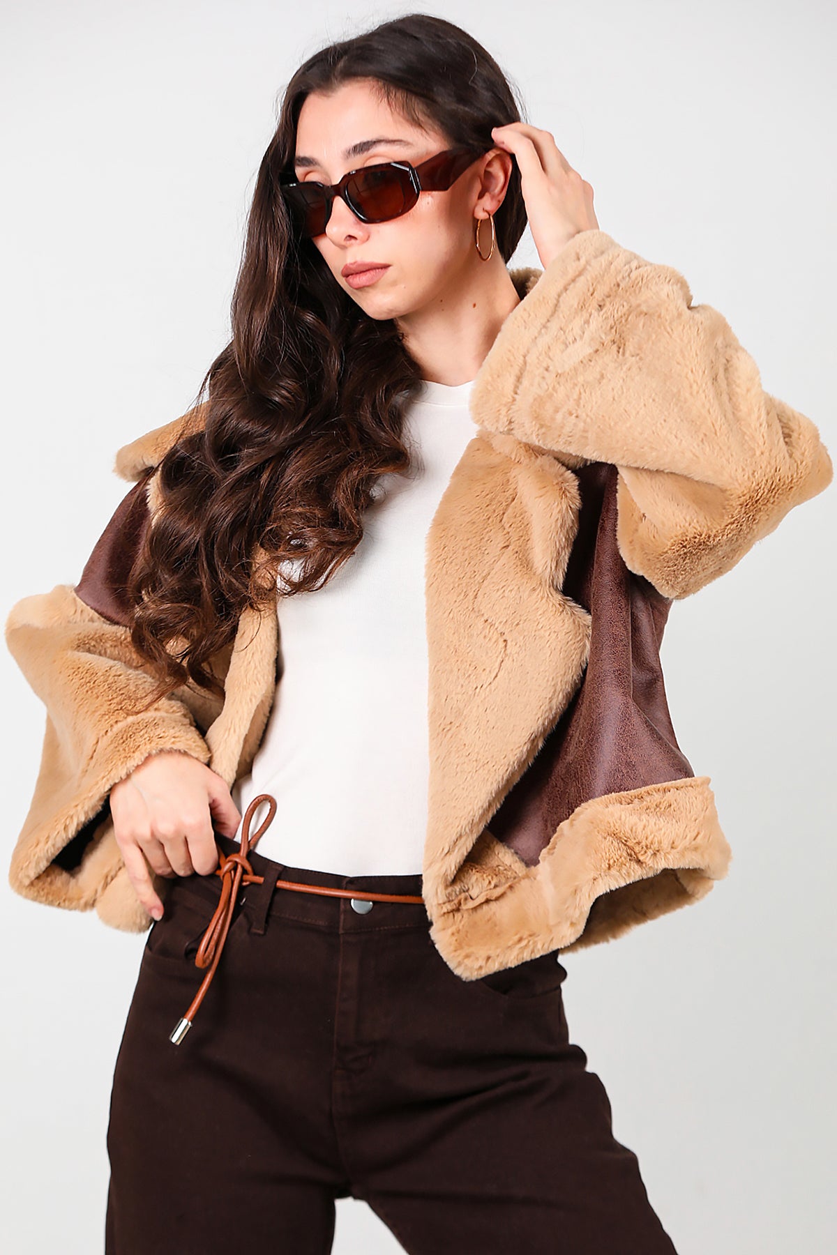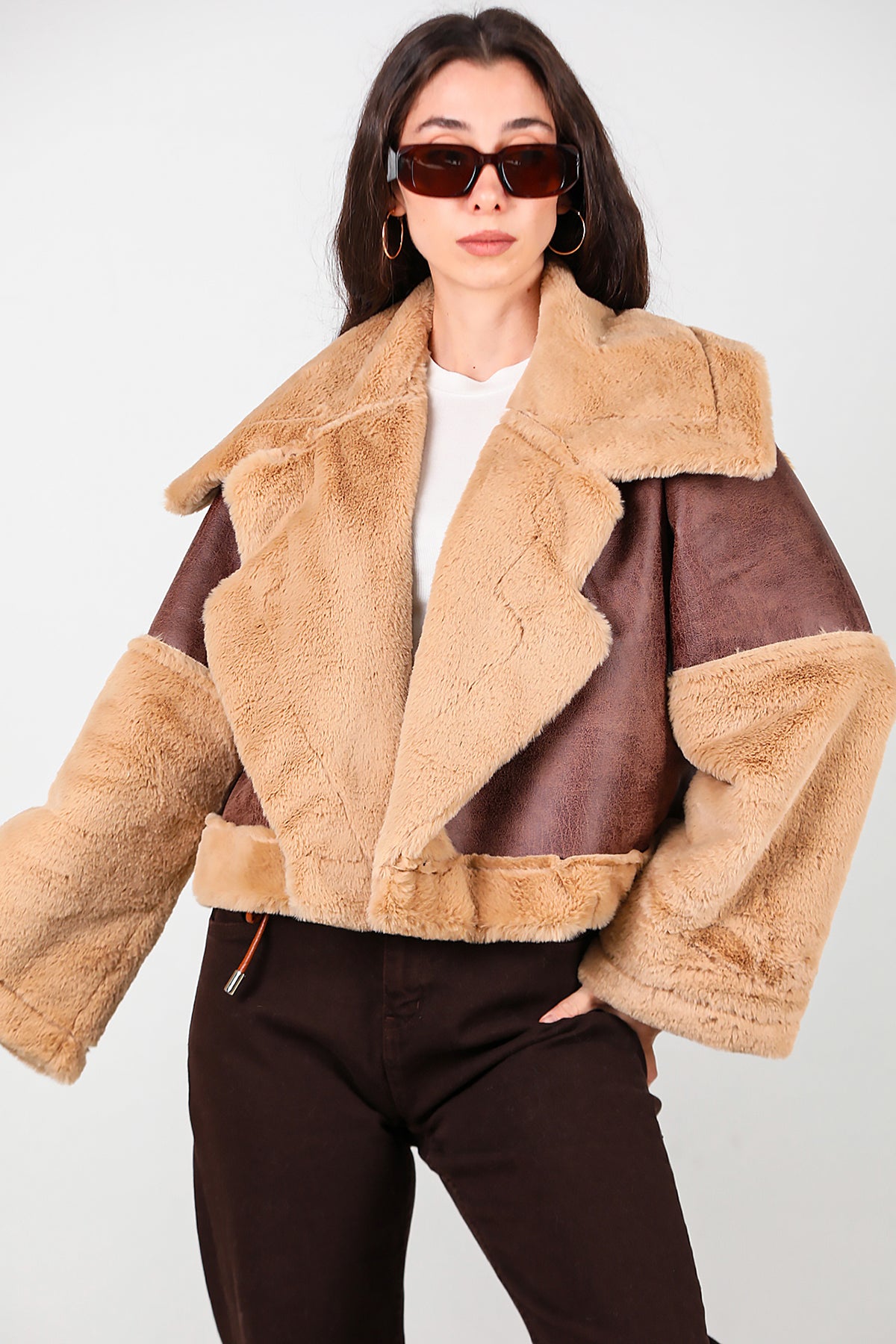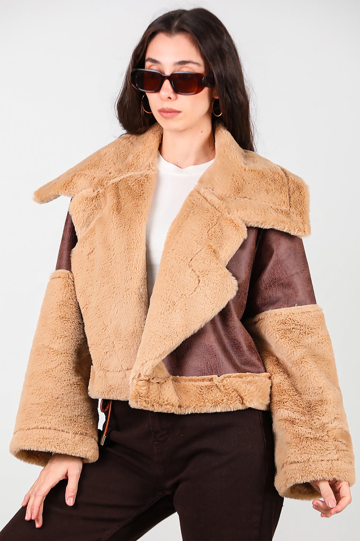 Kadın Geniş Yaka Kolu Peluş Süet Mont Kahverengi