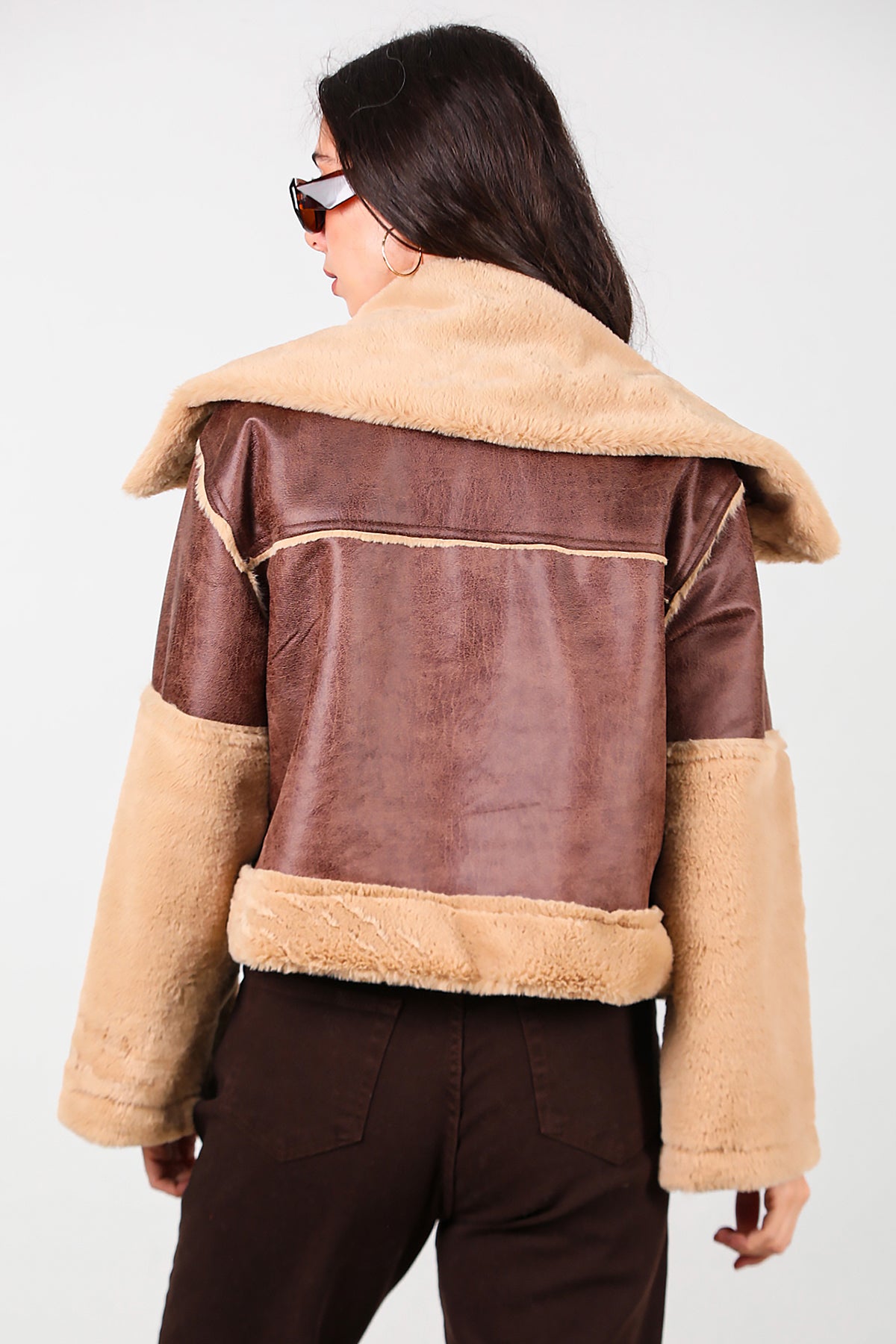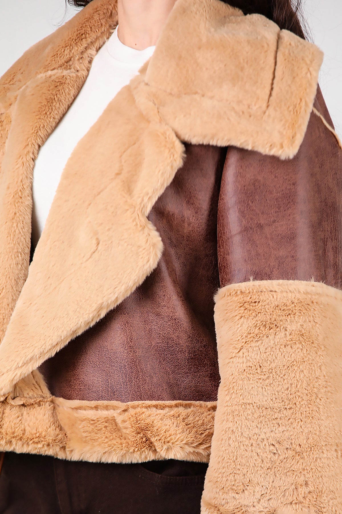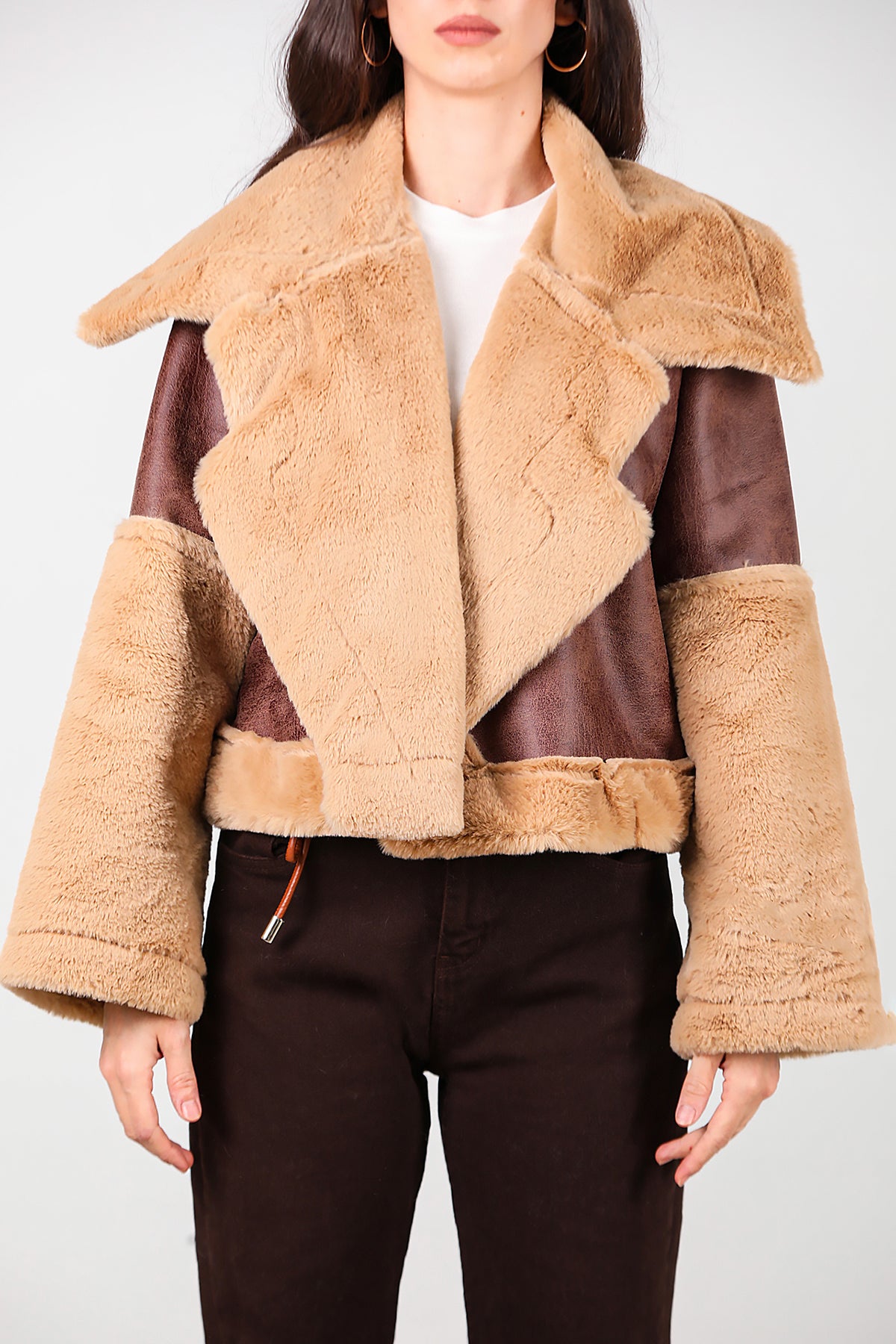 Kadın Geniş Yaka Kolu Peluş Süet Mont Kahverengi