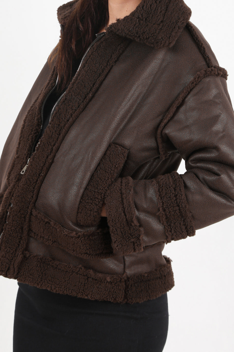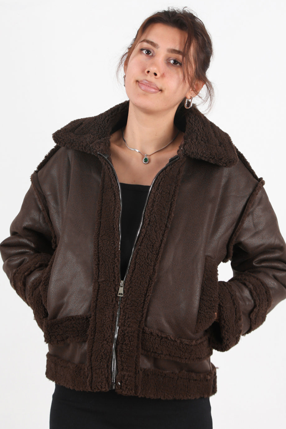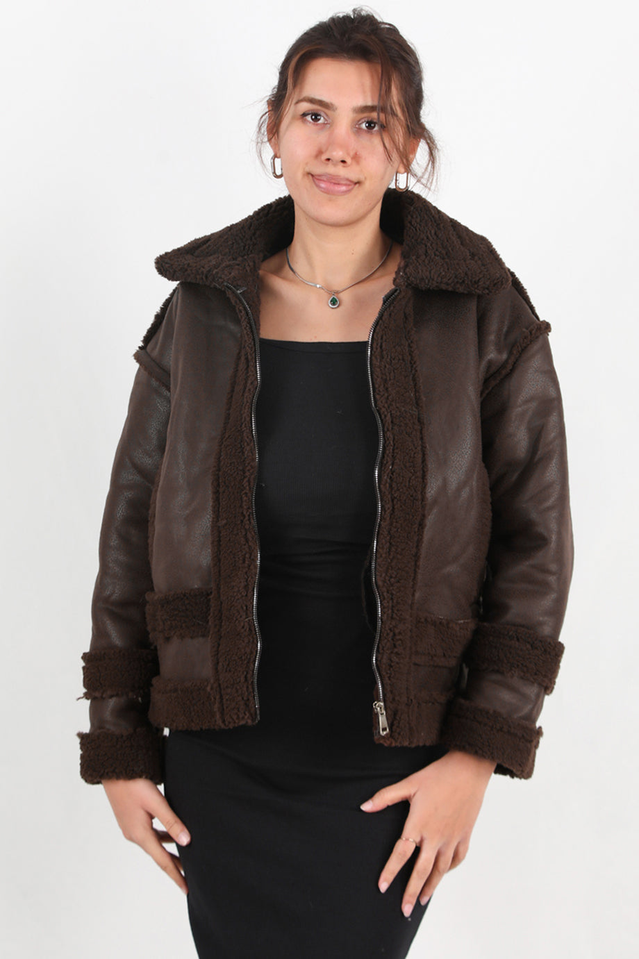Rogue Kadın İçi Kuzu Fermuarlı Deri Ceket Kahverengi