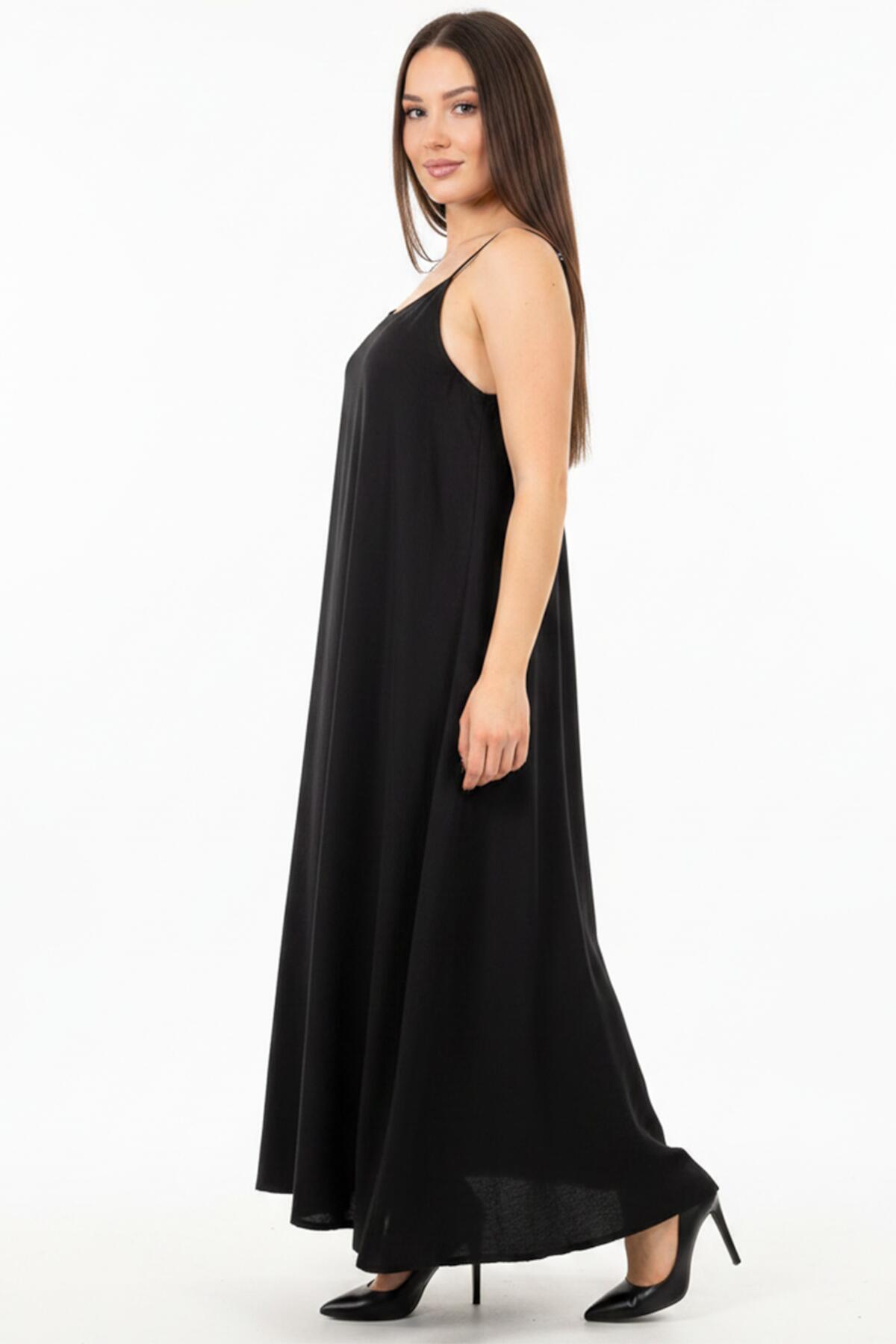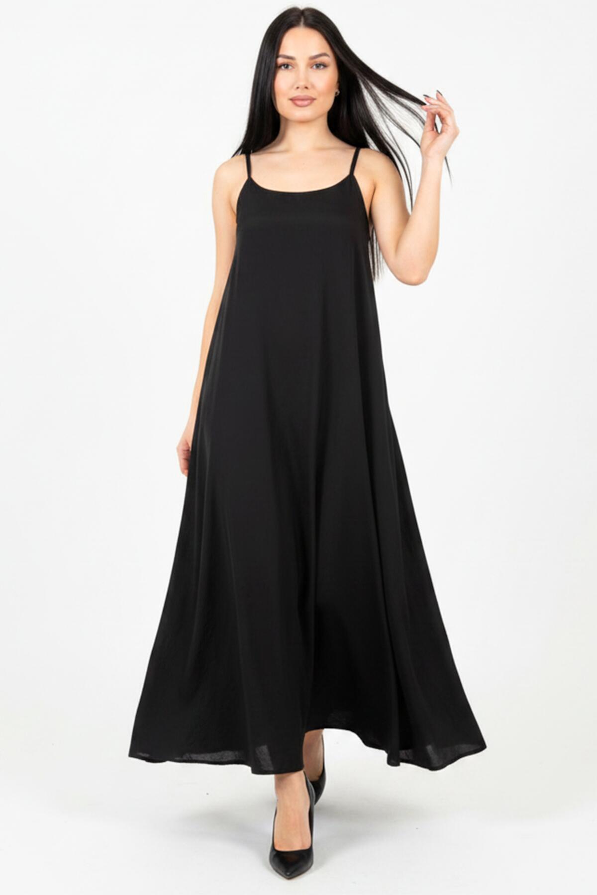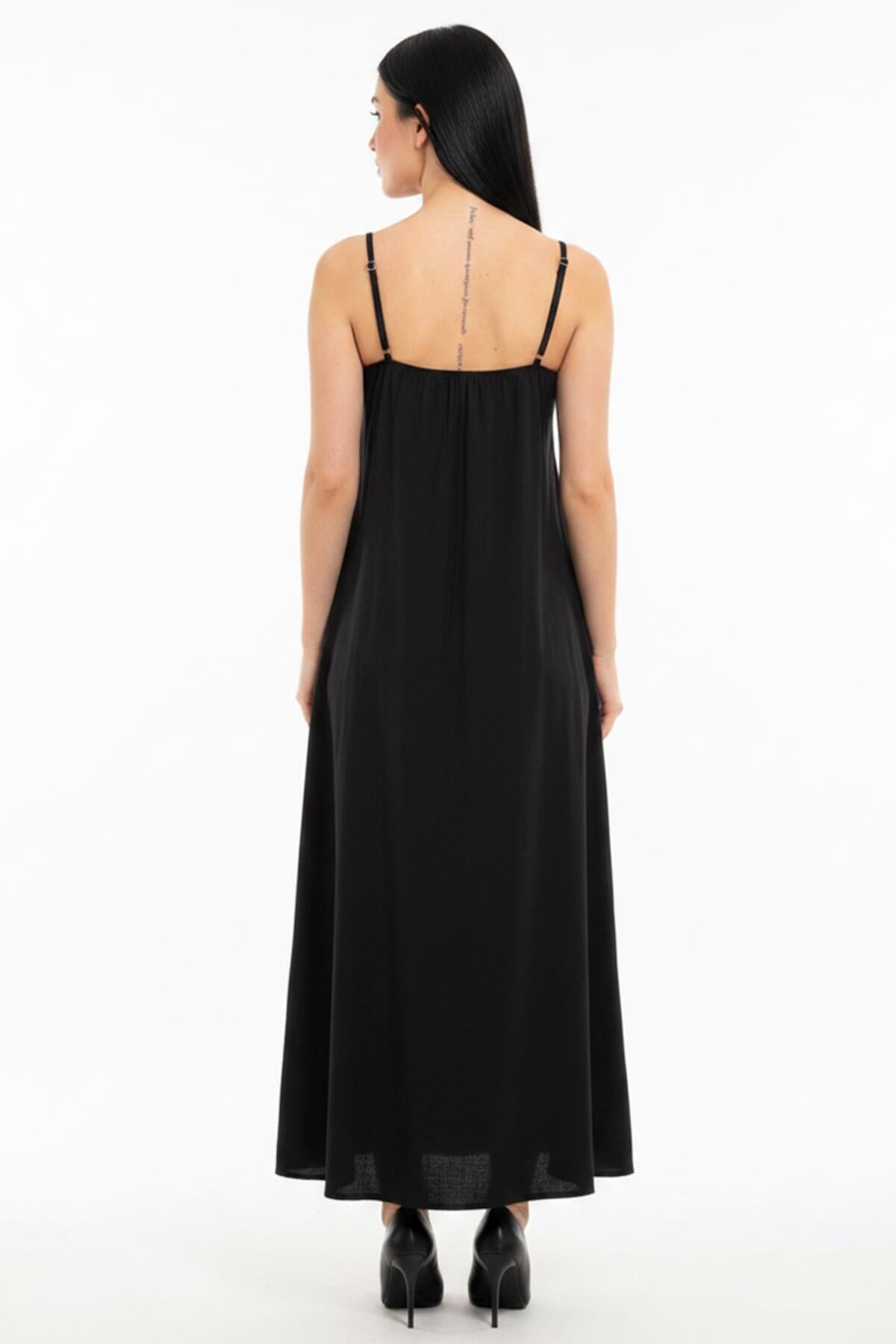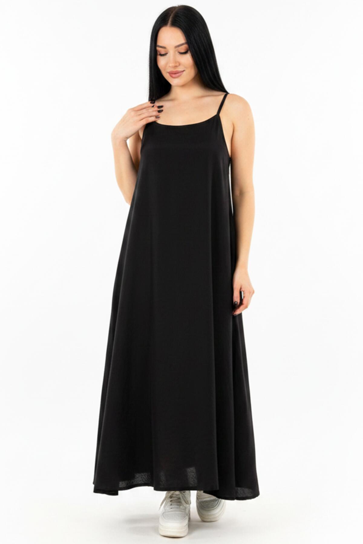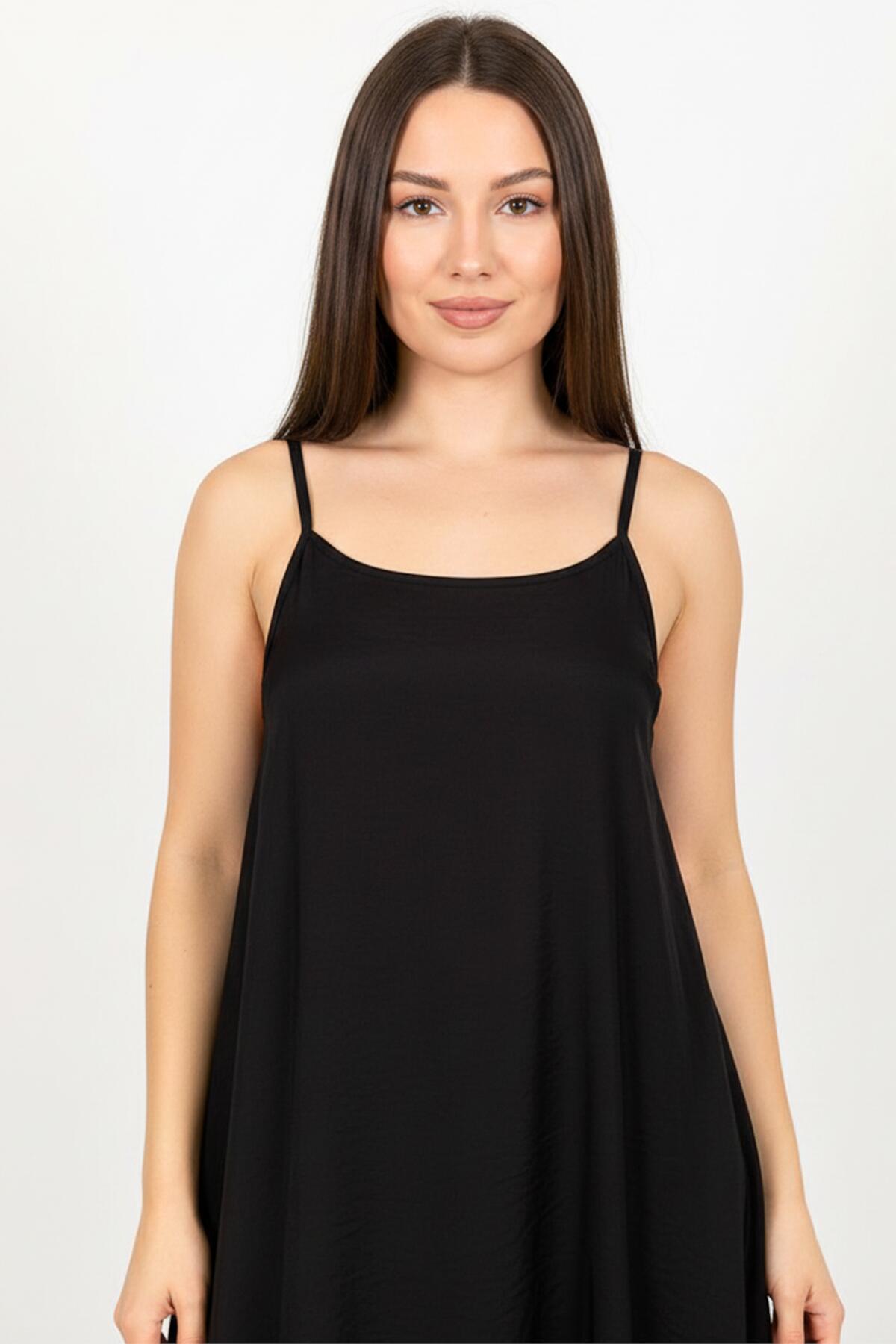 Zarafetin sadelikle buluştuğu bu siyah salaş elbise, her ortamda şık görünmenizi sağlar. İnce askılı tasarımı ve A-line kesimiyle hem rahat hem de feminen bir siluet sunar. Dökümlü kumaşı sayesinde gün boyu ferah hissettirirken, maxi boyu ile sofistike bir görünüm yaratır.