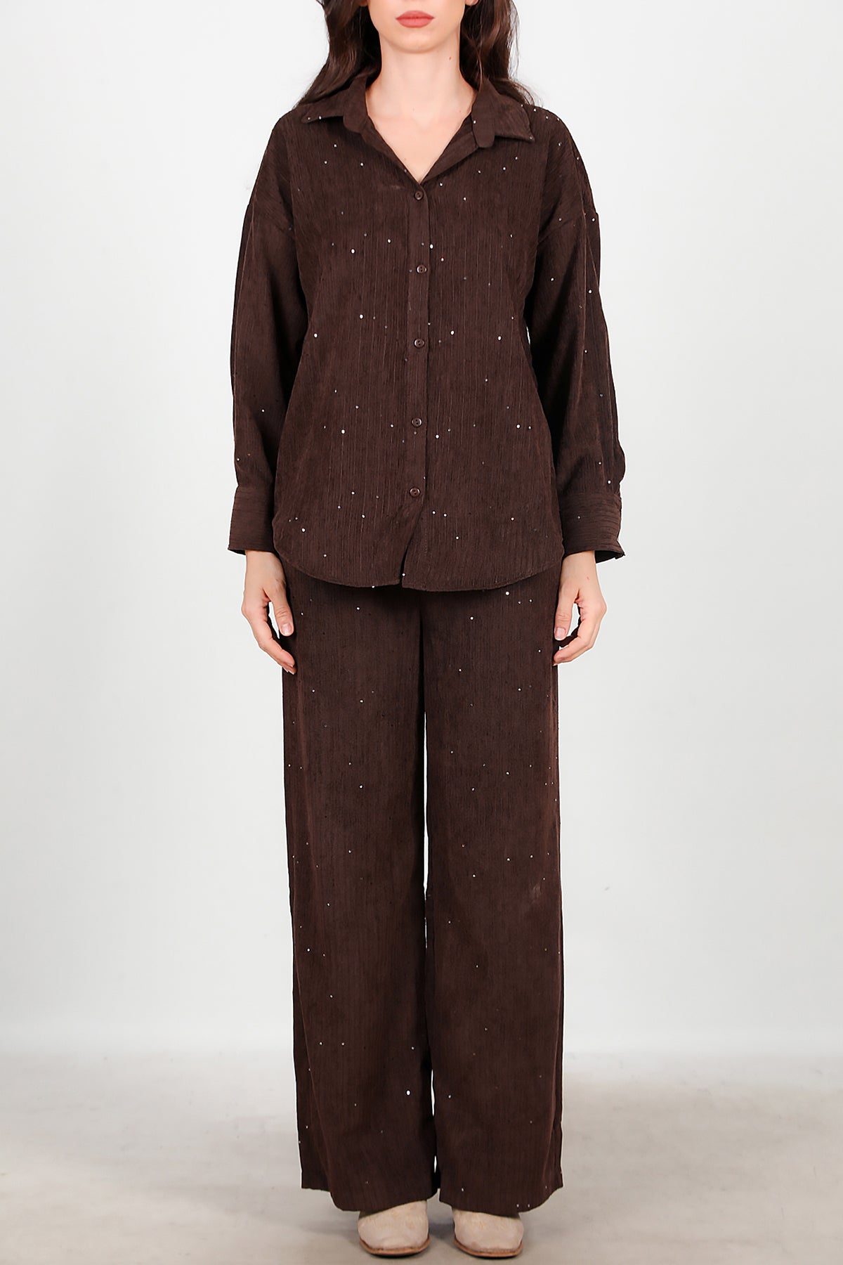 Kadın Kadife Pullu Pantolon Kahverengi