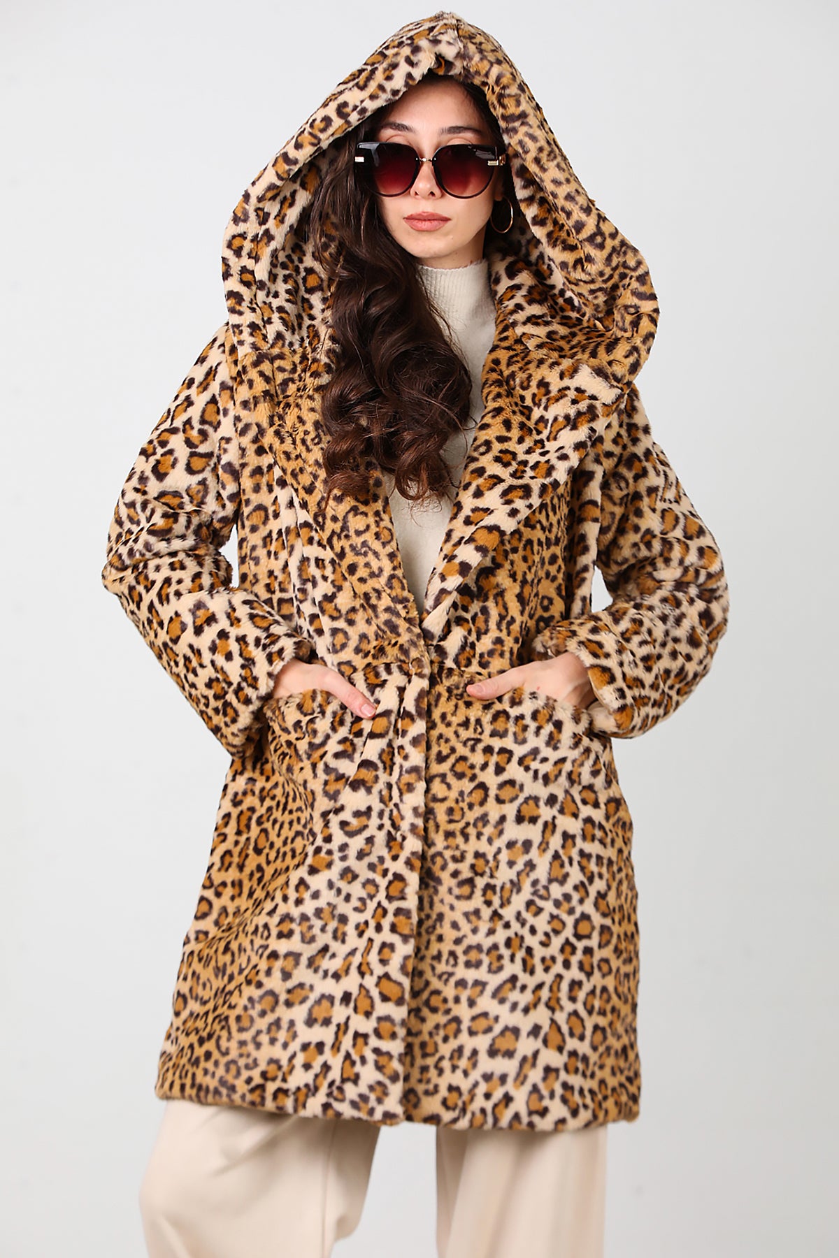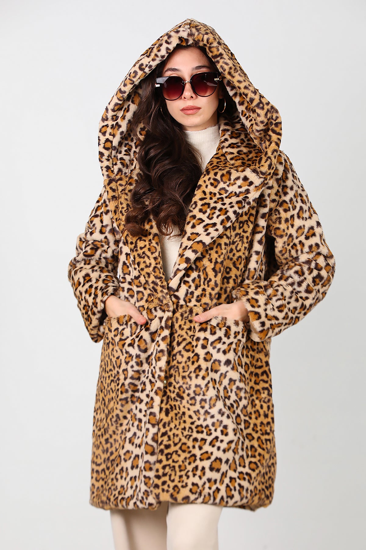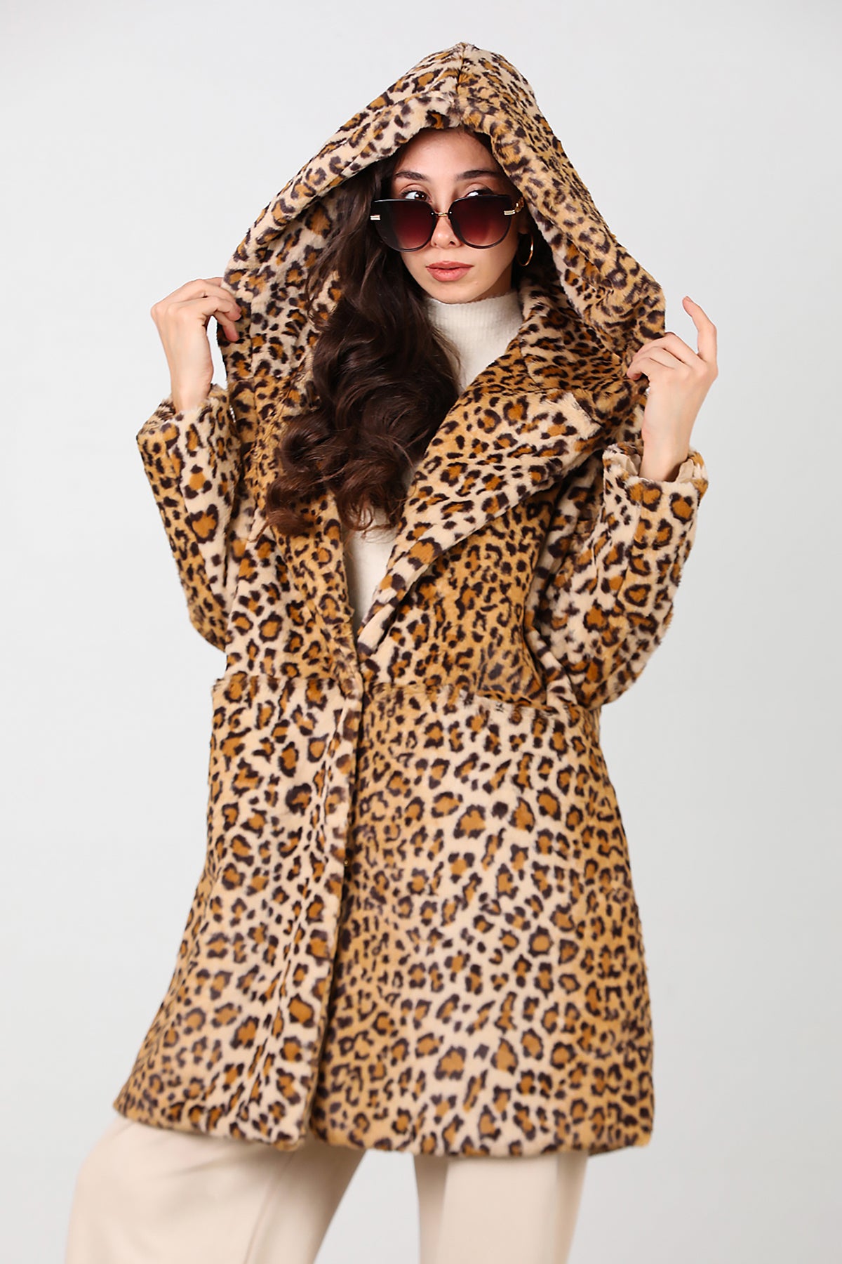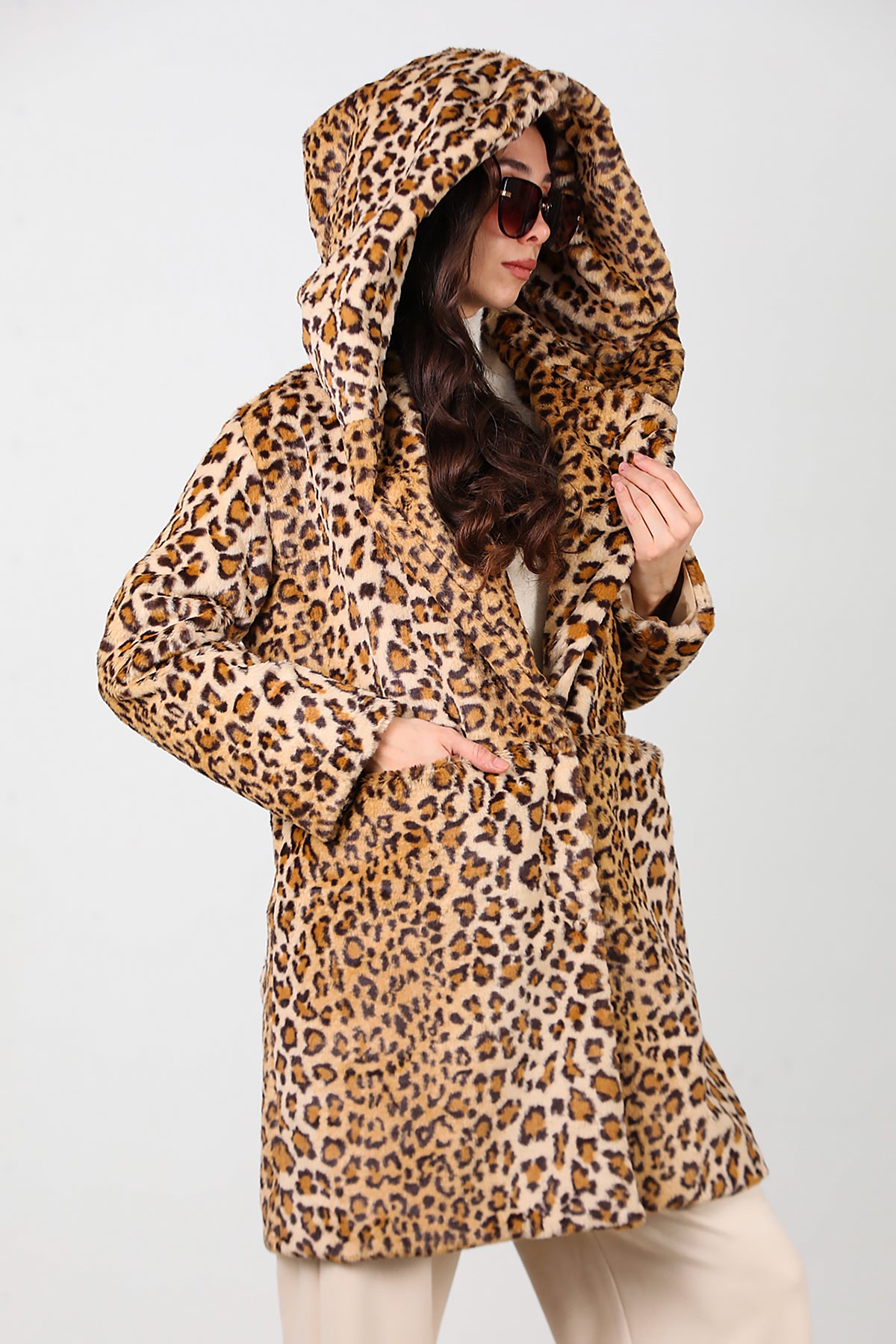 Kadın Kapşonlu Cepli Leopar Kürk Mont
