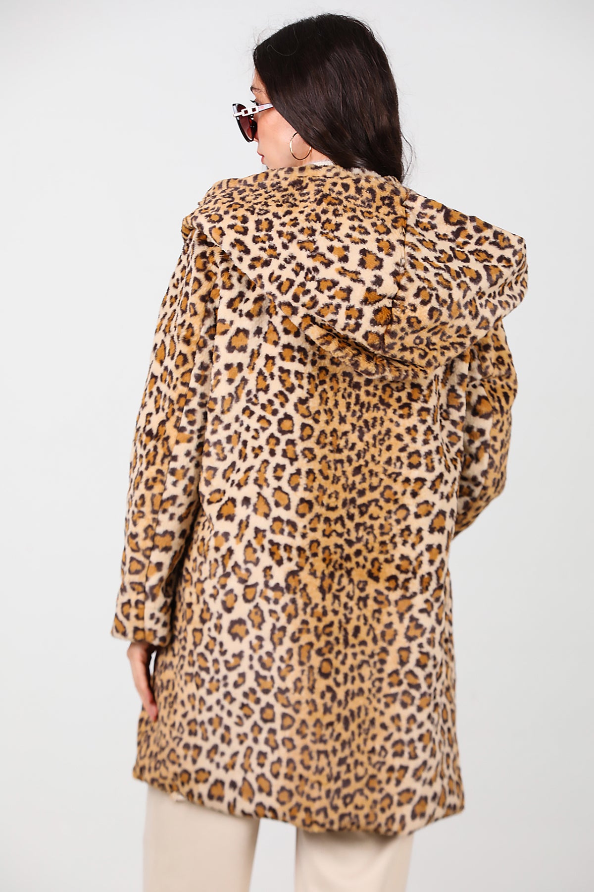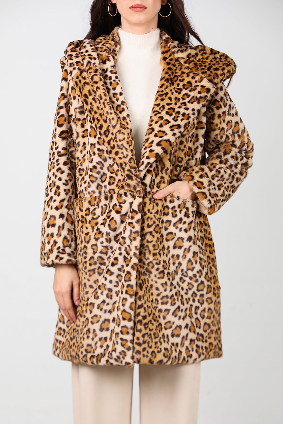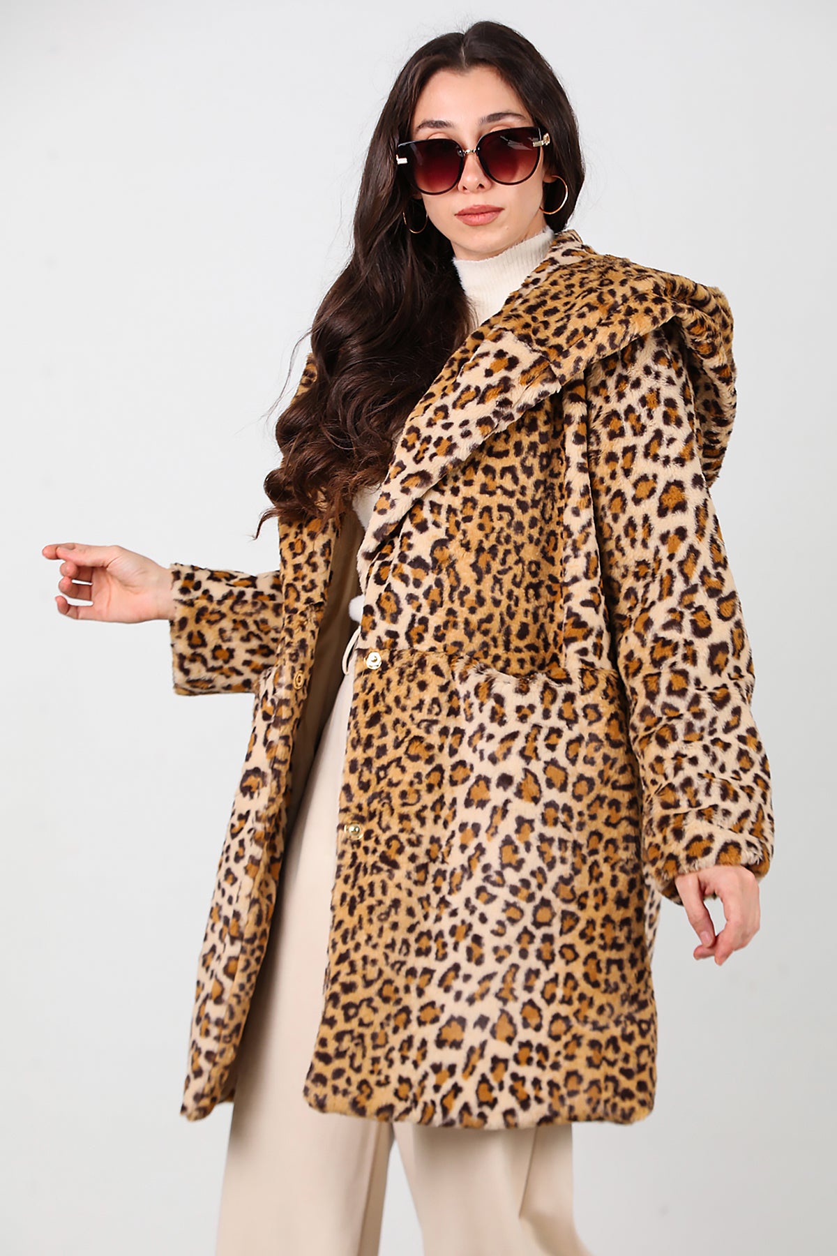 Kadın Kapşonlu Cepli Leopar Kürk Mont