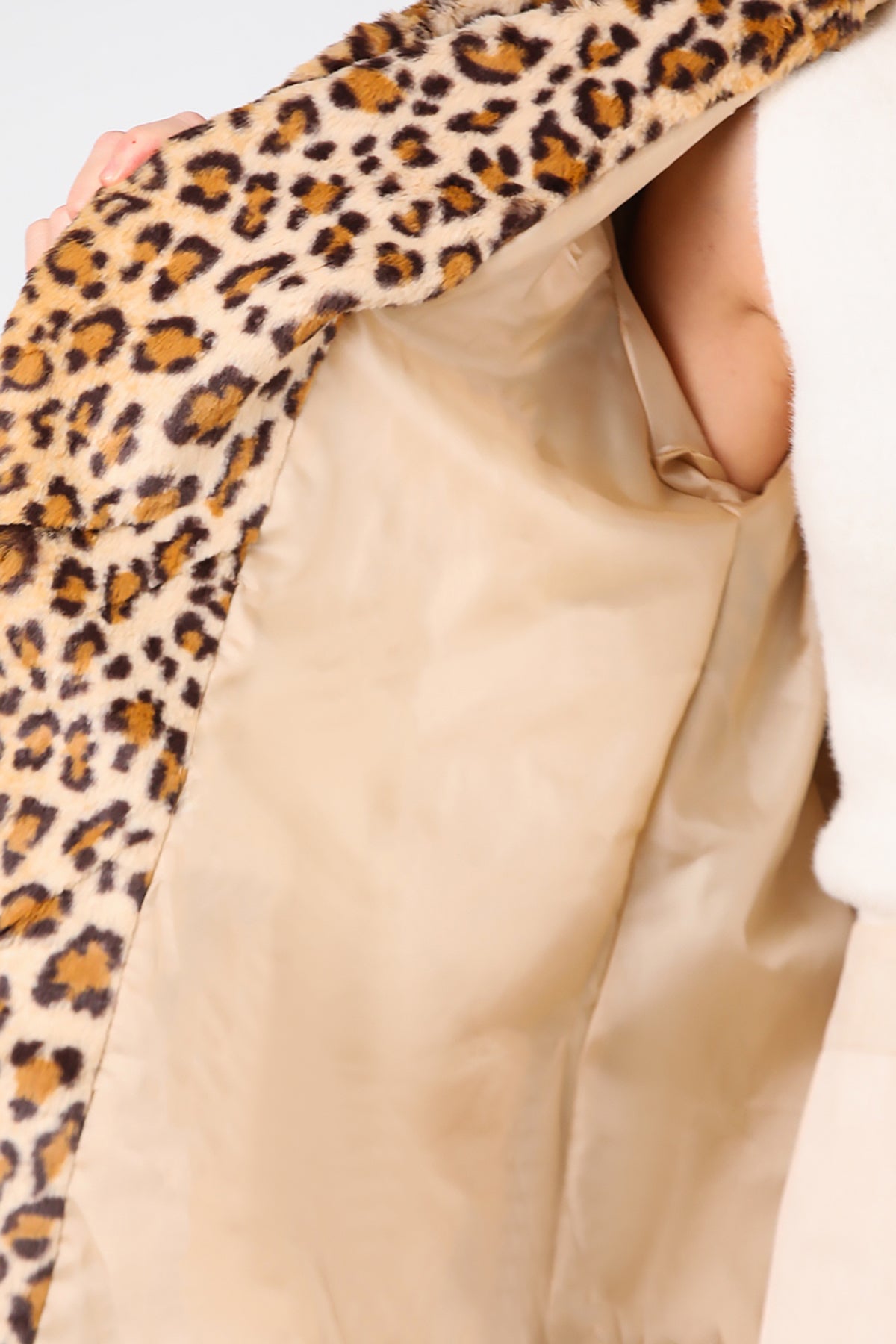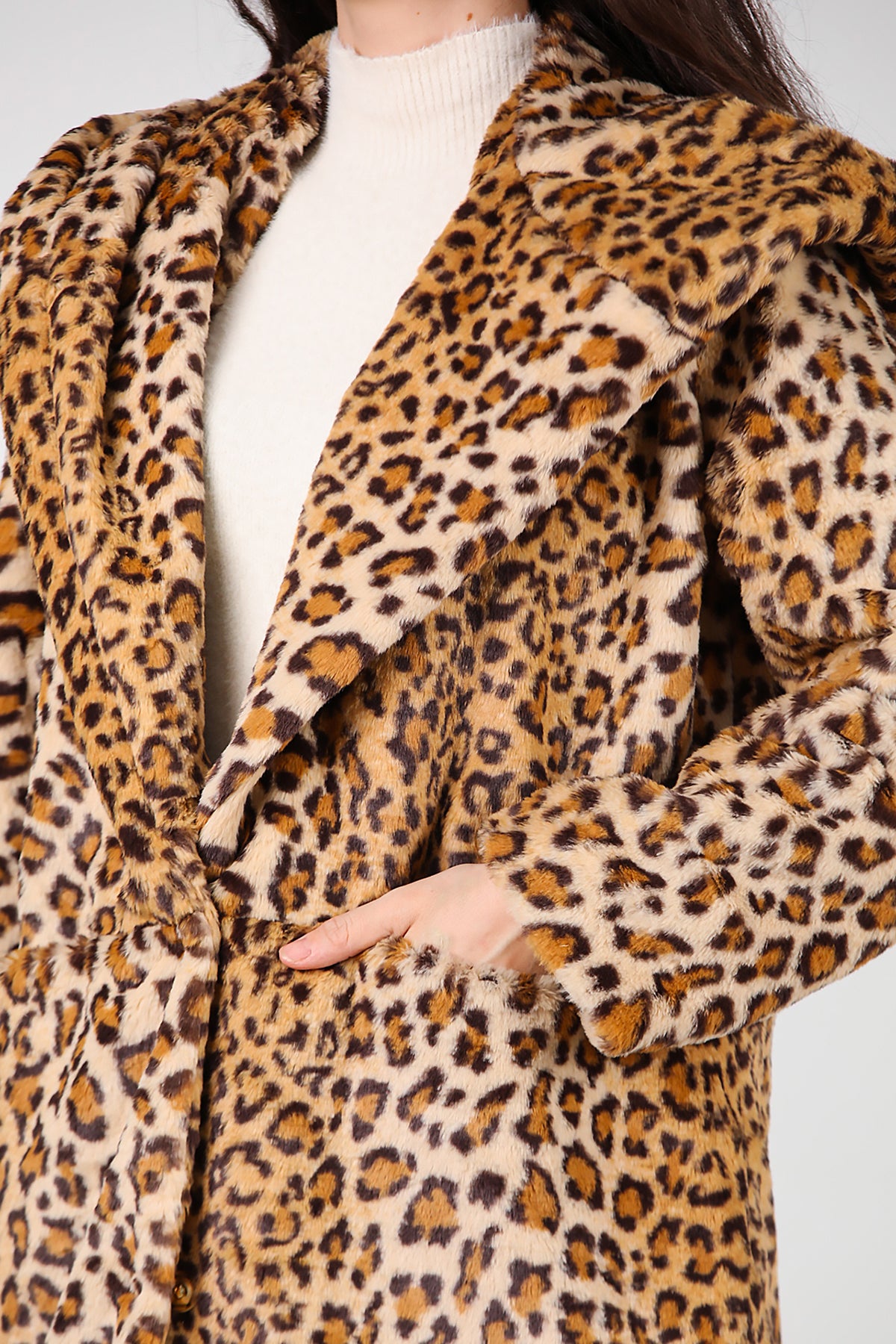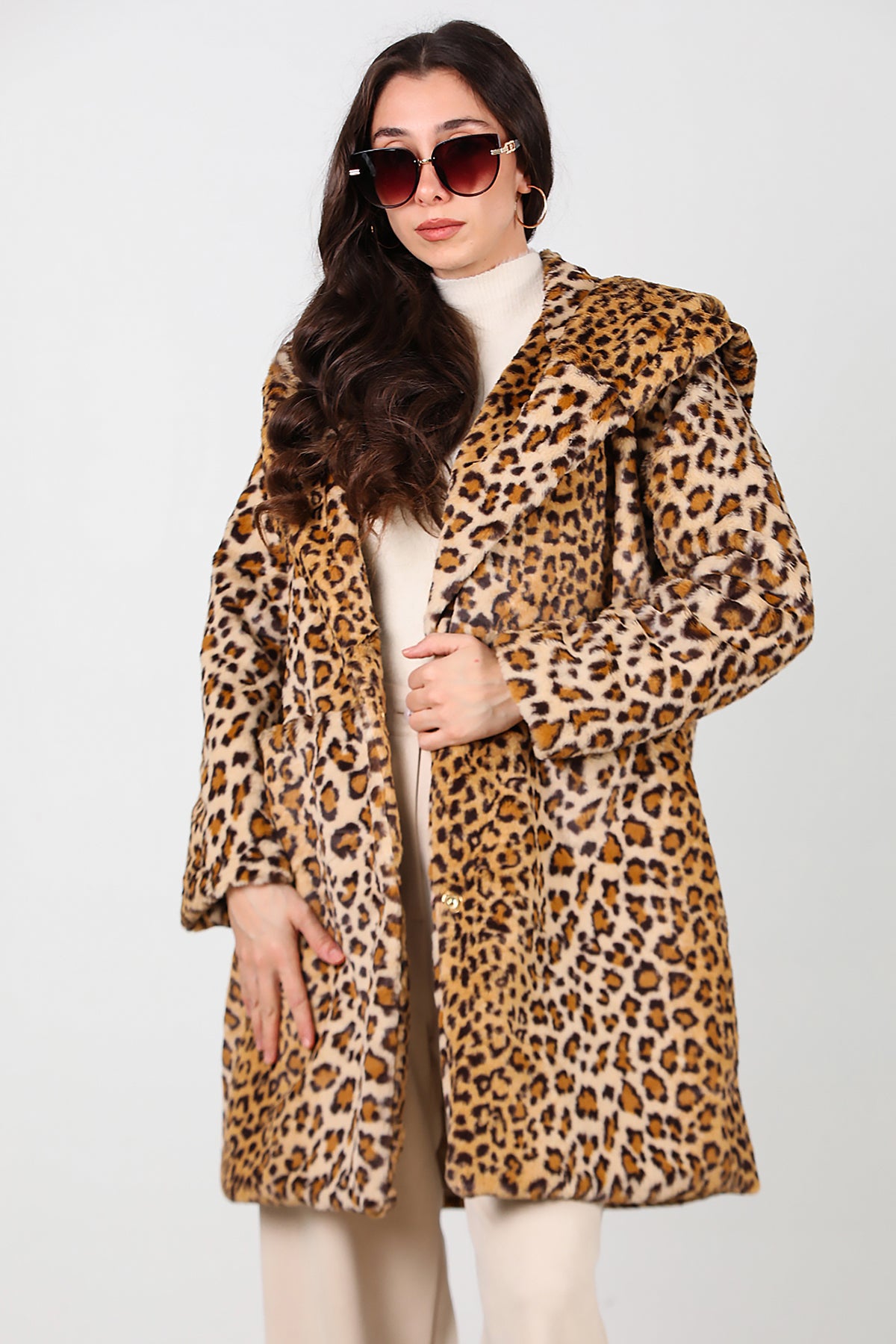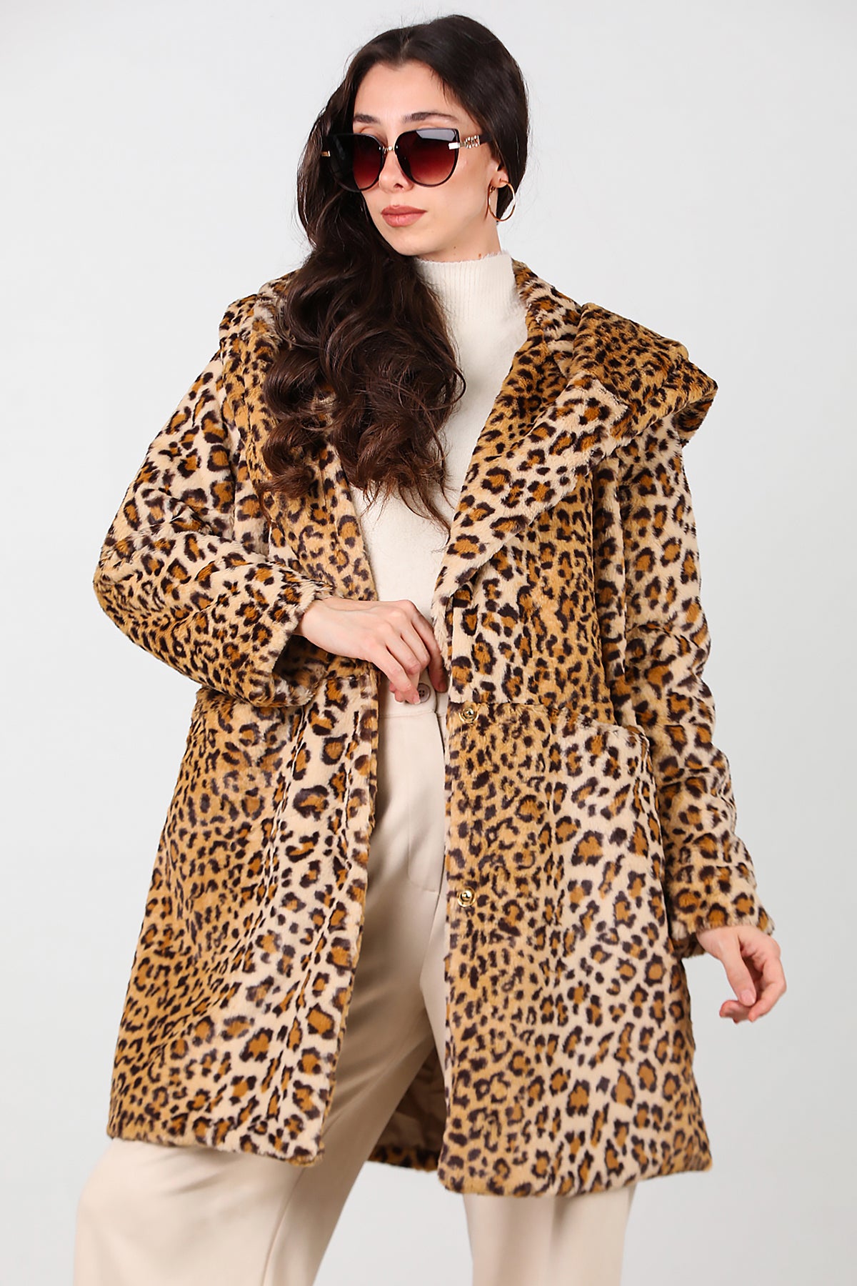 Kadın Kapşonlu Cepli Leopar Kürk Mont