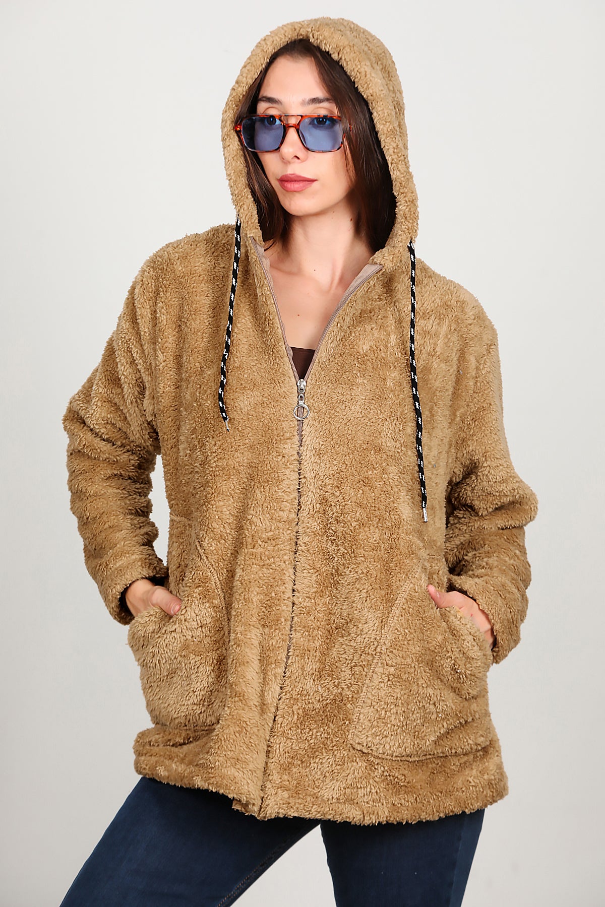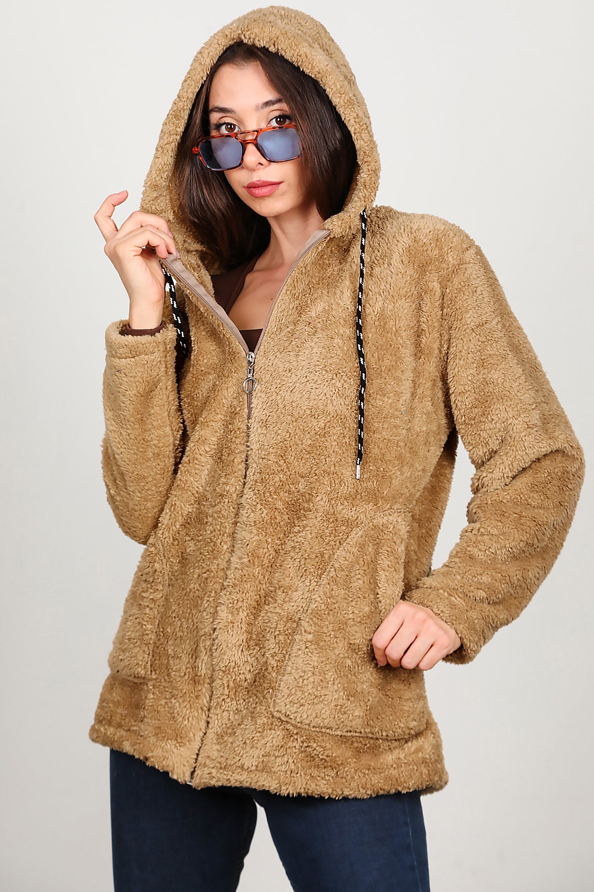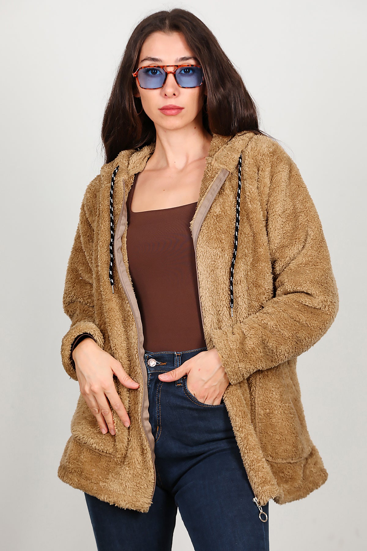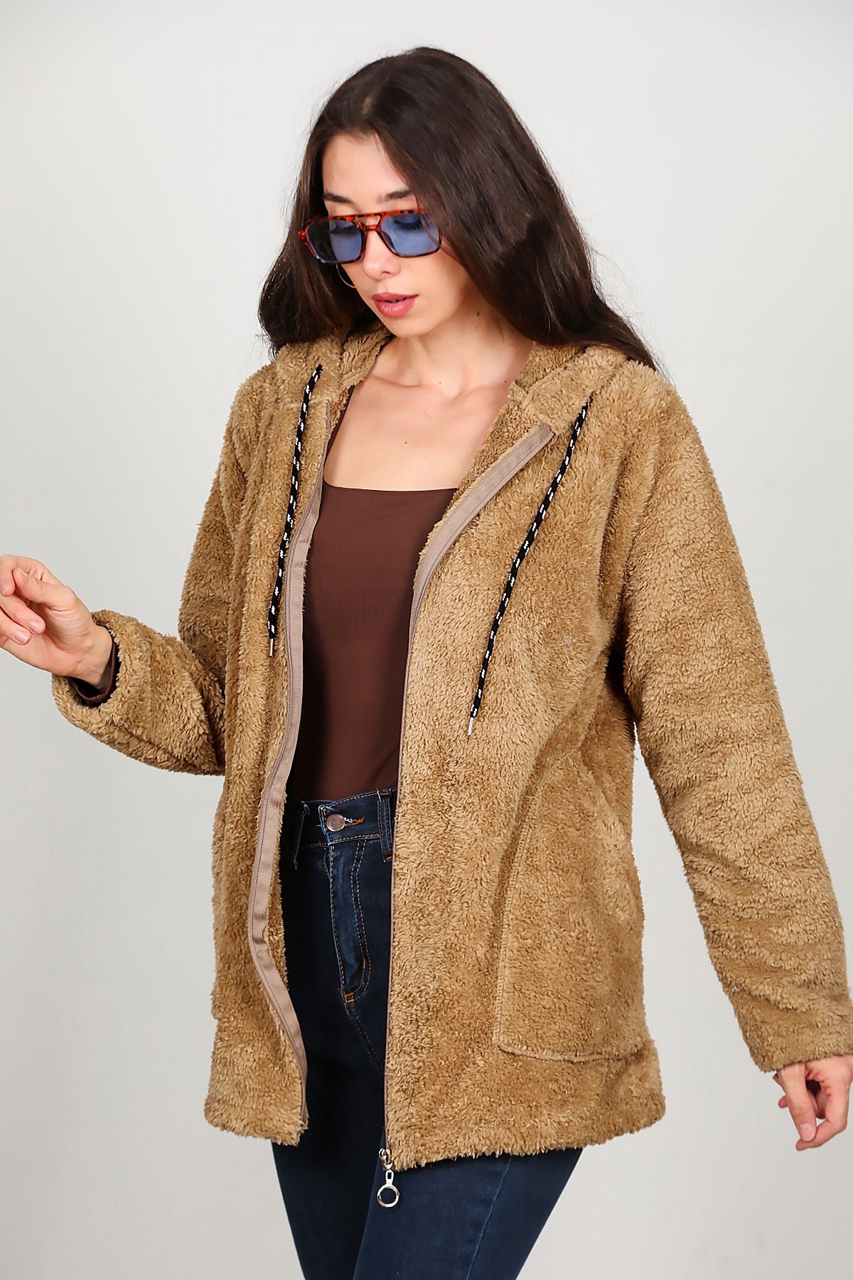 Kadın Kapşonlu Fermuarlı Peluş Ceket Bej