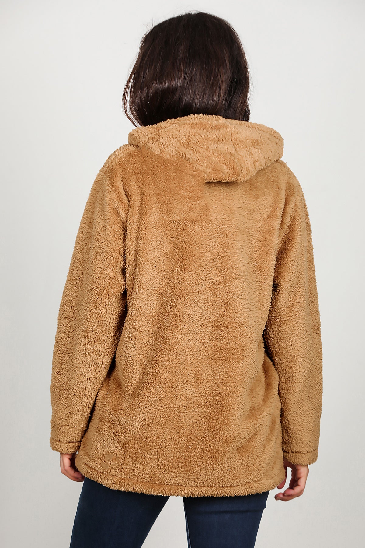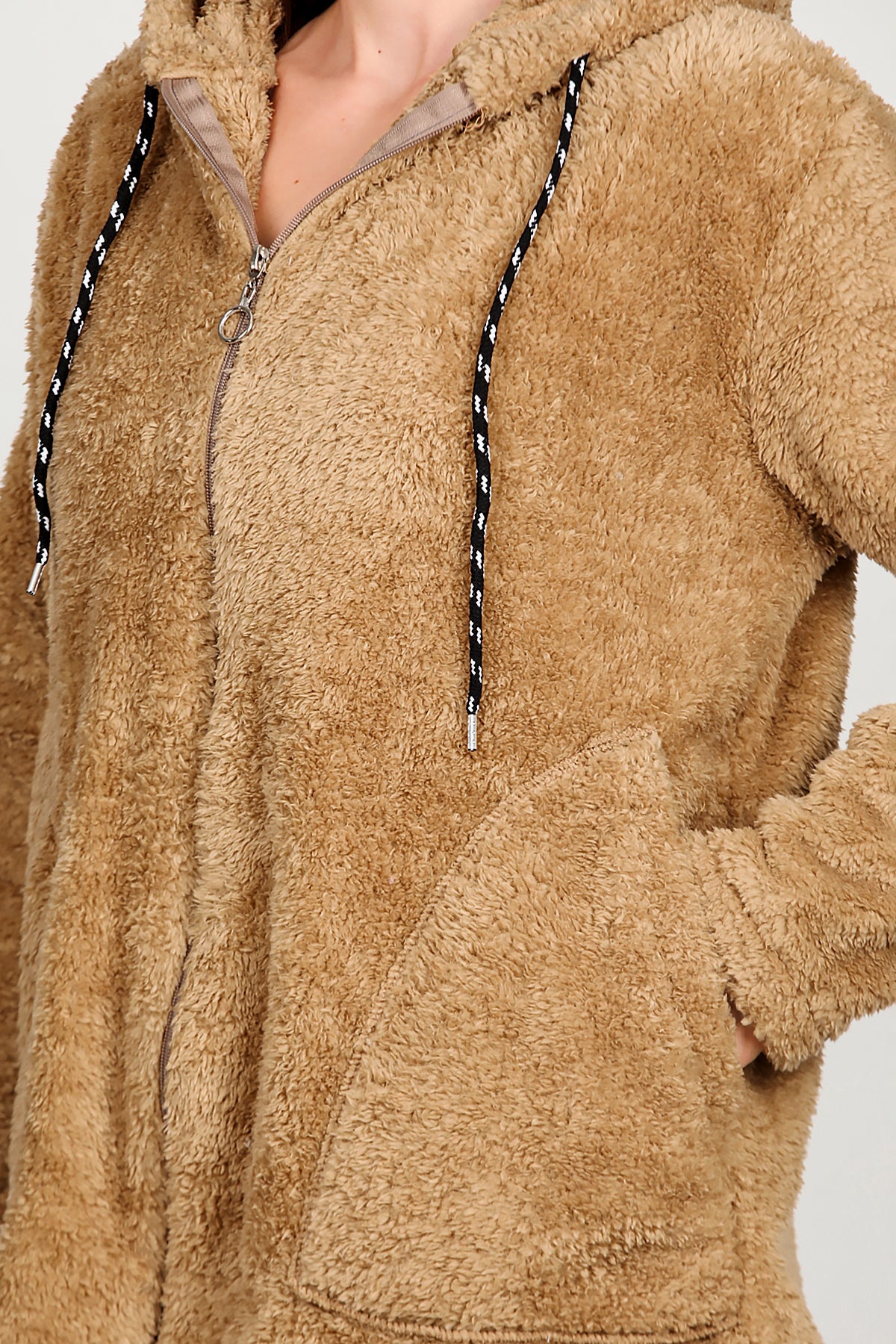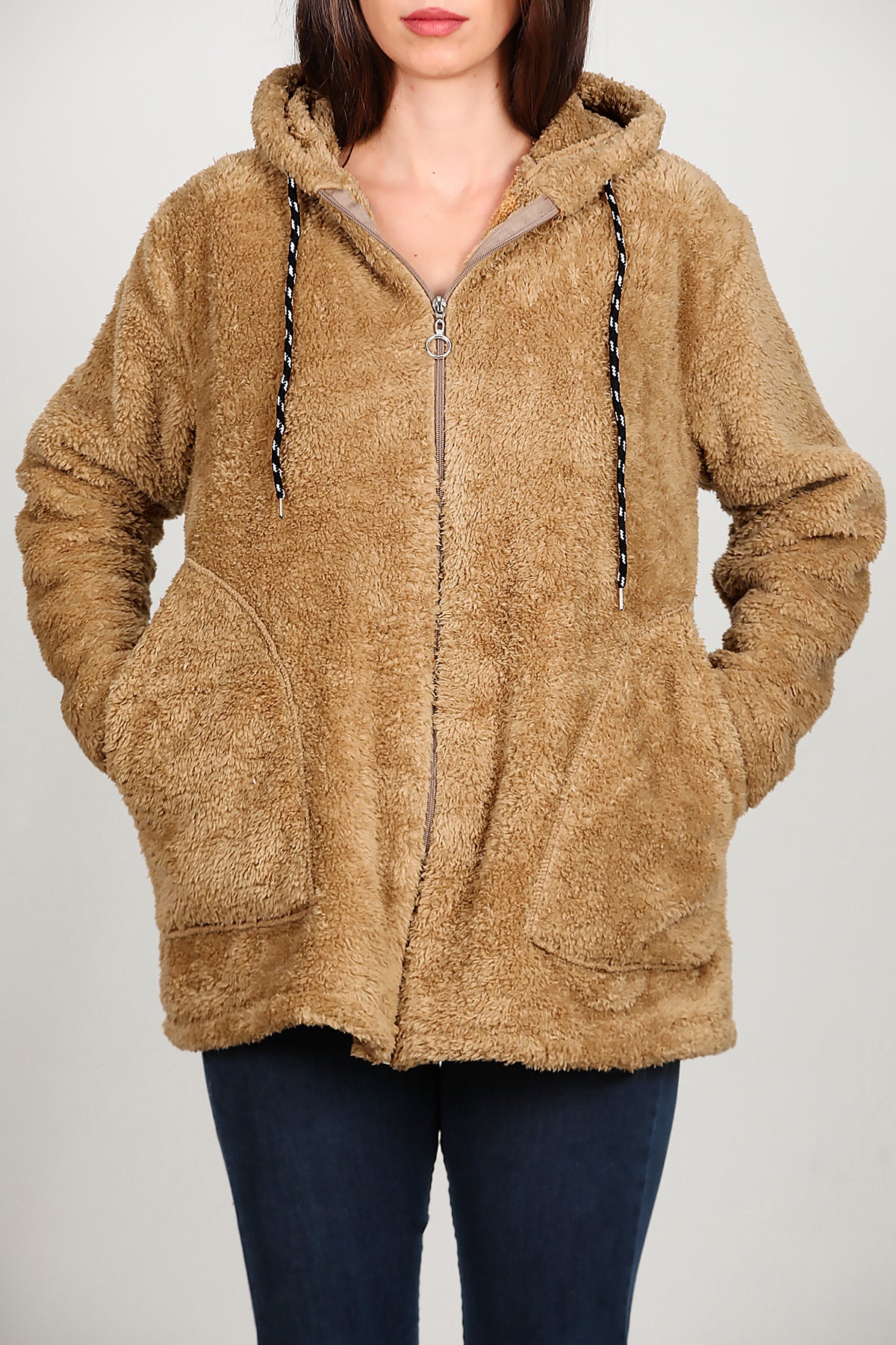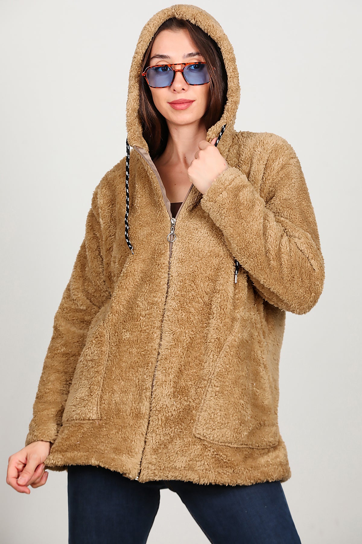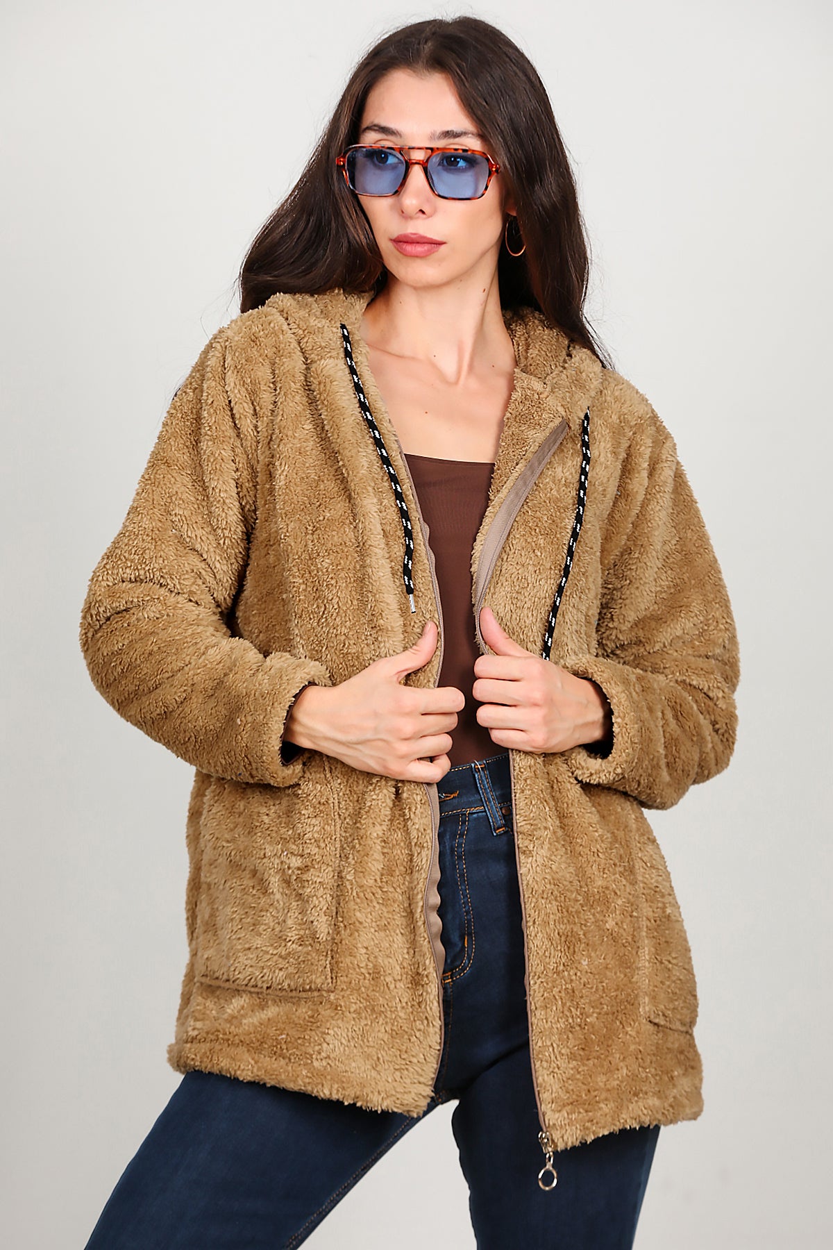Kadın Kapşonlu Fermuarlı Peluş Ceket Bej