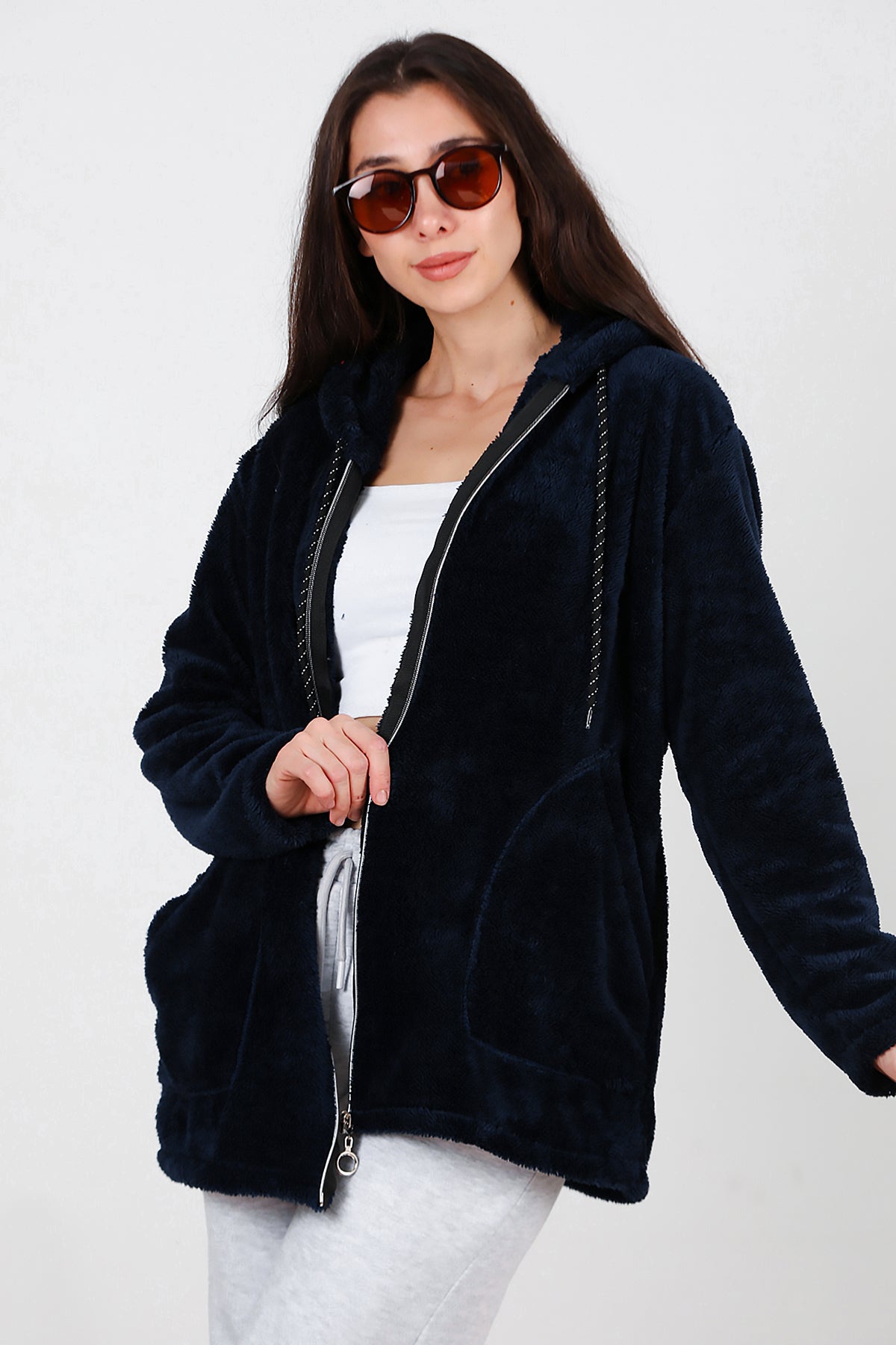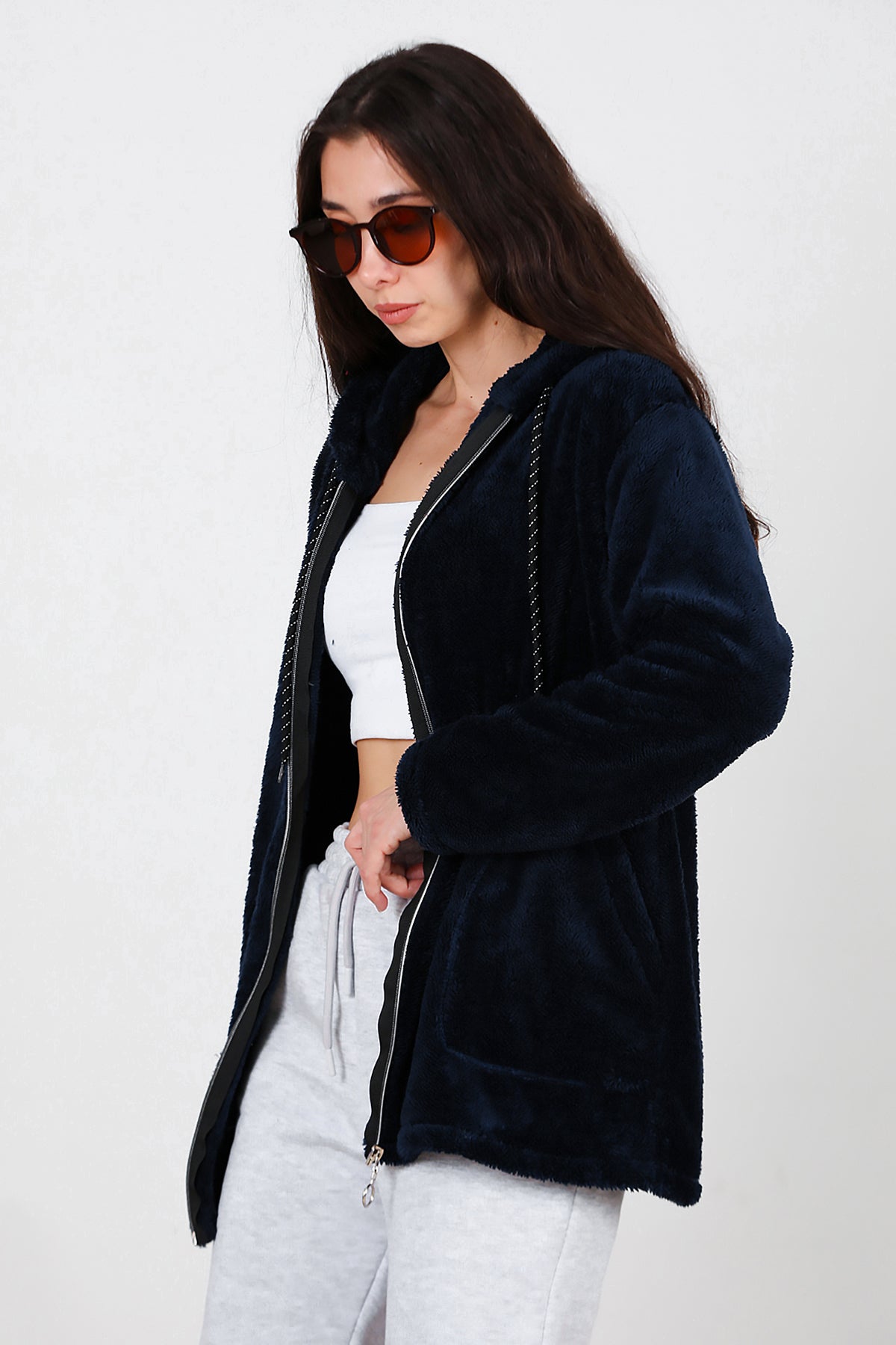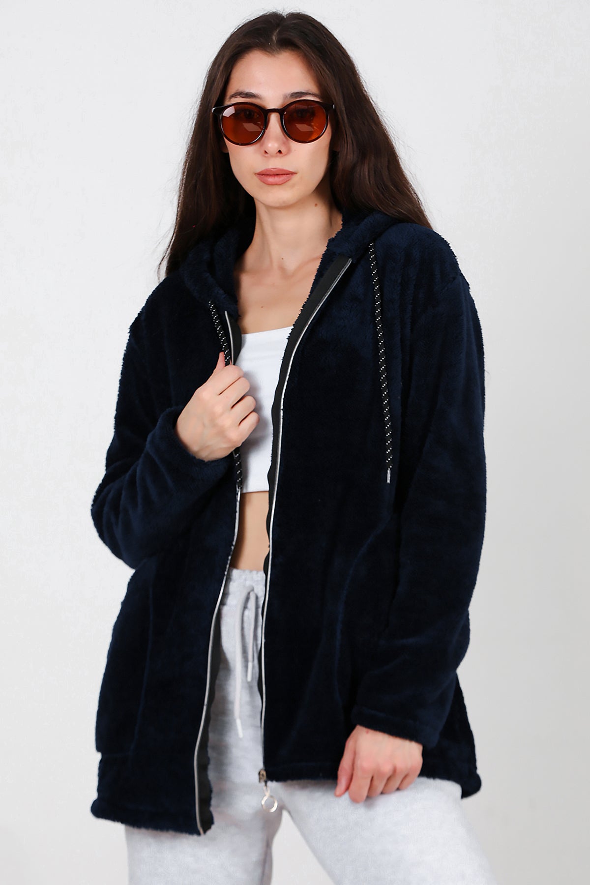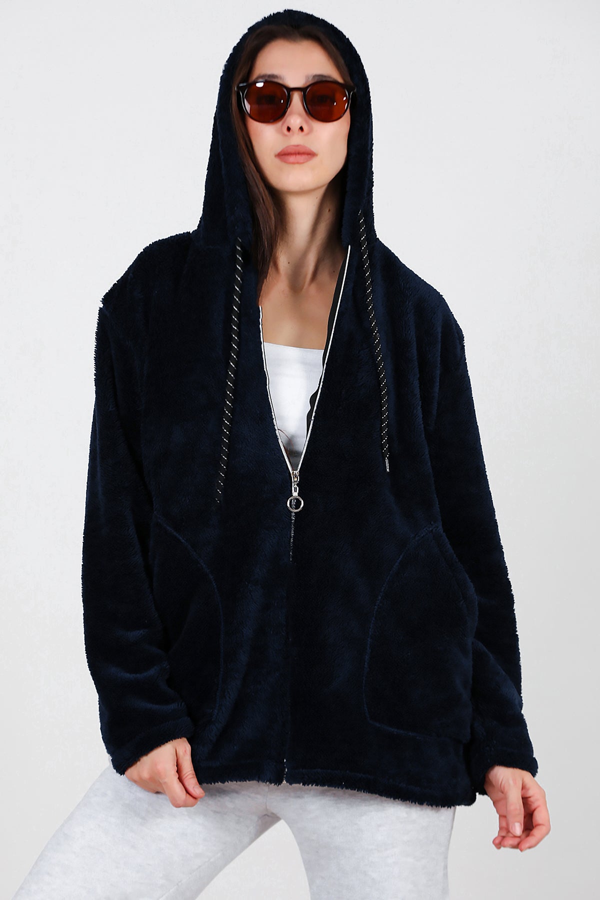 Kadın Kapşonlu Fermuarlı Peluş Ceket Lacivert
