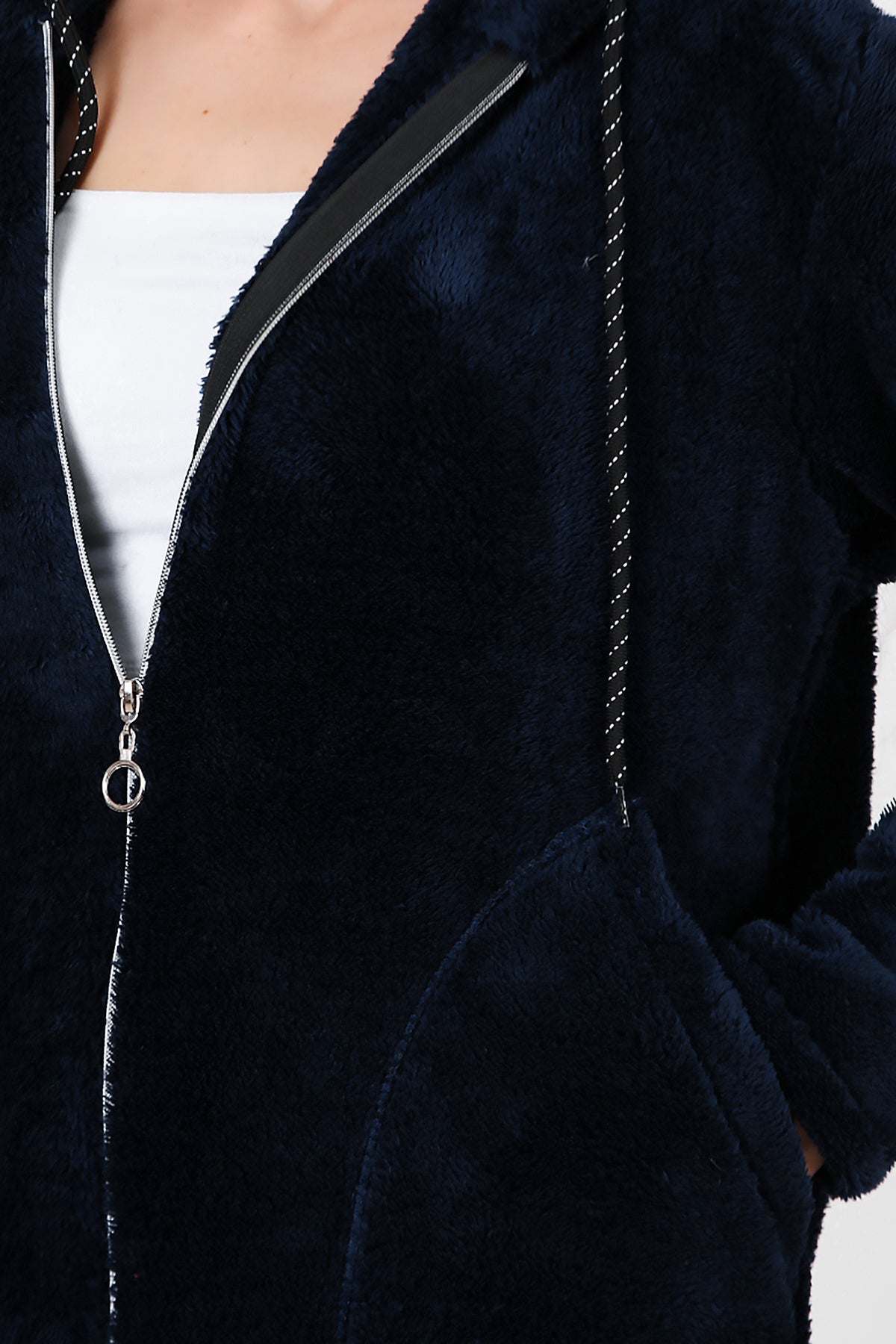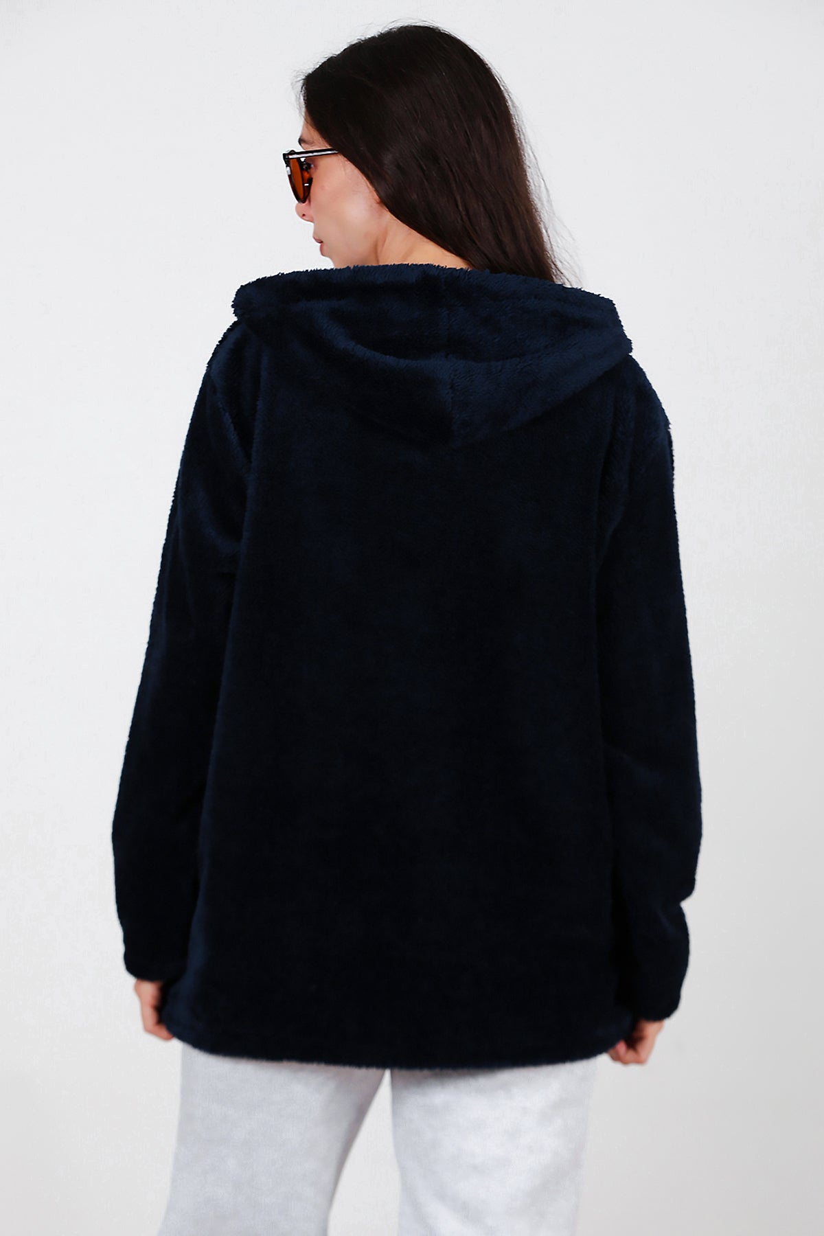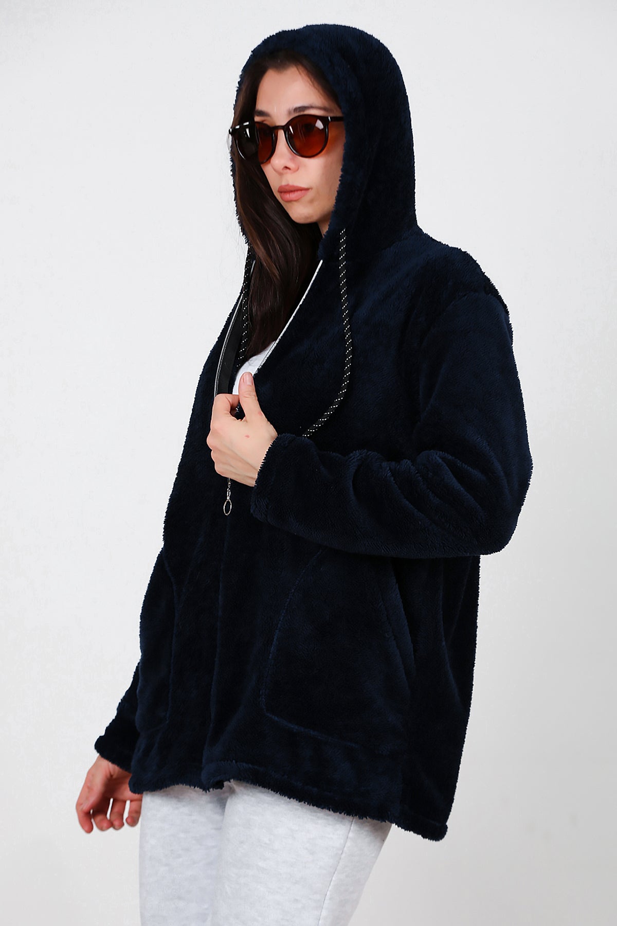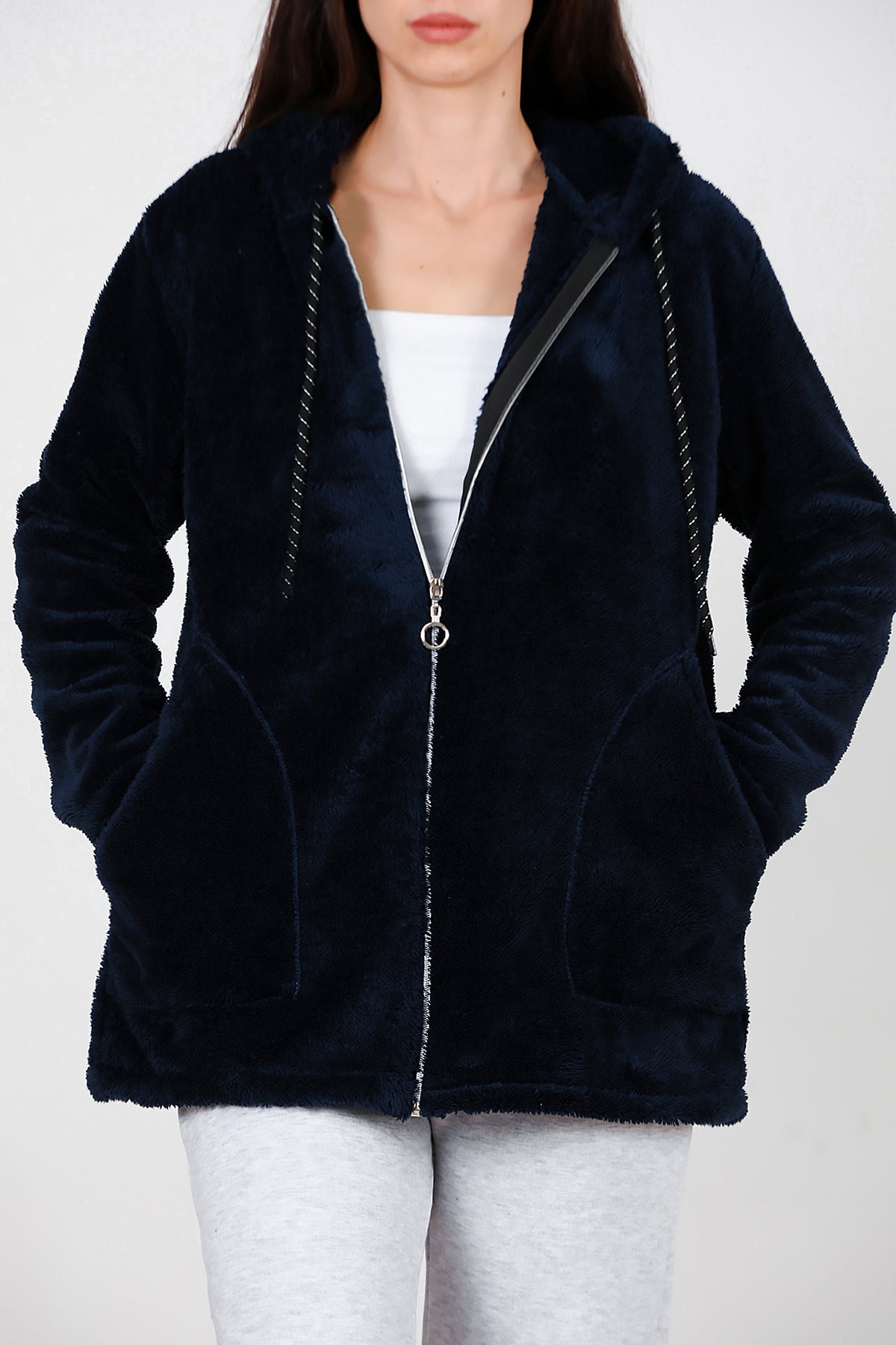 Kadın Kapşonlu Fermuarlı Peluş Ceket Lacivert