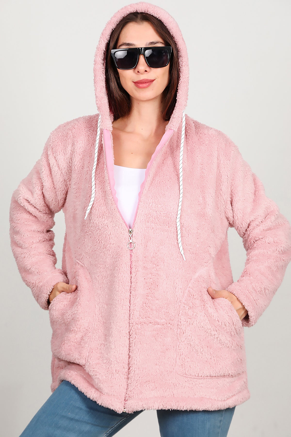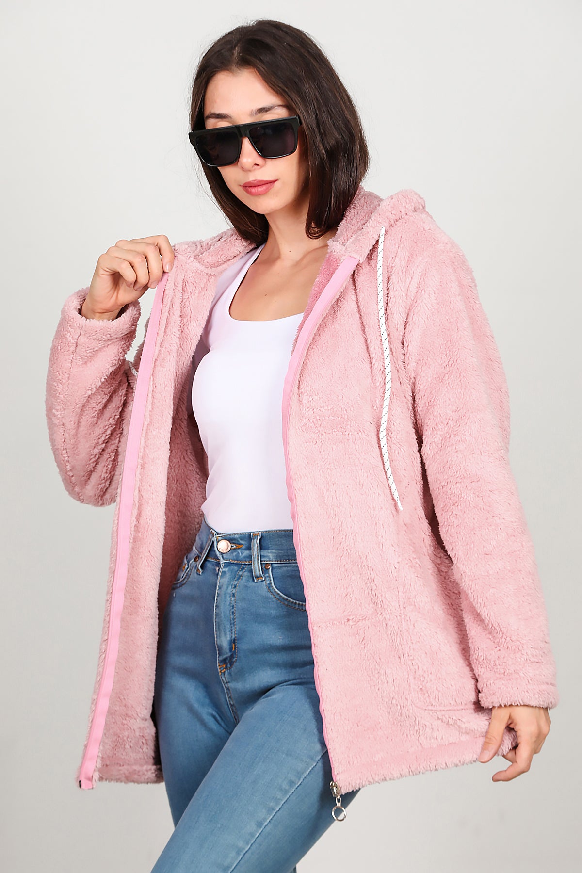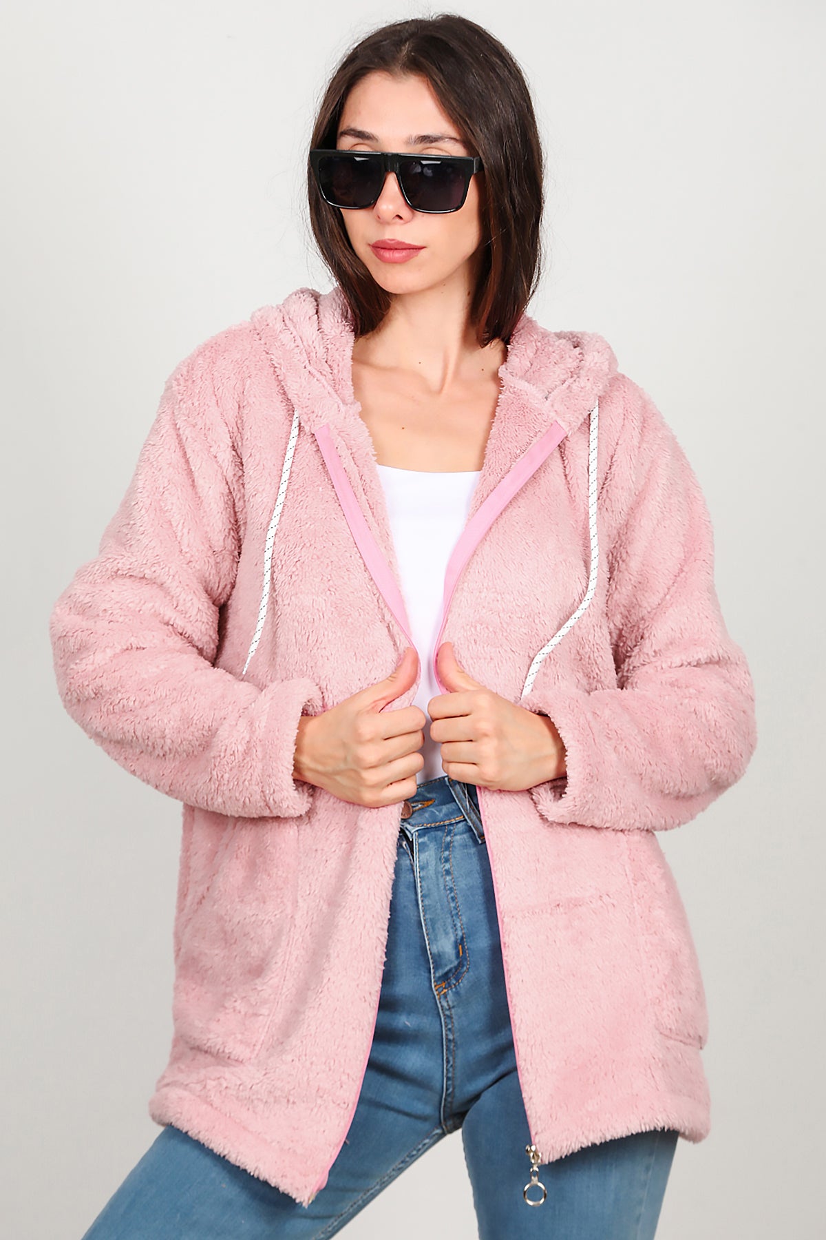 Kadın Kapşonlu Fermuarlı Peluş Ceket Pudra