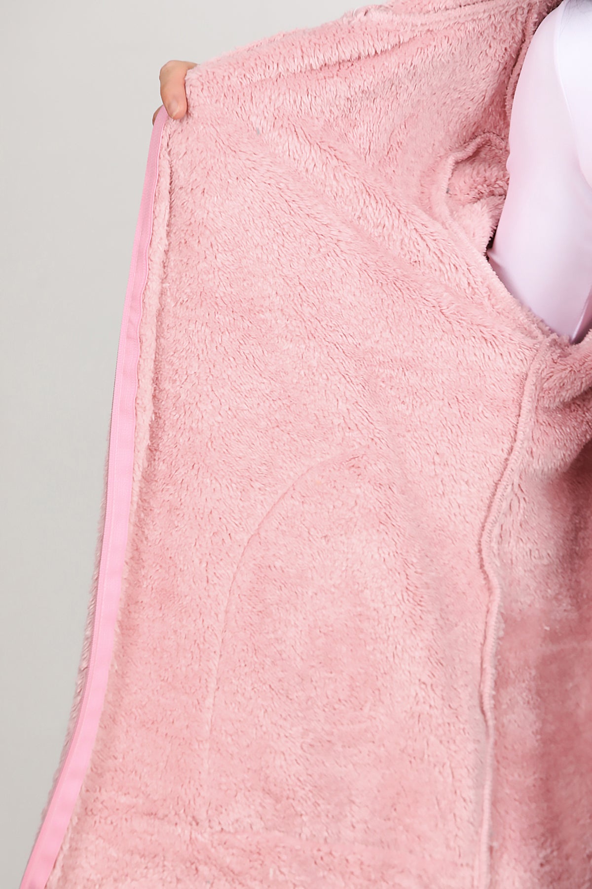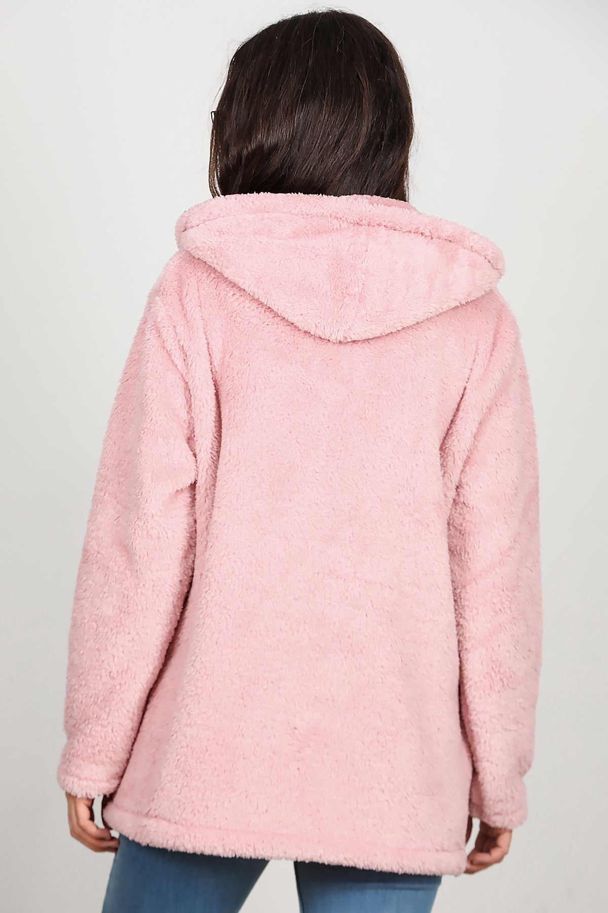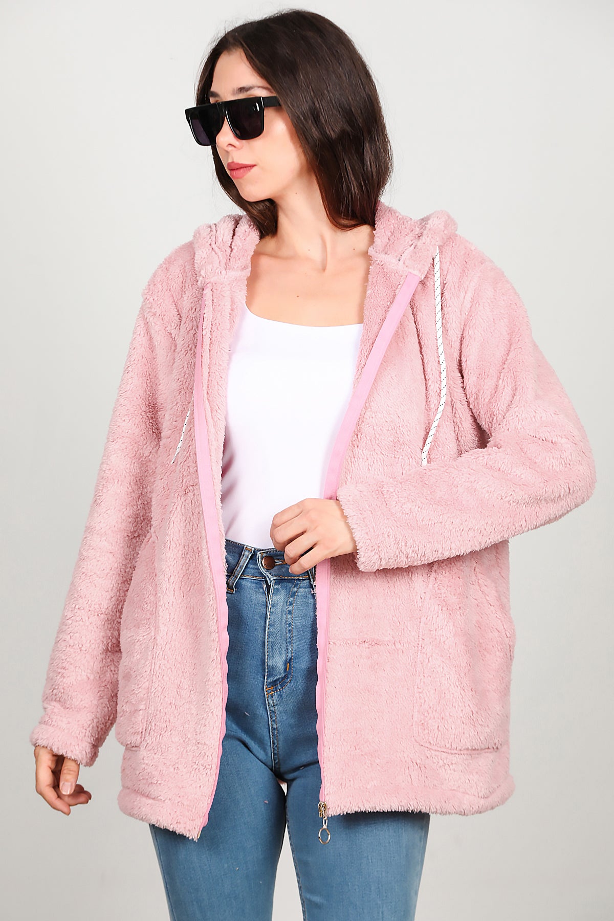 Kadın Kapşonlu Fermuarlı Peluş Ceket Pudra