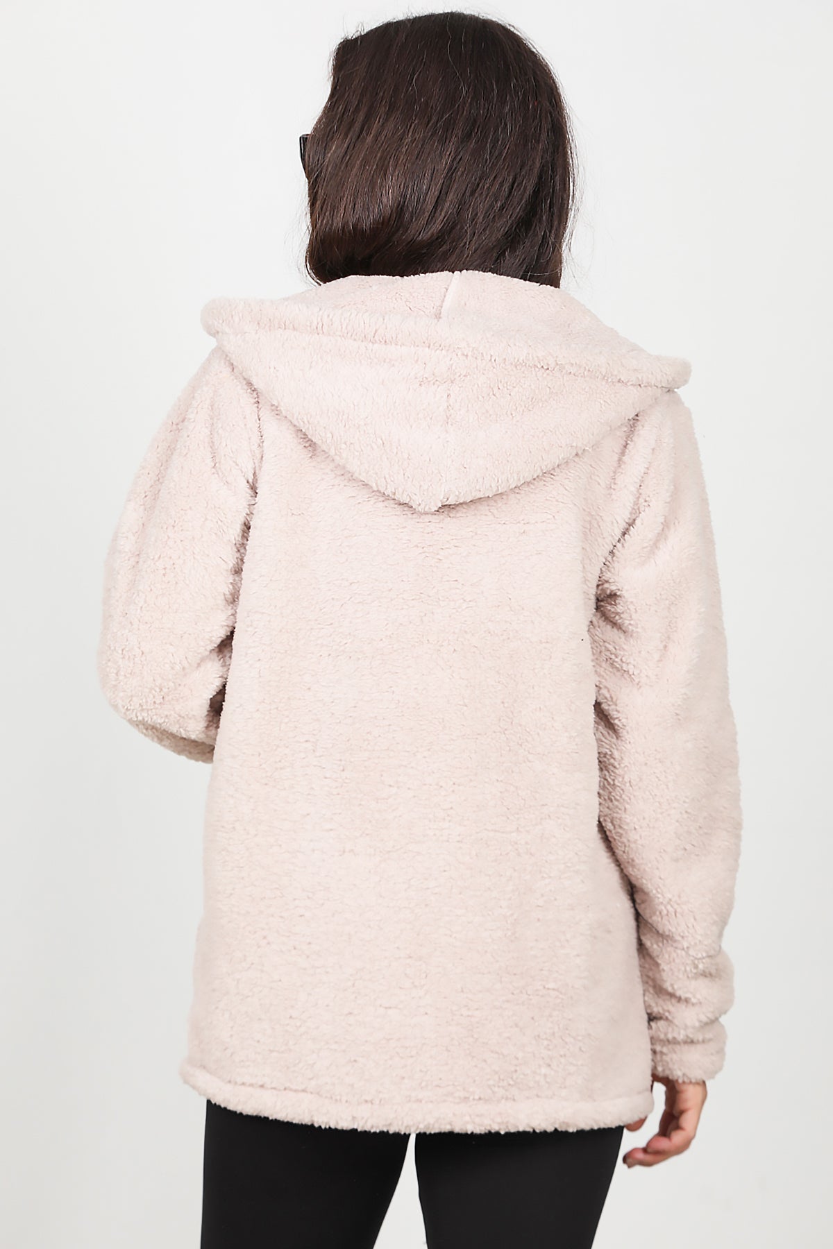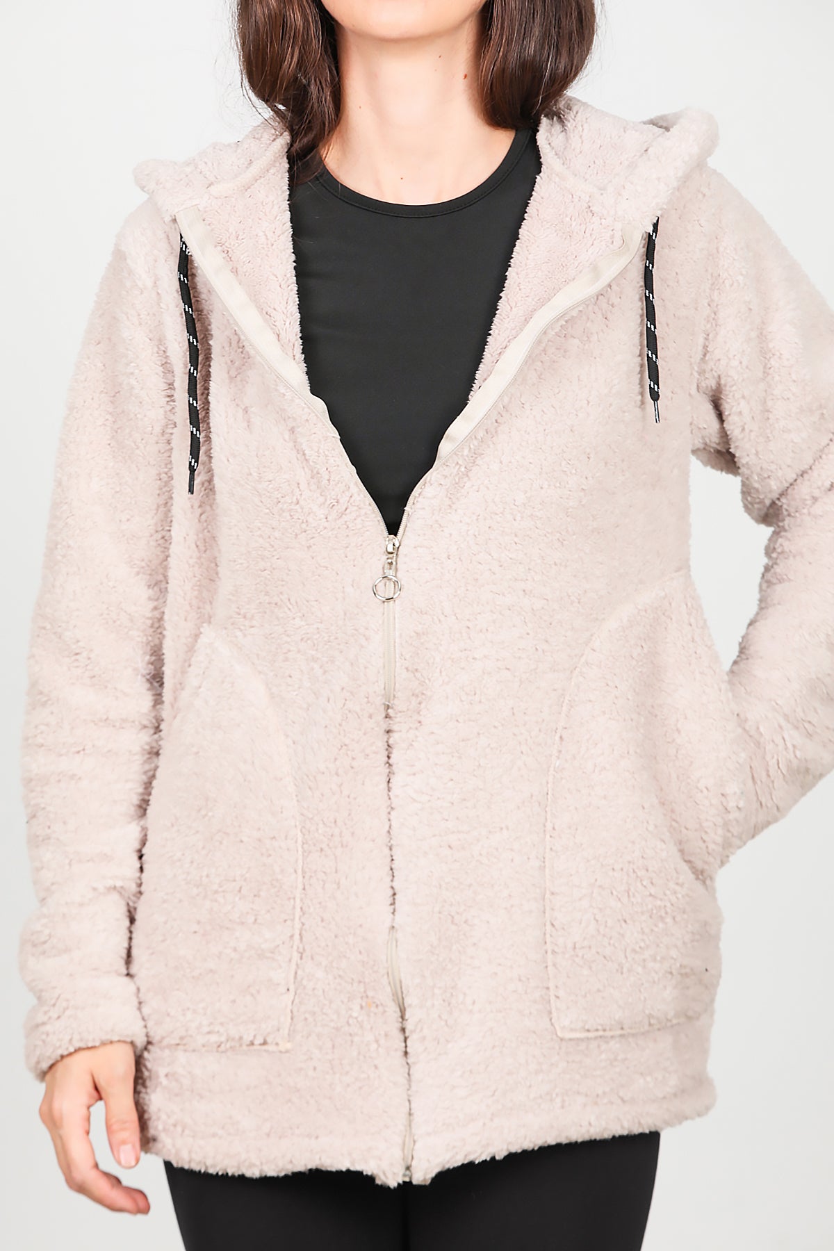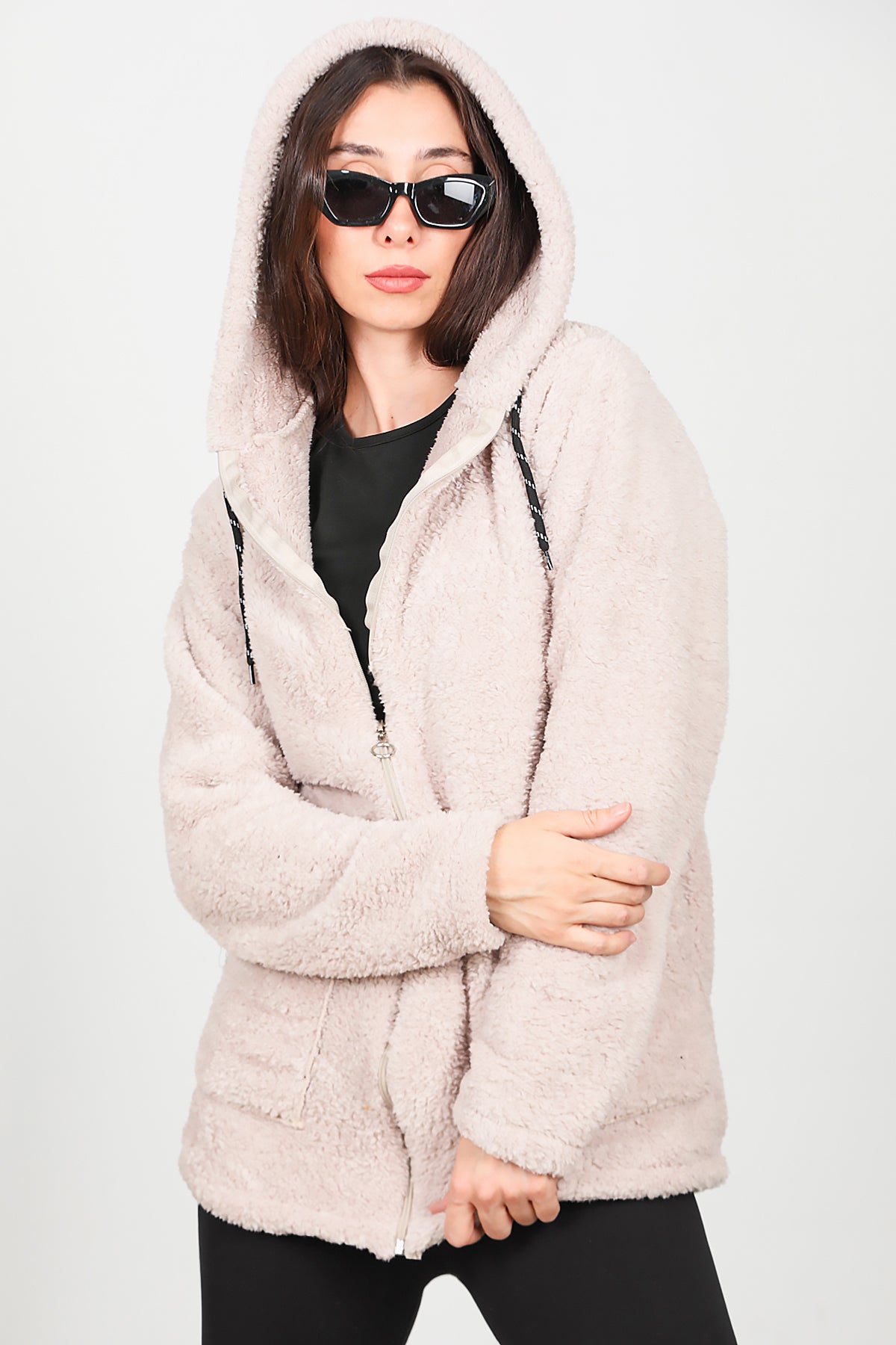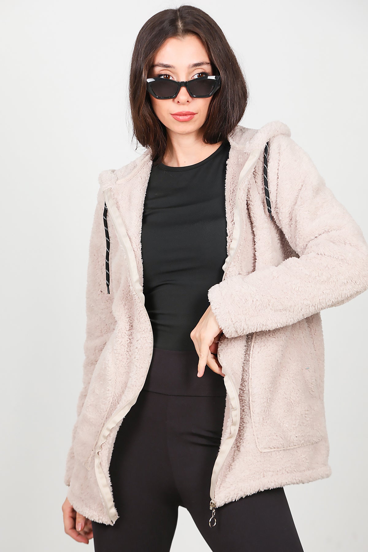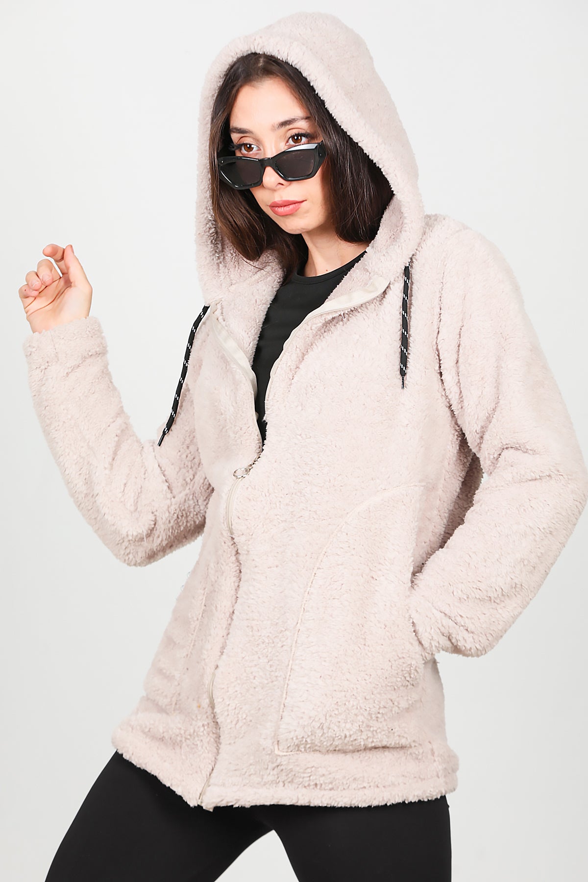 Kadın Kapşonlu Fermuarlı Peluş Ceket Taş