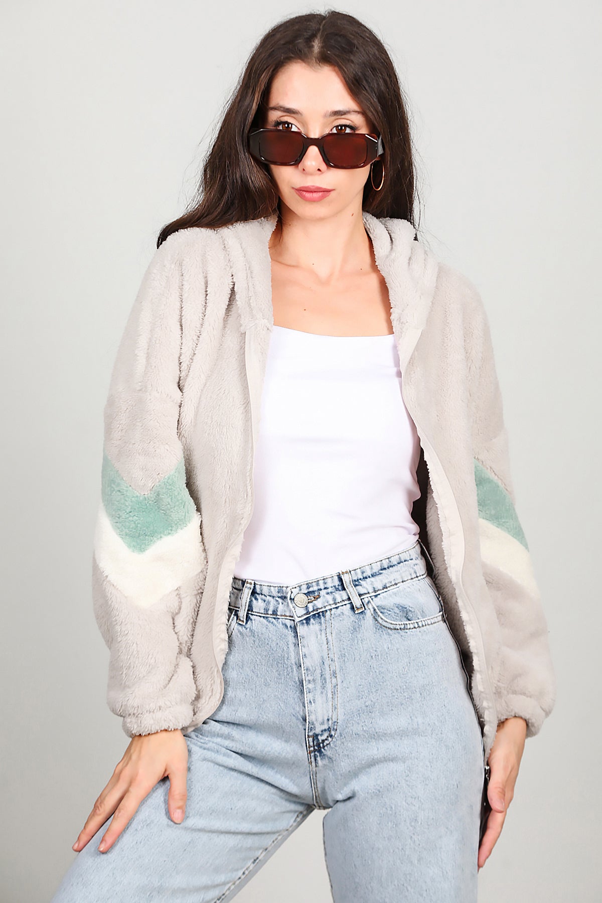Kadın Kapşonlu Kol Çizgi Detay Peluş Ceket Pudra