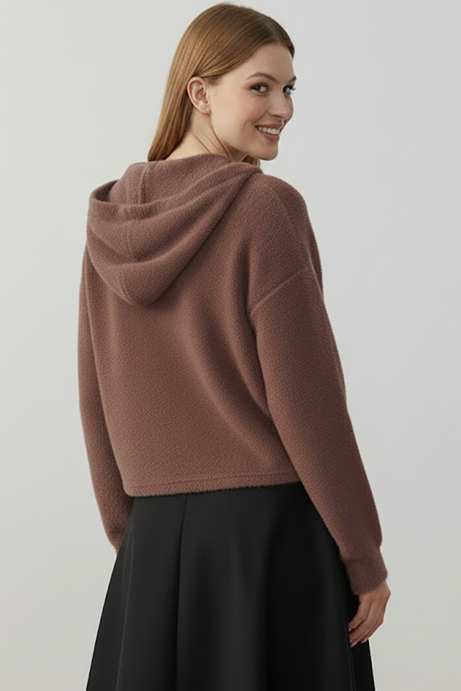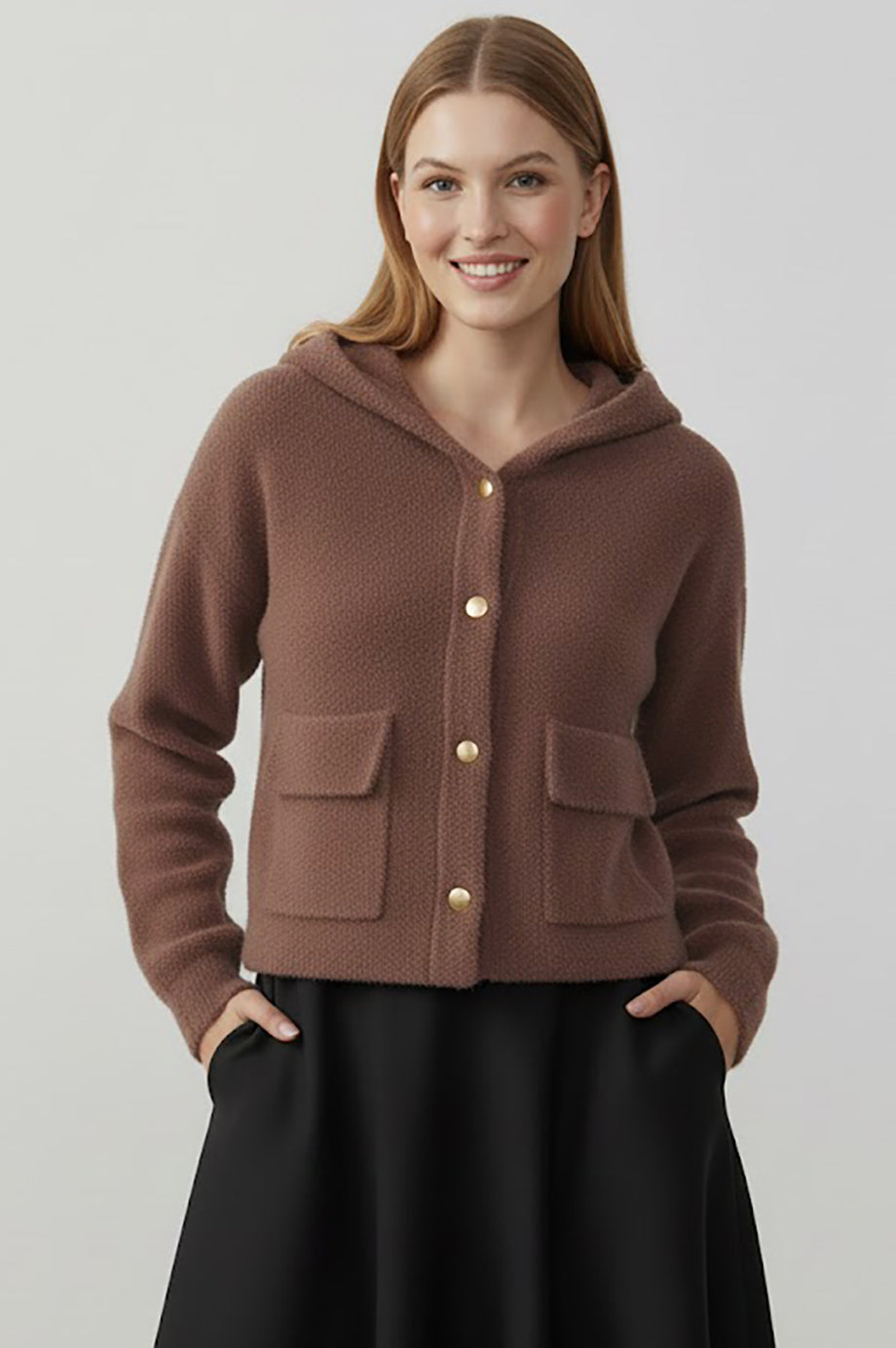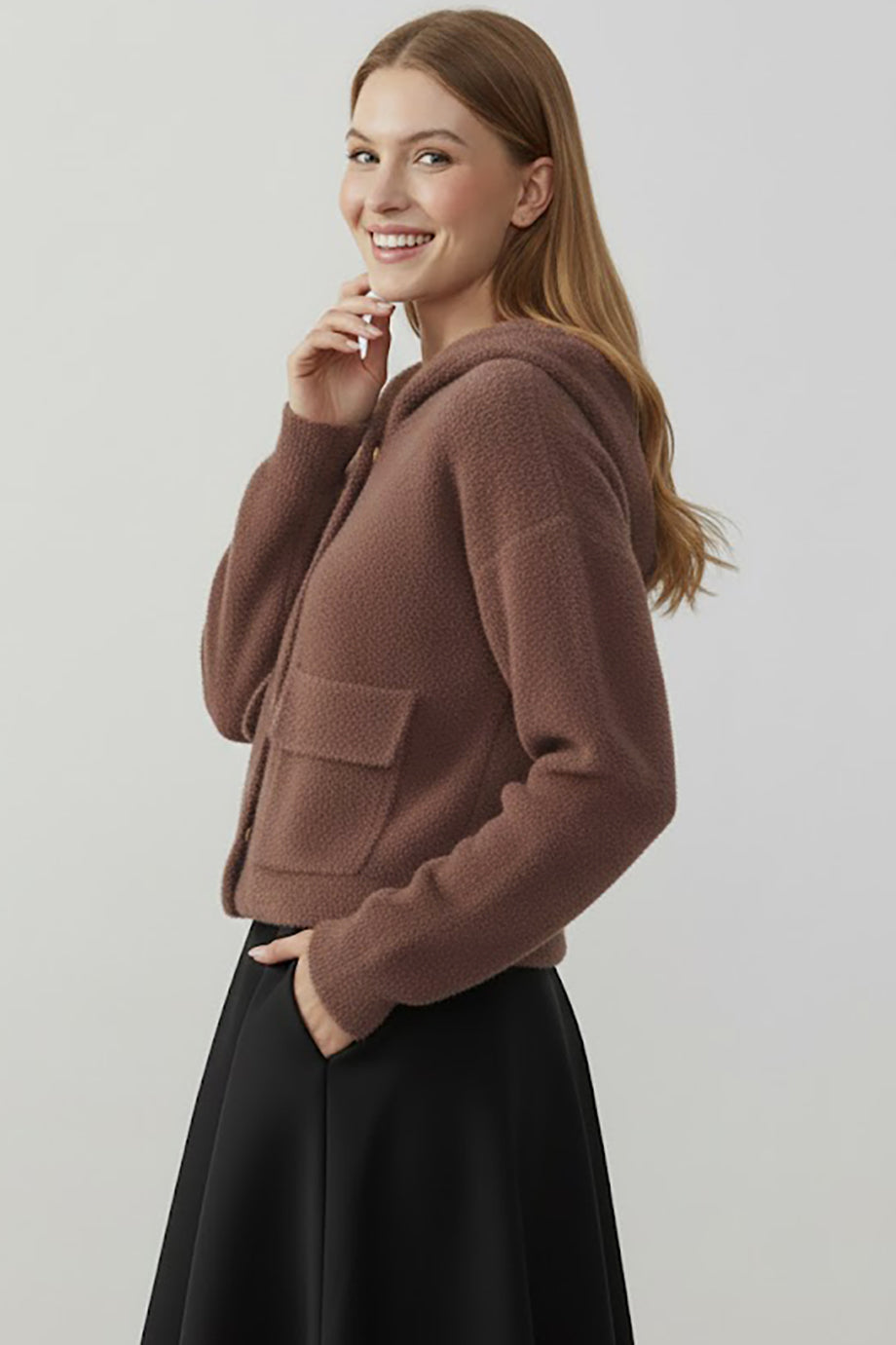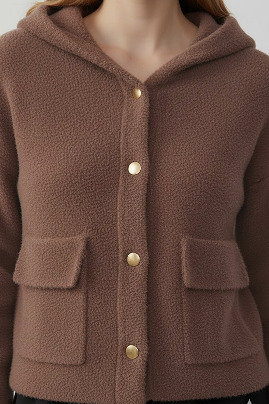Fluffcardy Kadın Kapşonlu Ön Düğmeli Sakallı Hırka Kahverengi