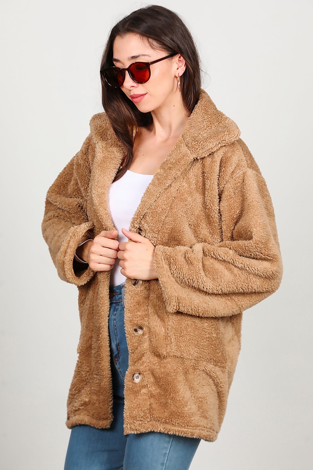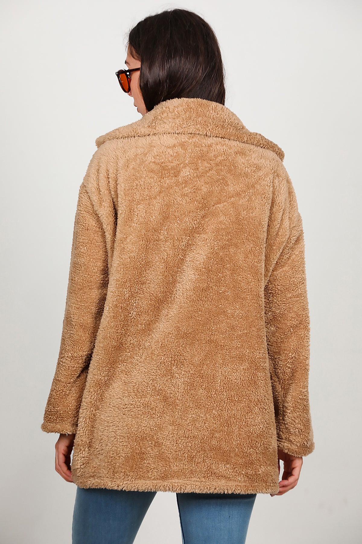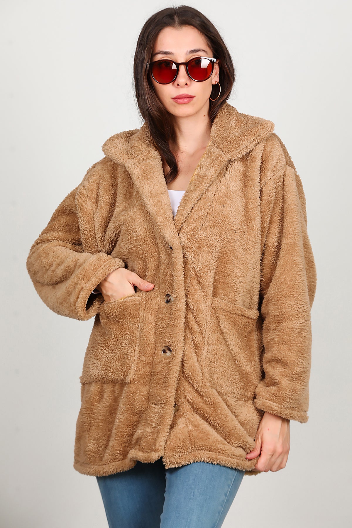 Kadın Önü Düğmeli Peluş Ceket Bej