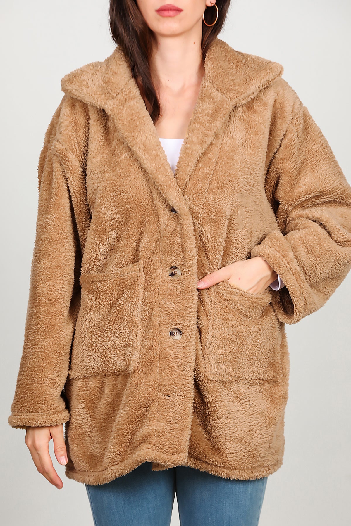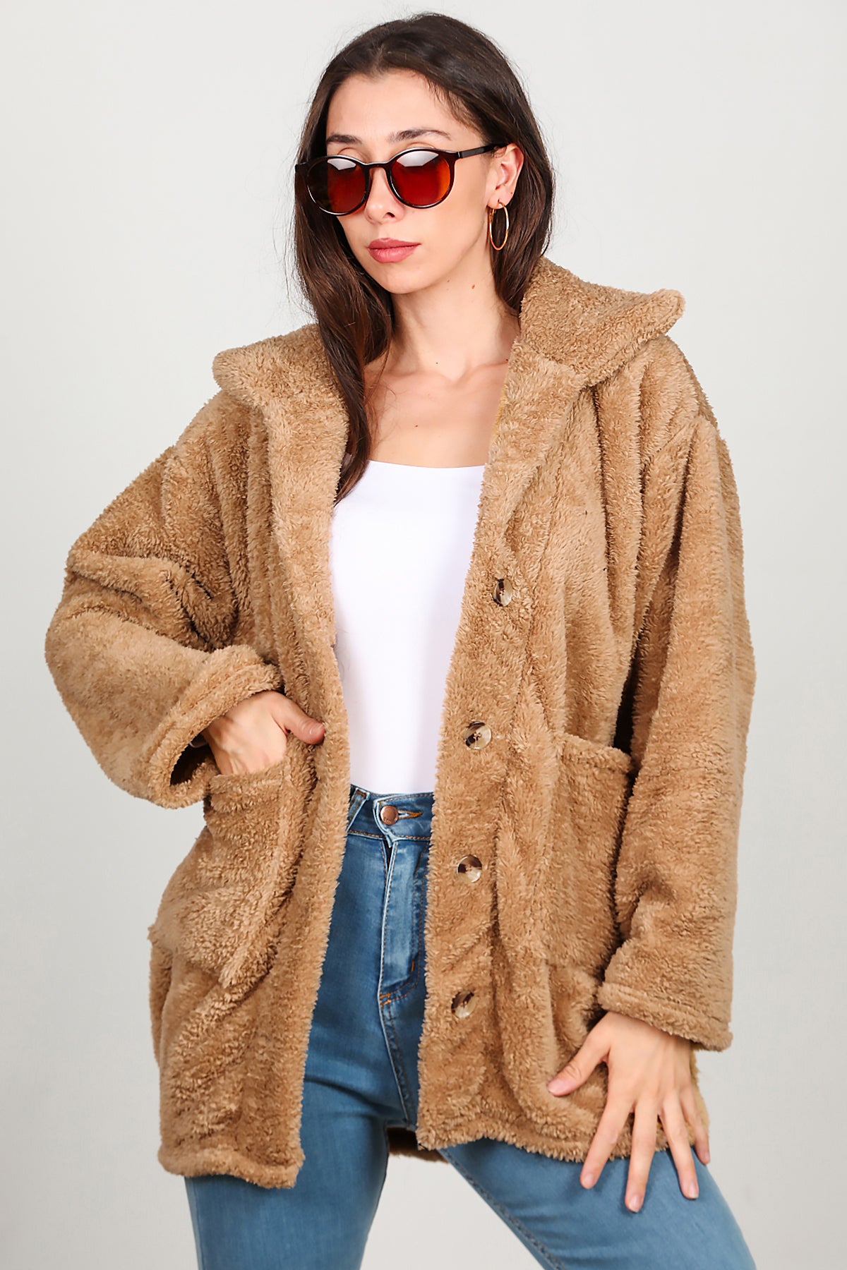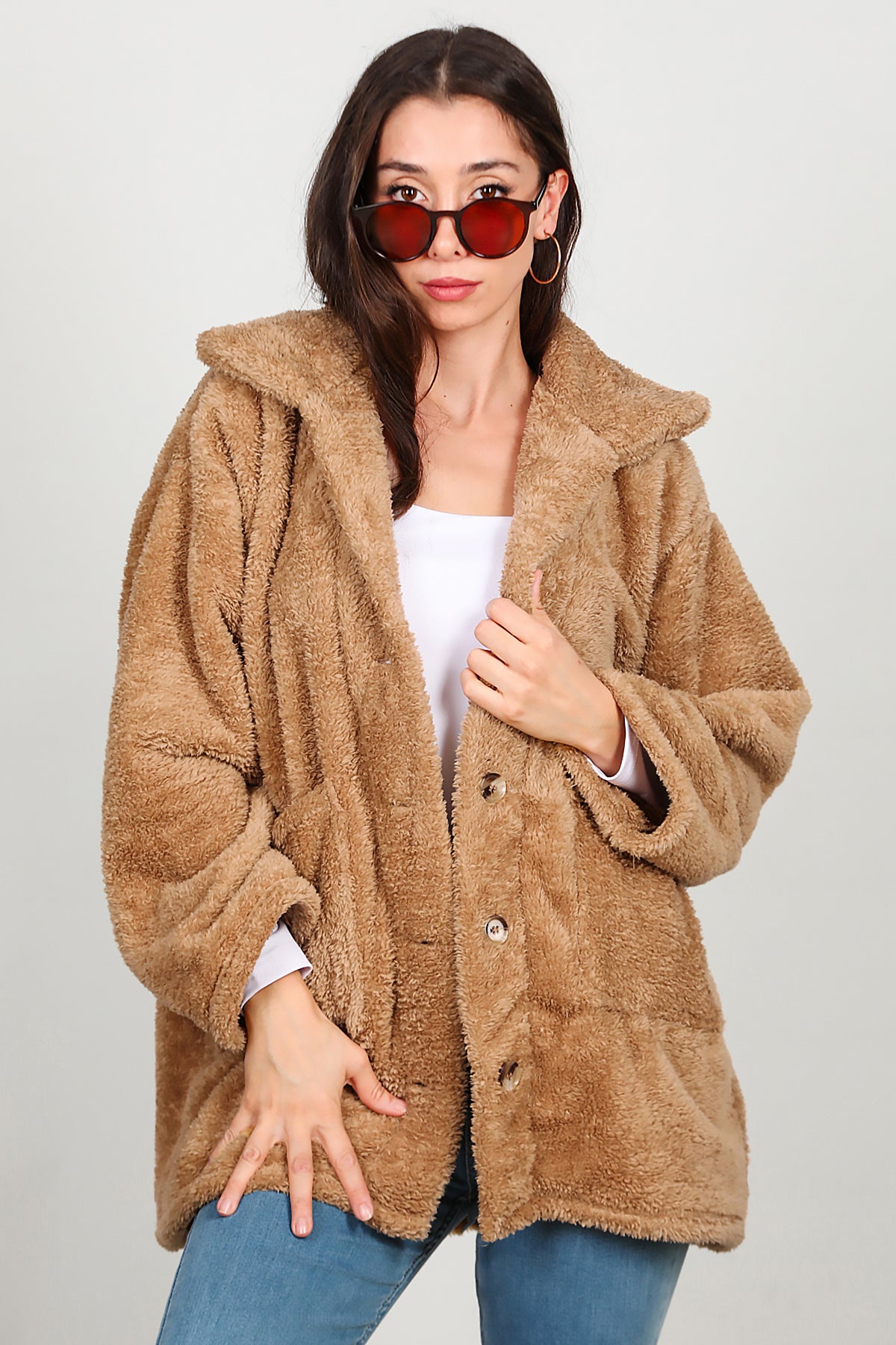 Kadın Önü Düğmeli Peluş Ceket Bej