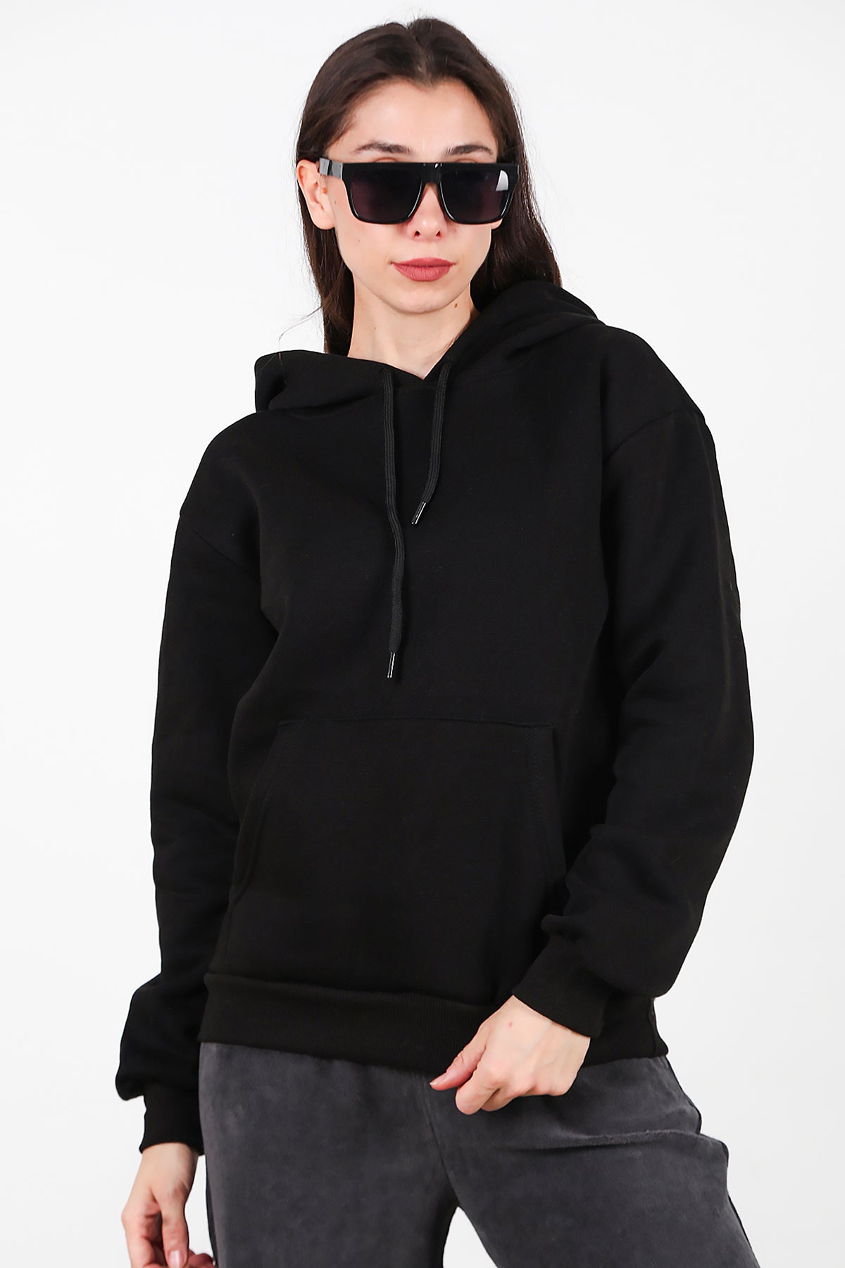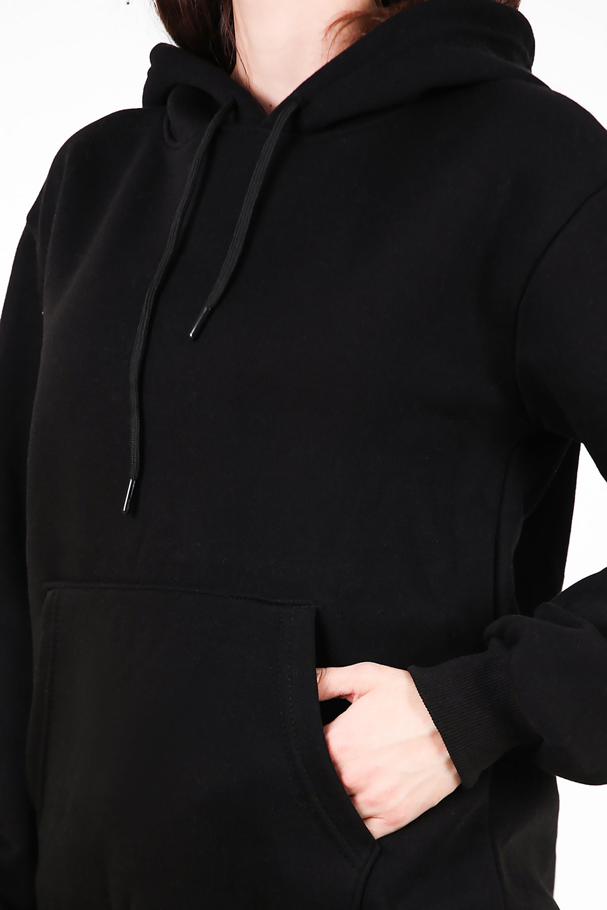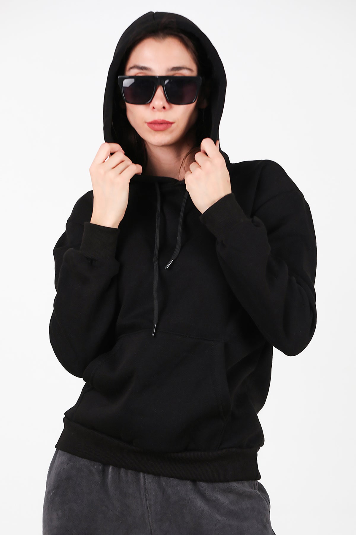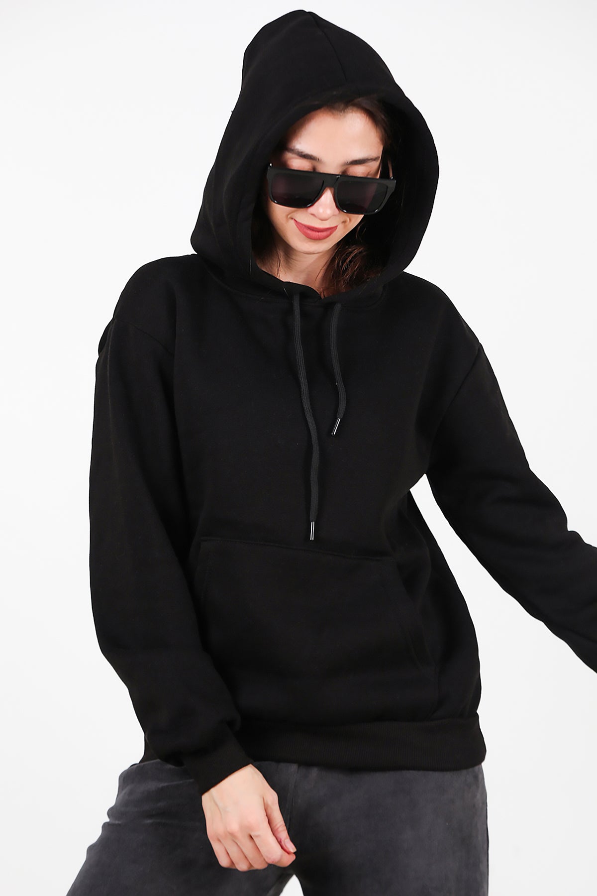 Kadın Kapşonlu Üç İplik Sweat Siyah