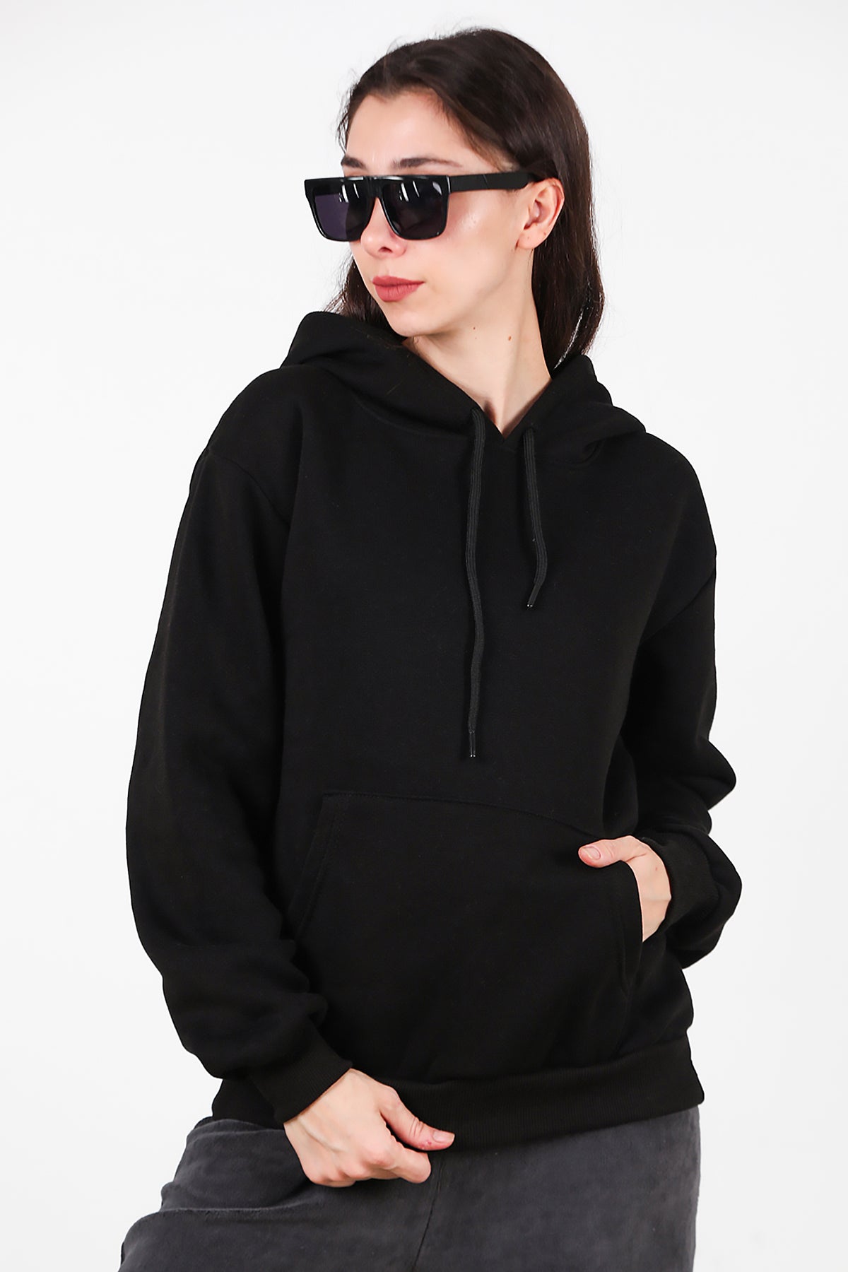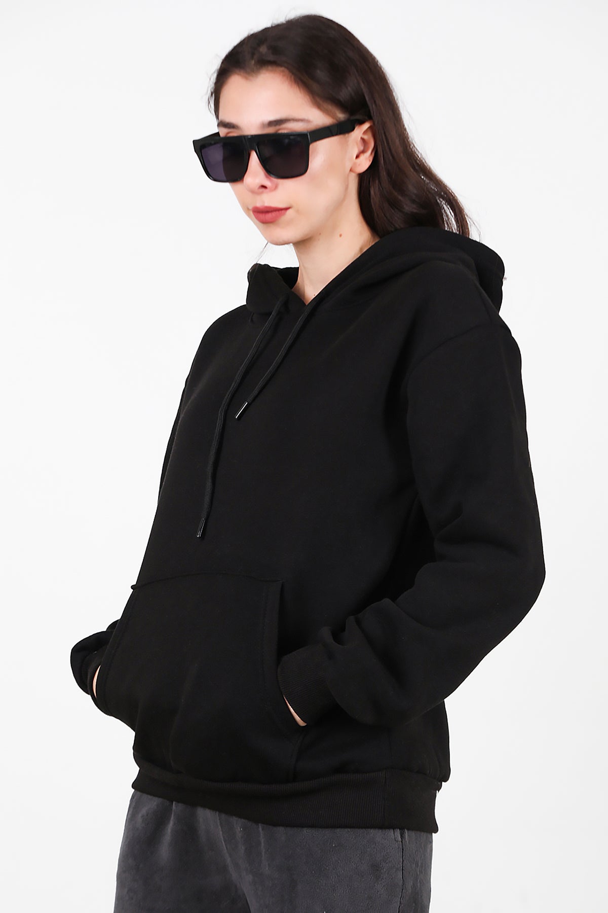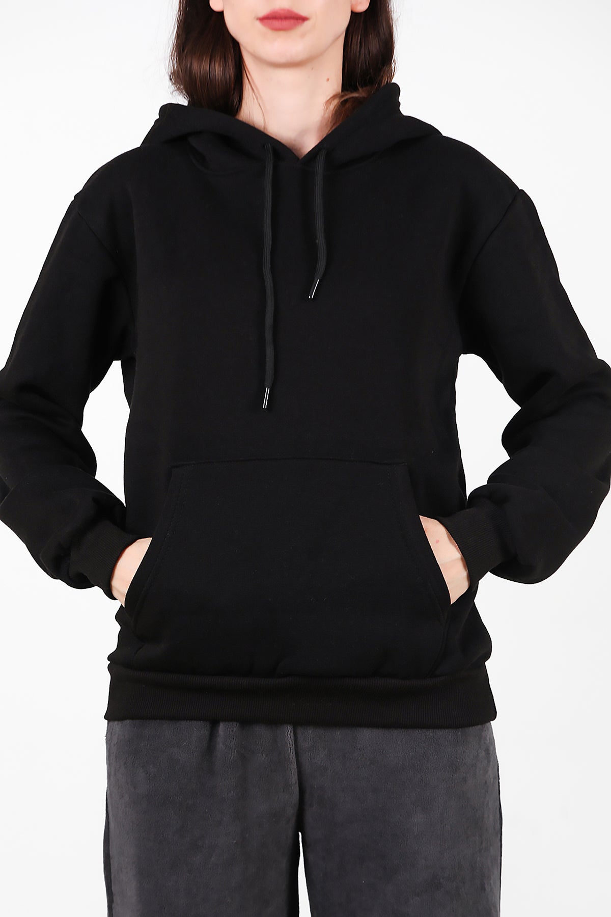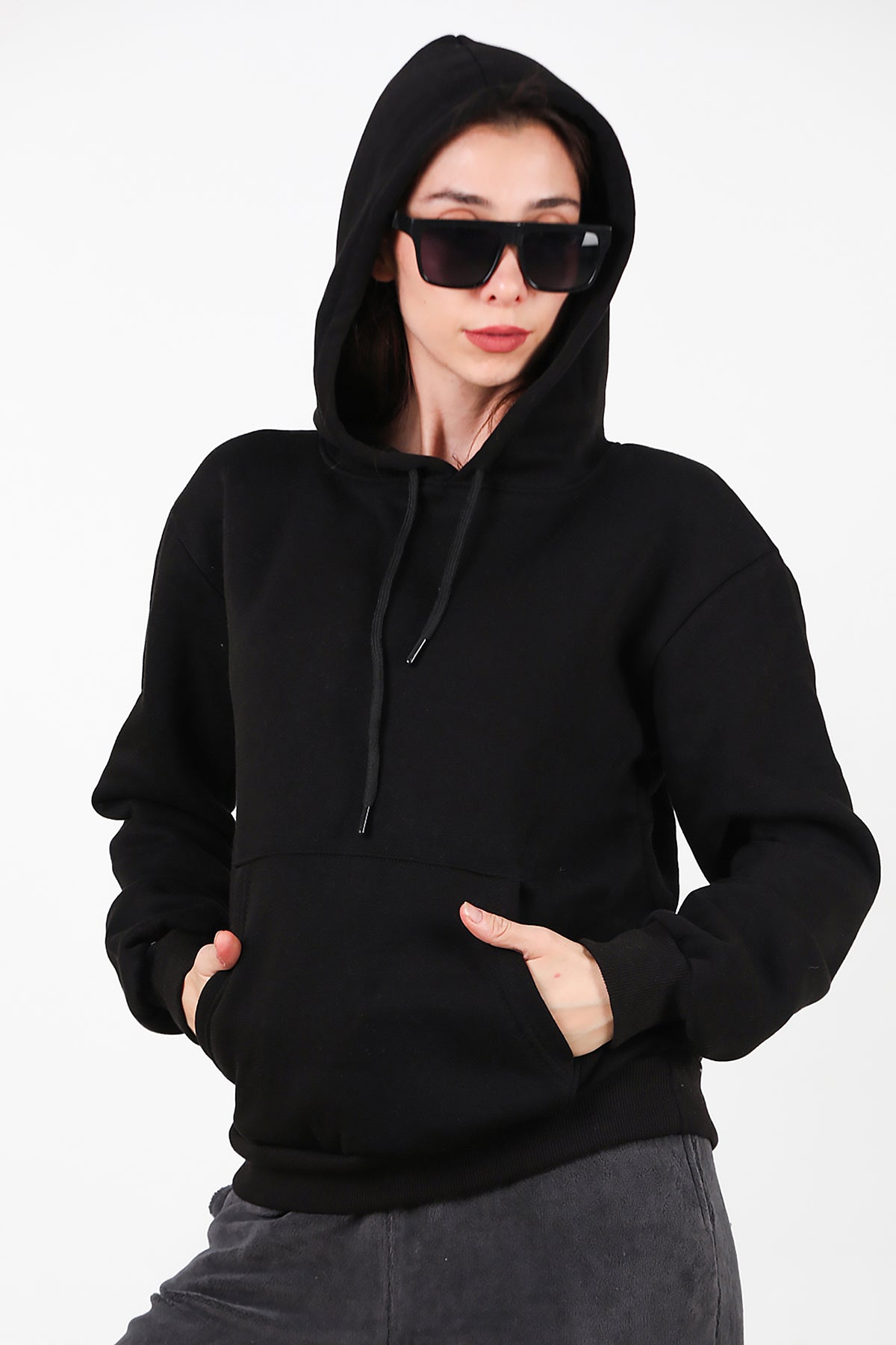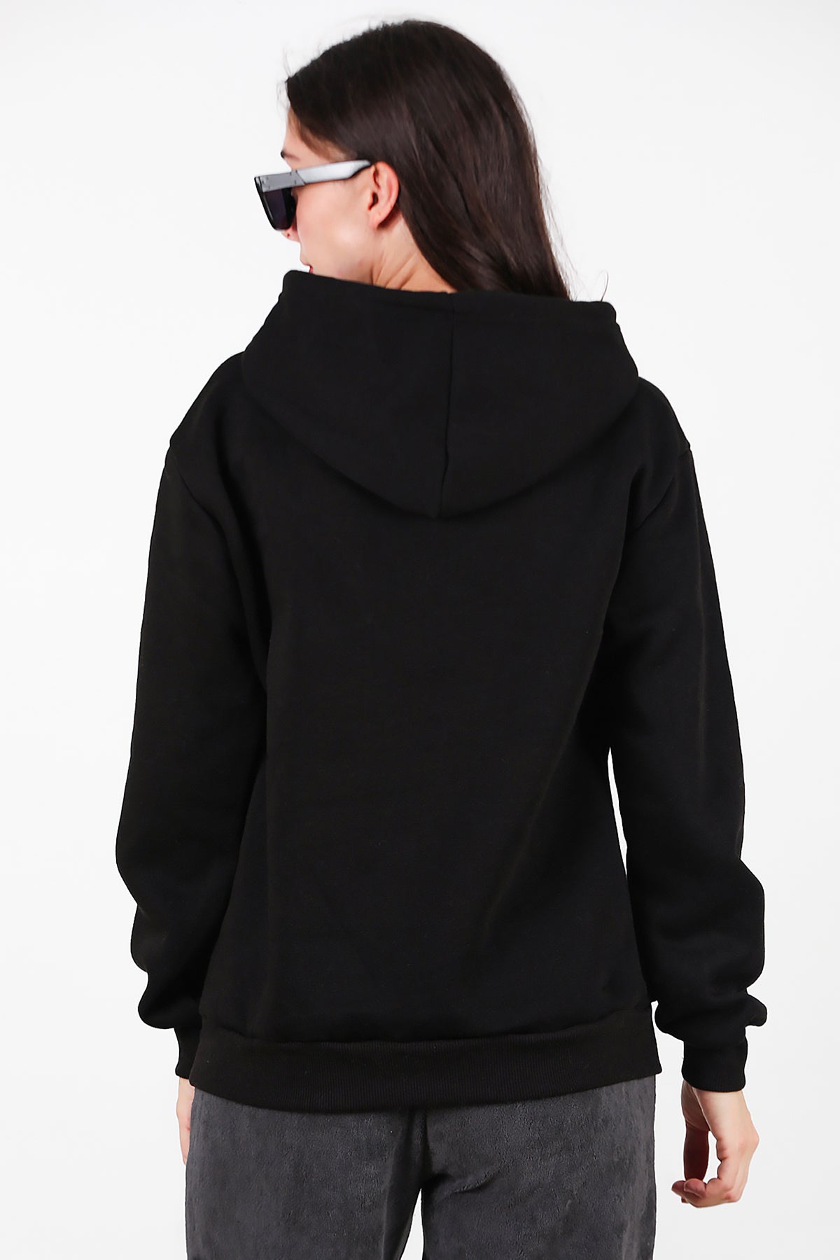 Kadın Kapşonlu Üç İplik Sweat Siyah