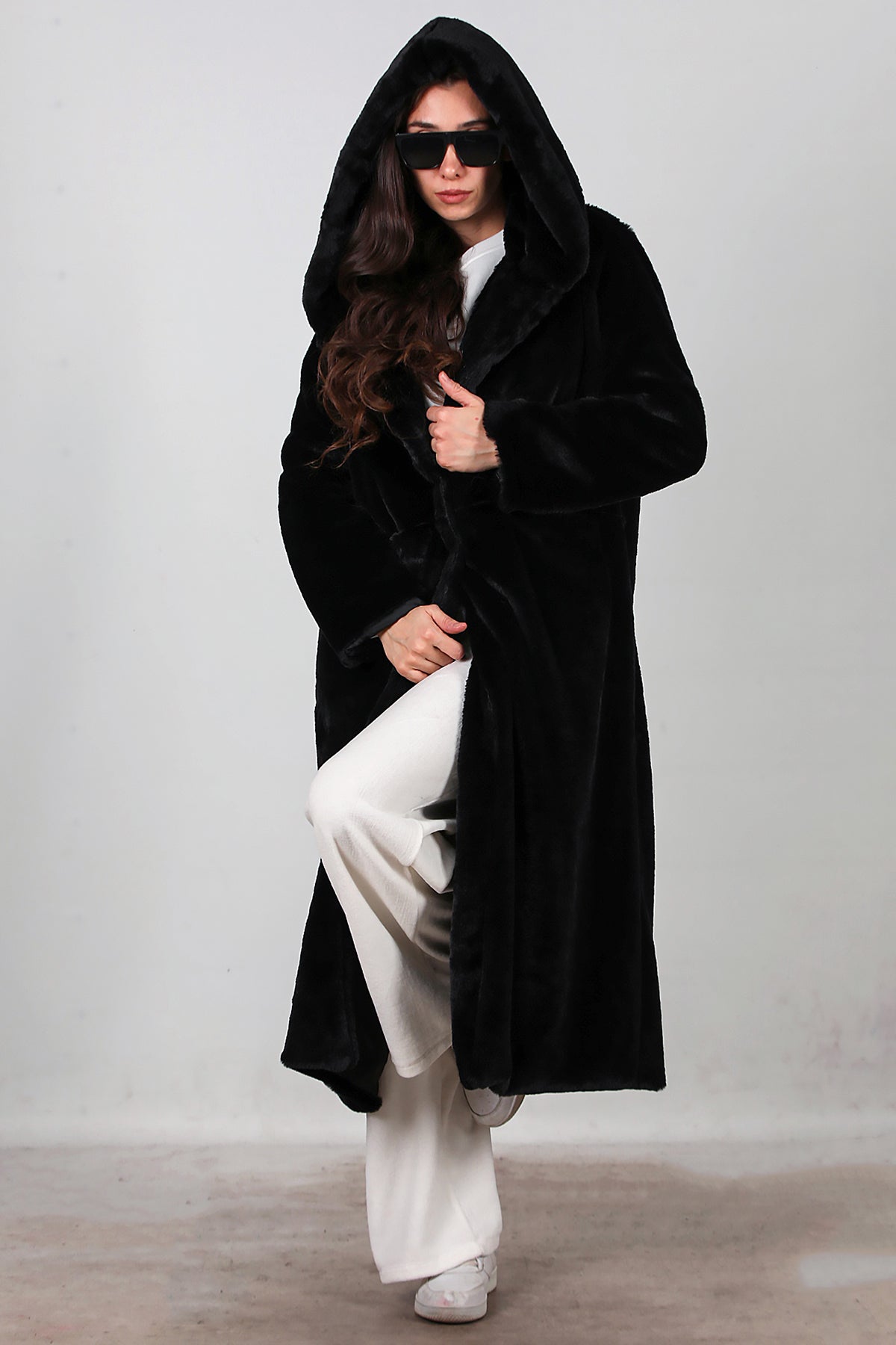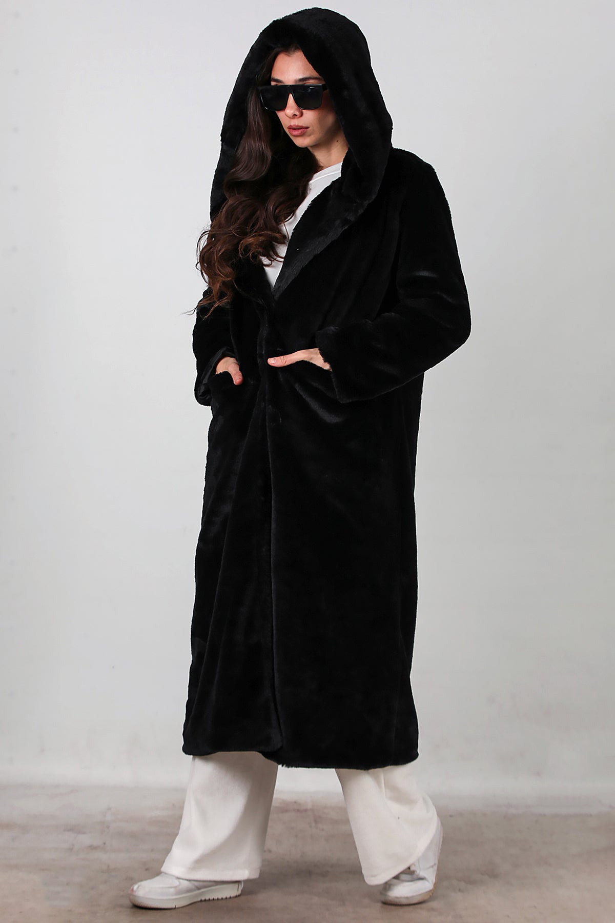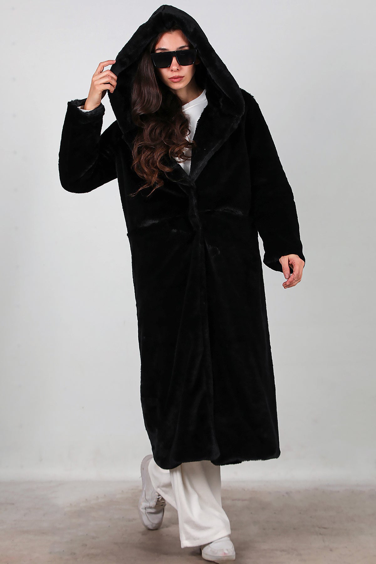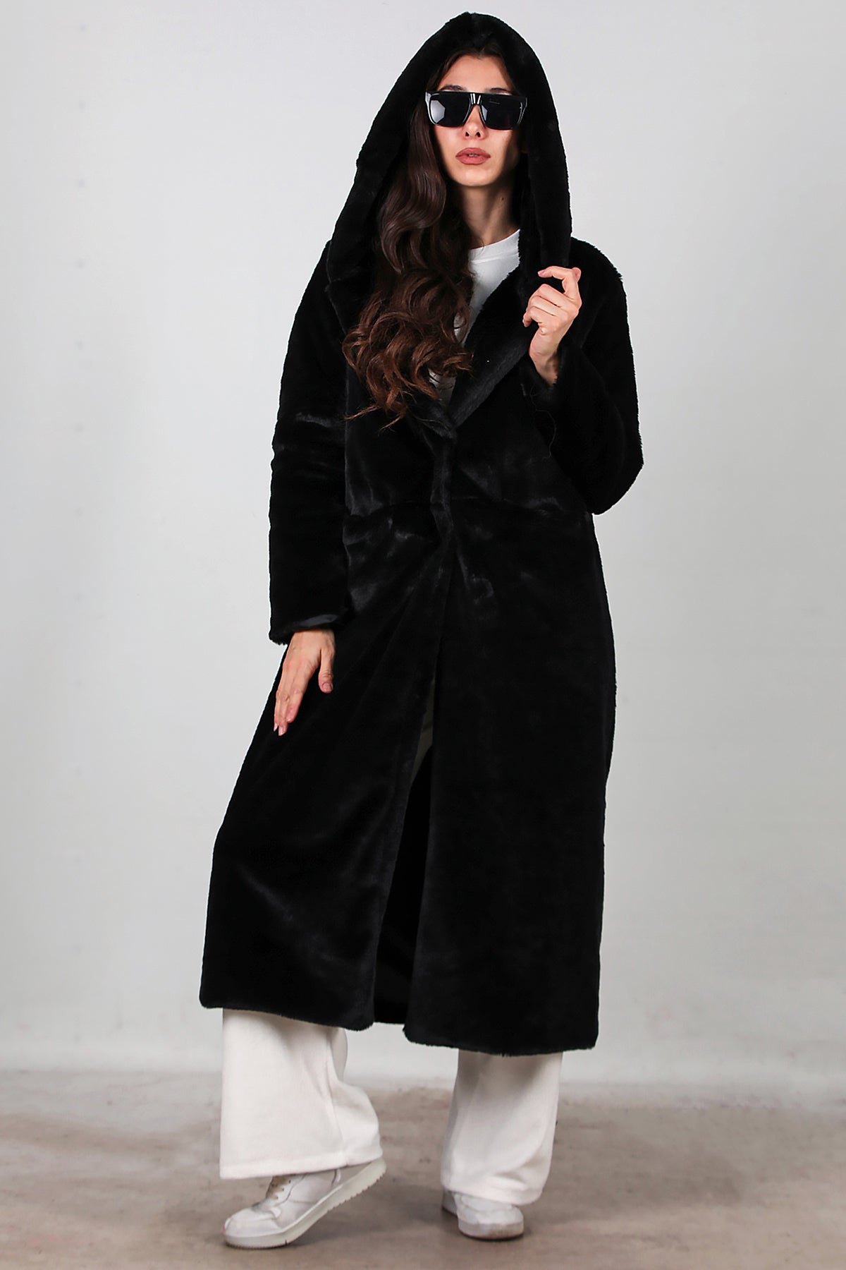 Kadın Kapşonlu Uzun Kürk Mont Siyah
