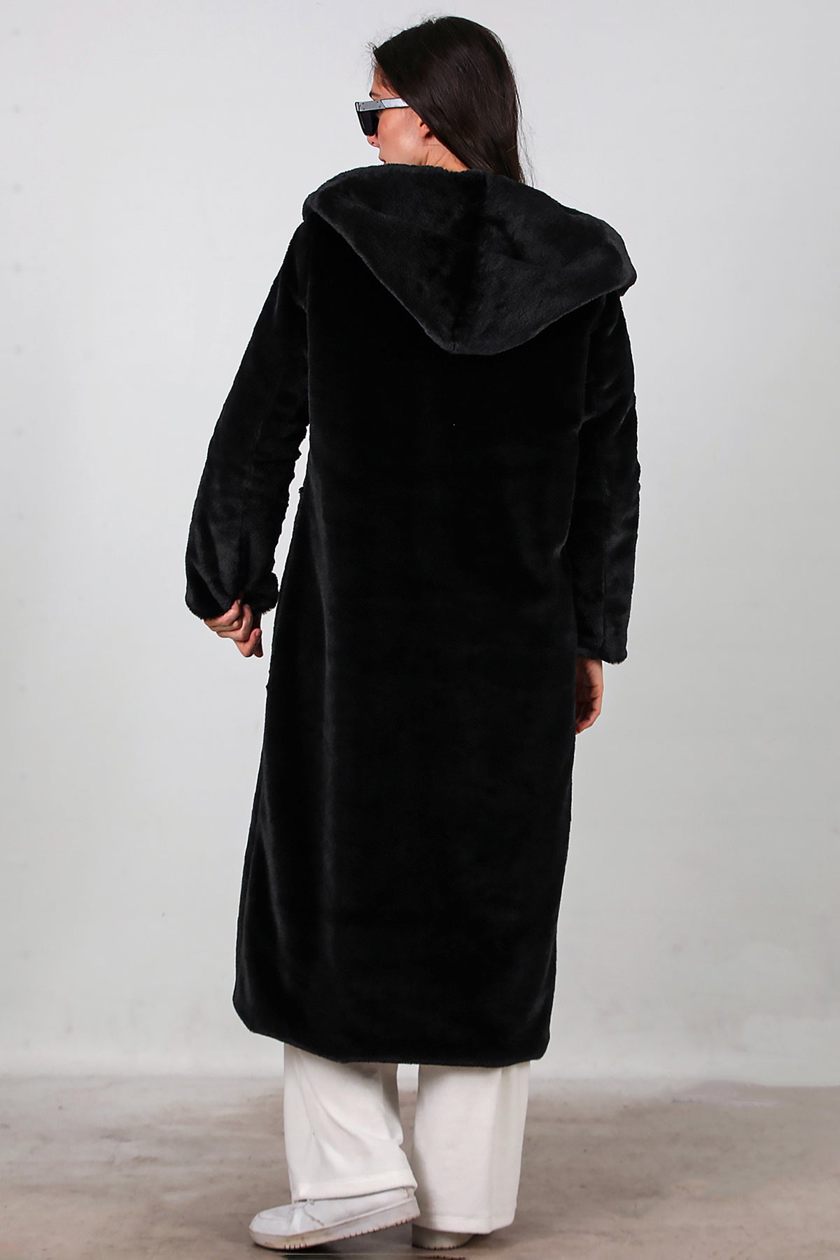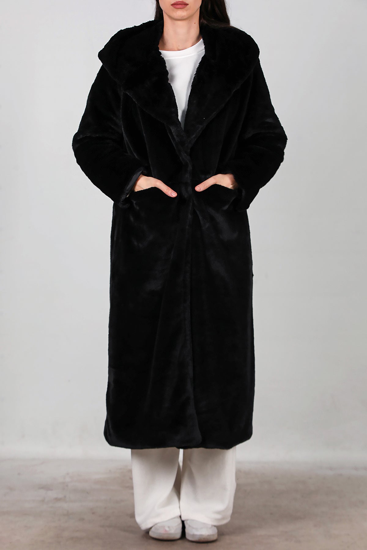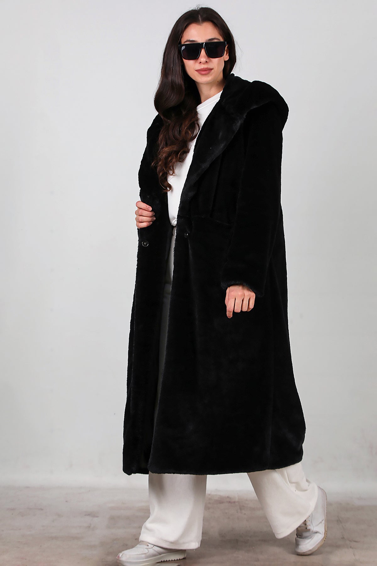 Kadın Kapşonlu Uzun Kürk Mont Siyah